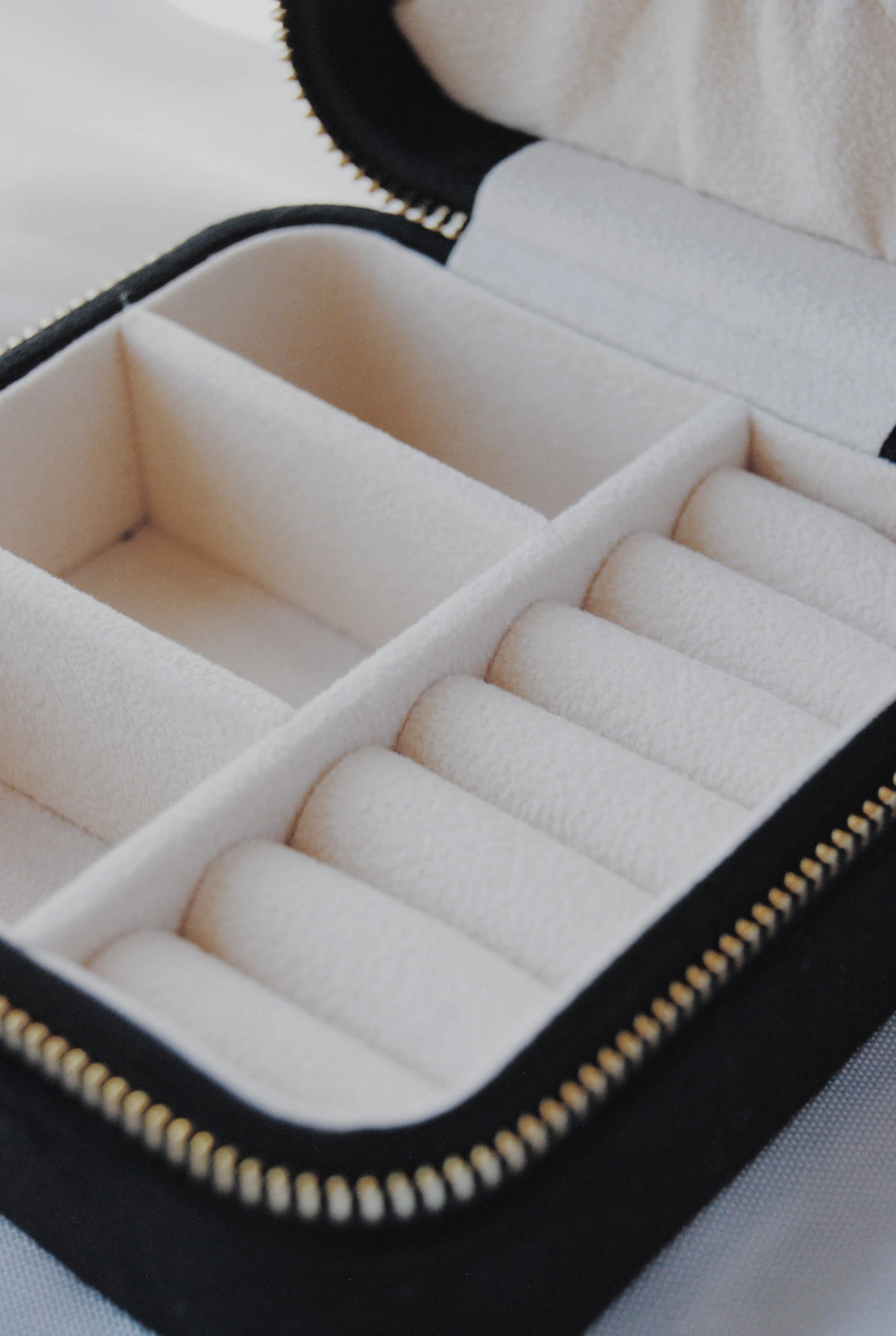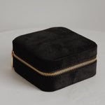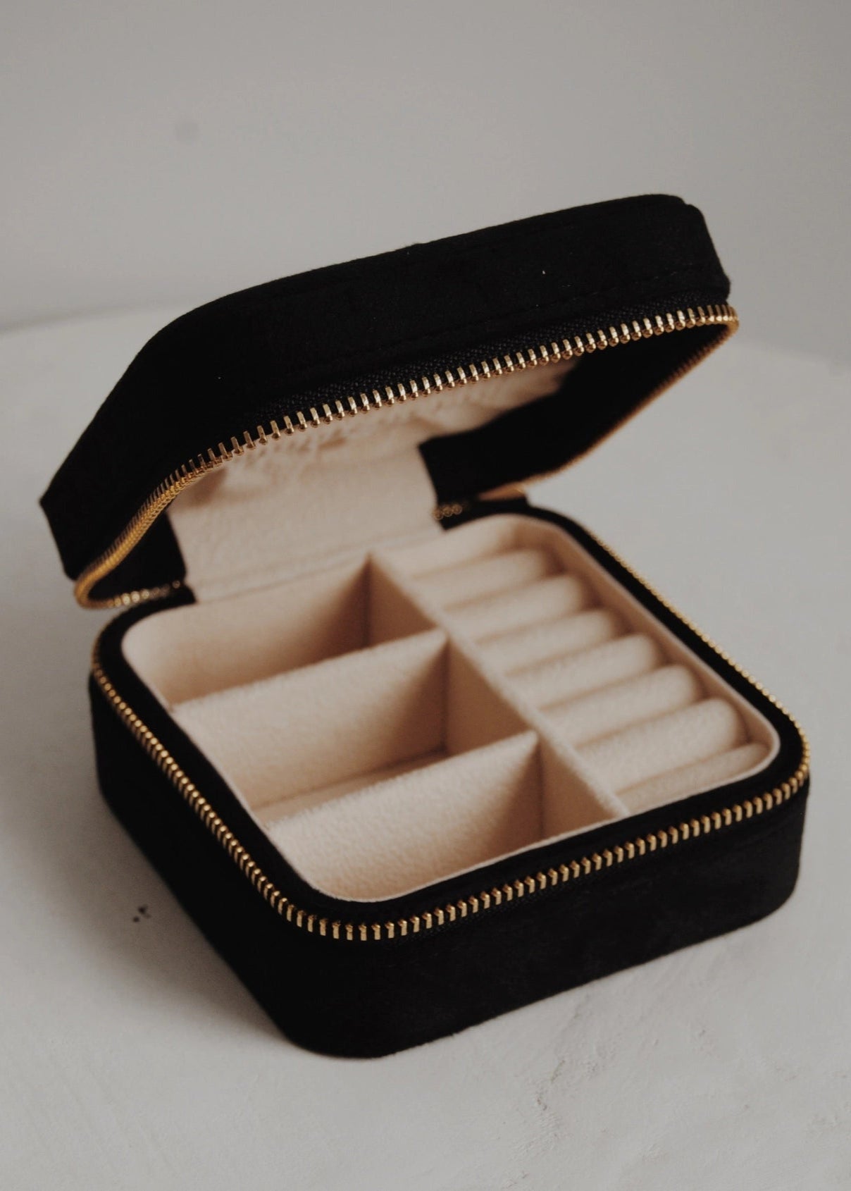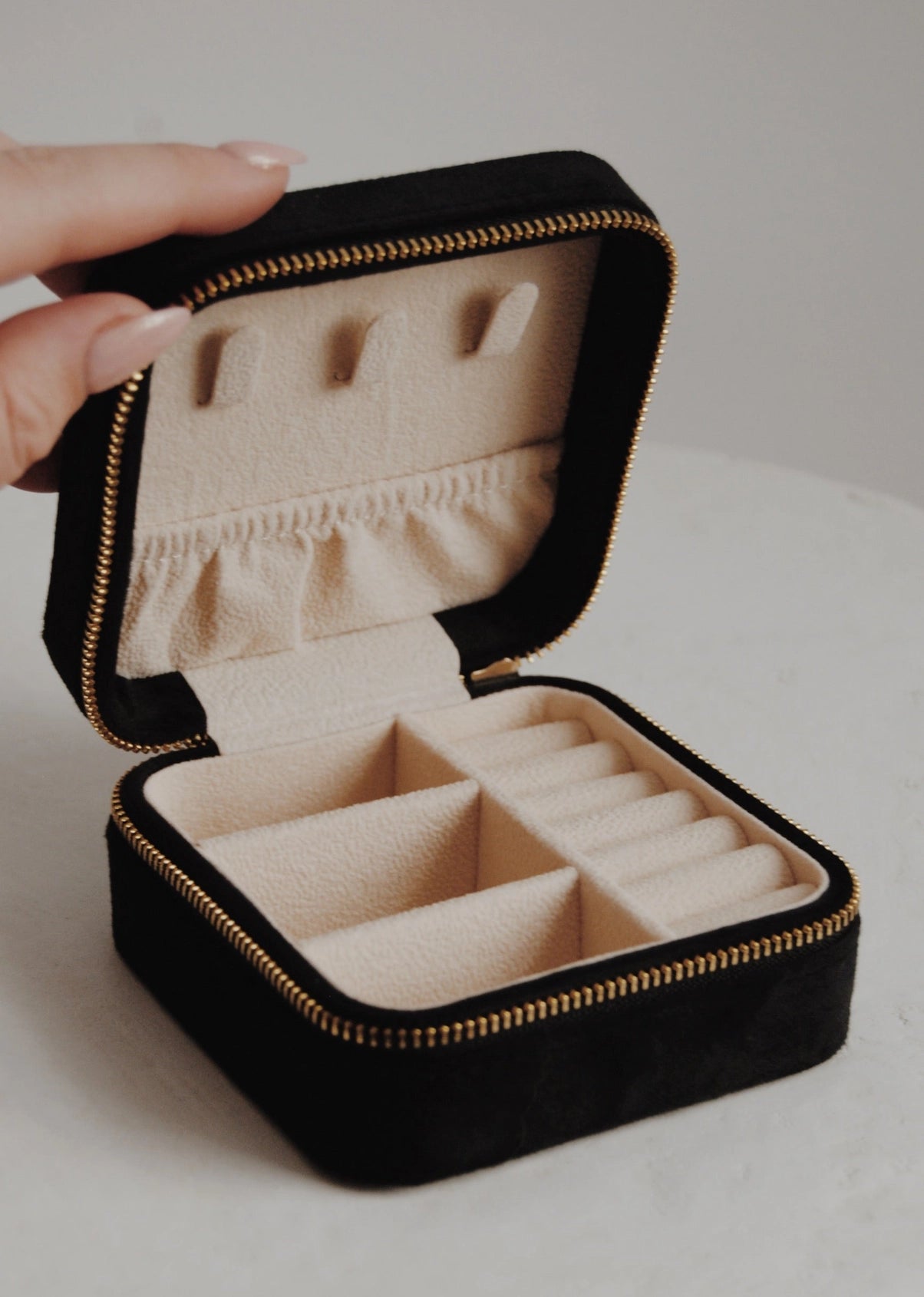 Square jewelry box with velveteen interior lining and velvet exterior. Interior includes necklace hooks, pouch, moveable dividers, and ring section.