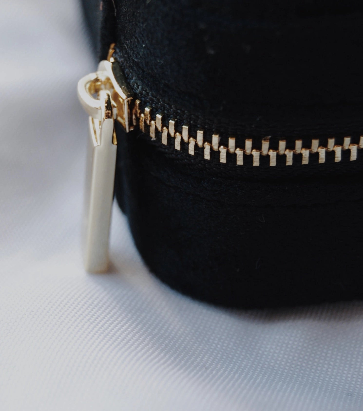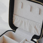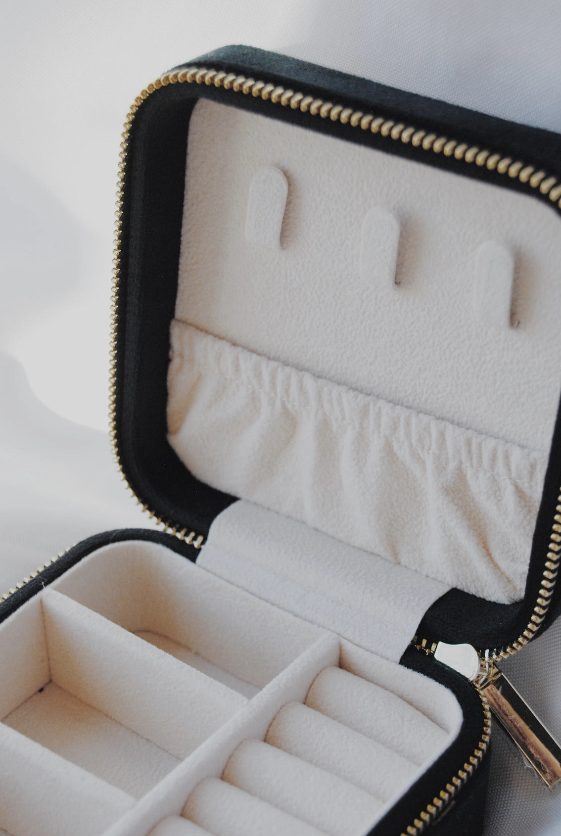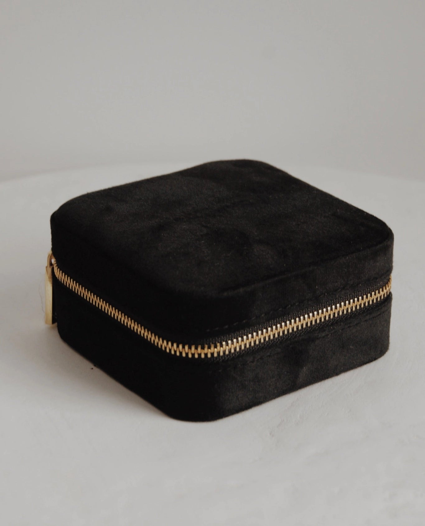Square jewelry box with velveteen interior lining and velvet exterior. Interior includes necklace hooks, pouch, moveable dividers, and ring section.