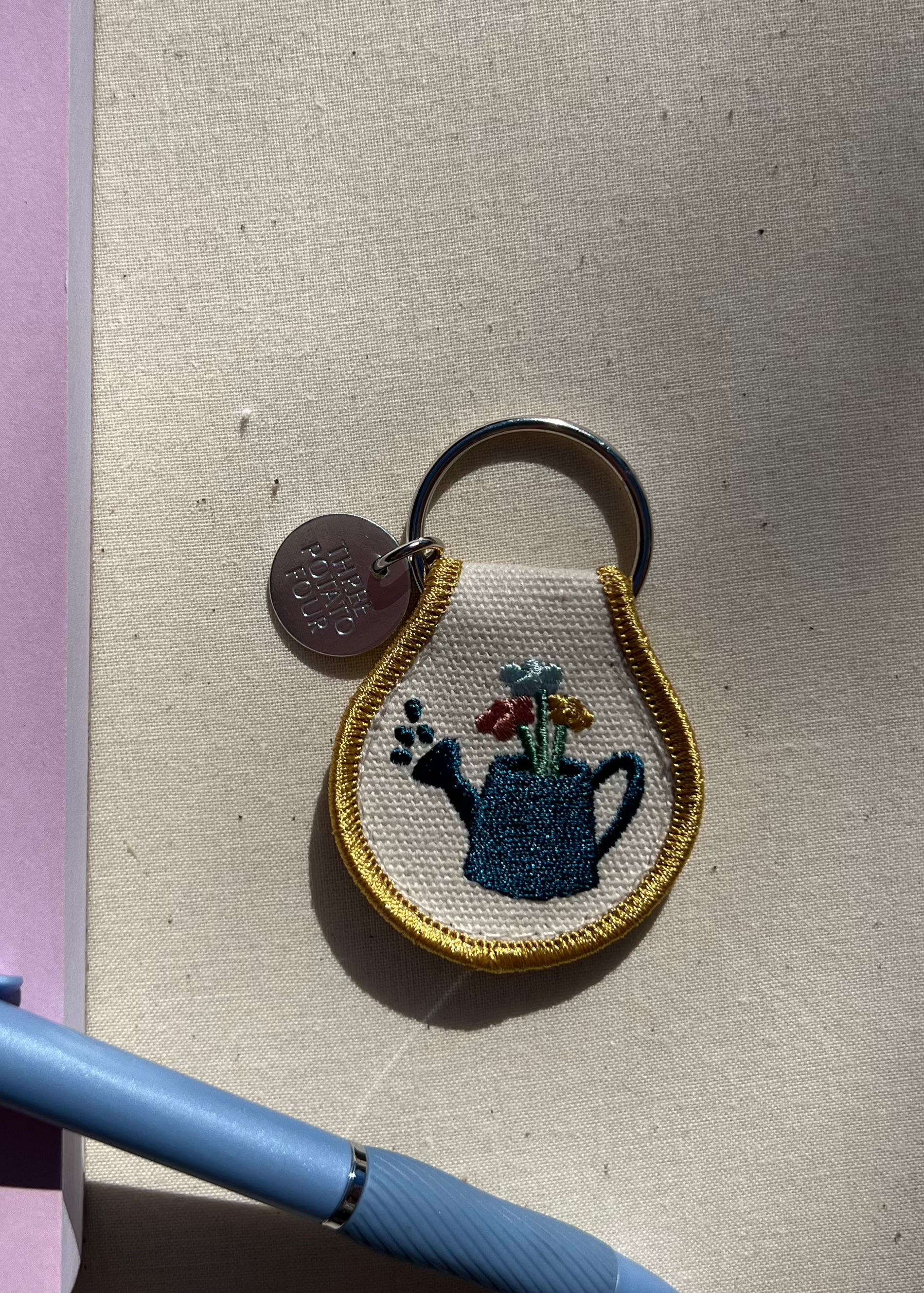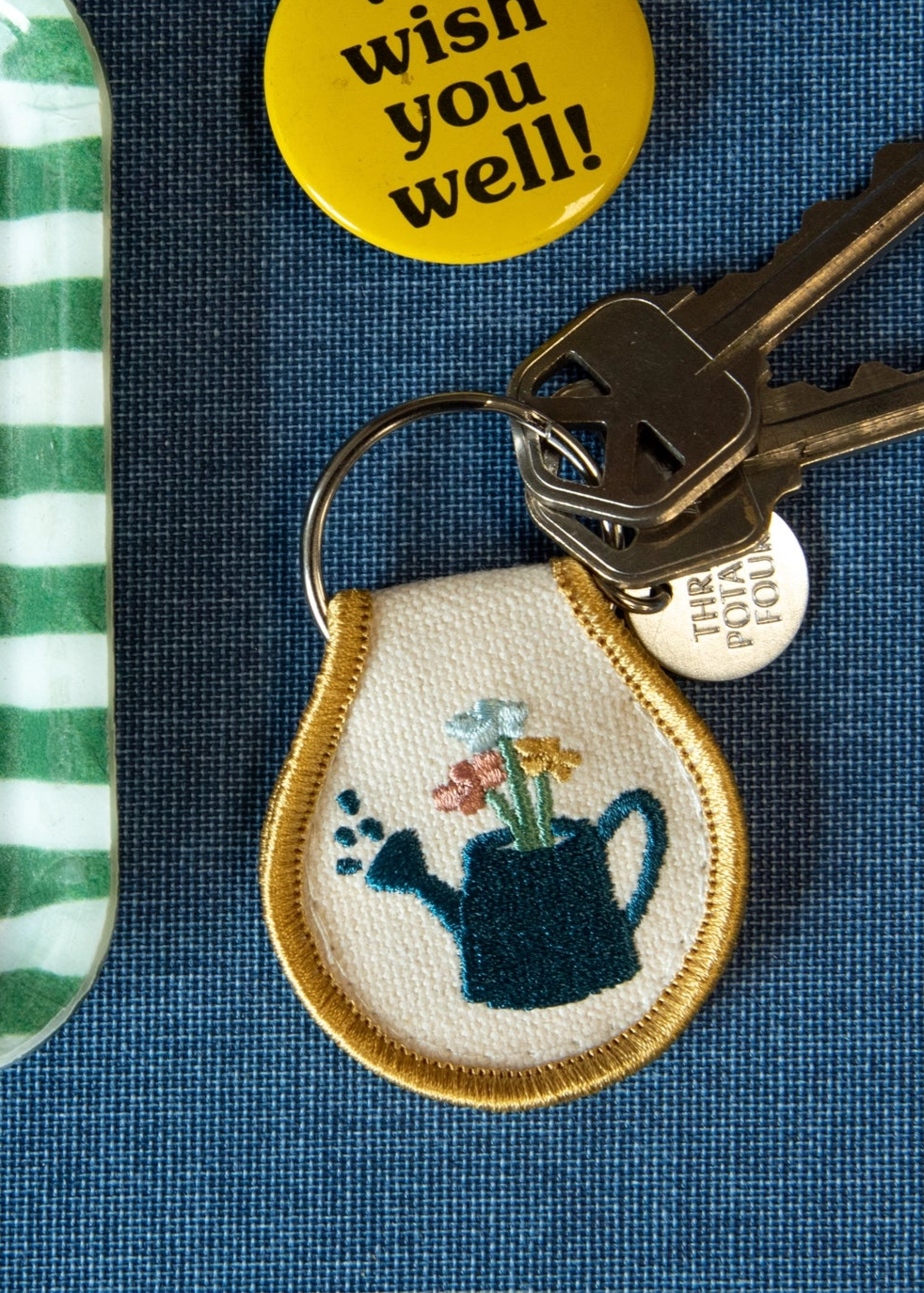 Super cute, double-sided, raised embroidered keychain with 3-dimensional watering can. Made with high-quality materials for a durable, long-lasting accessory.