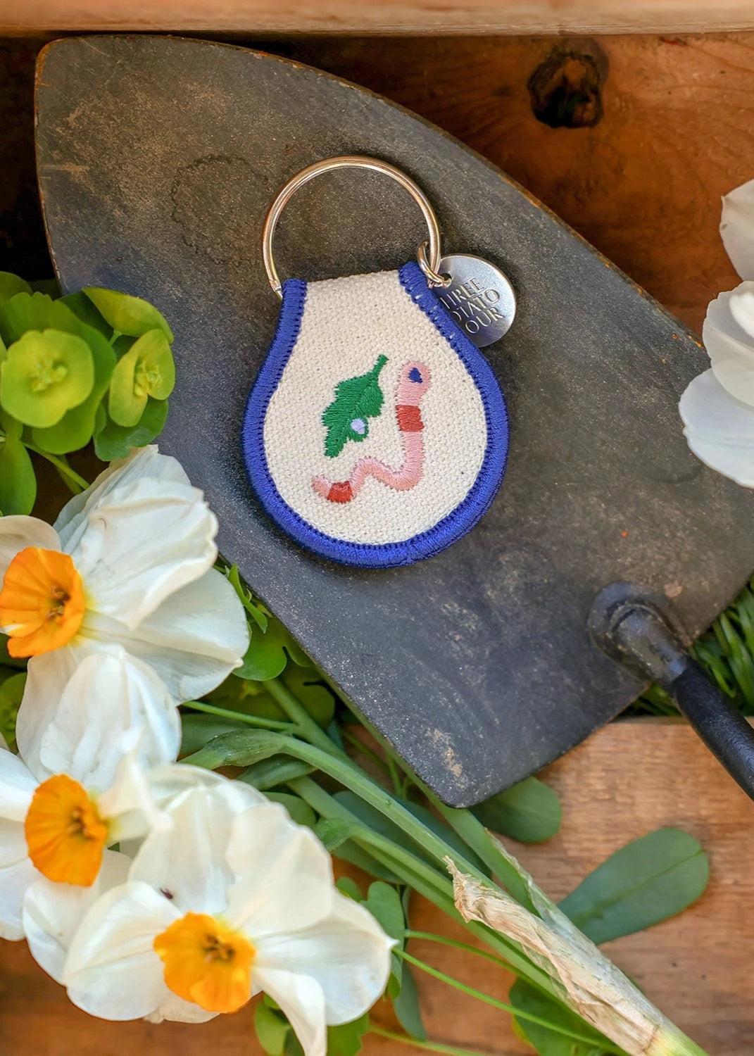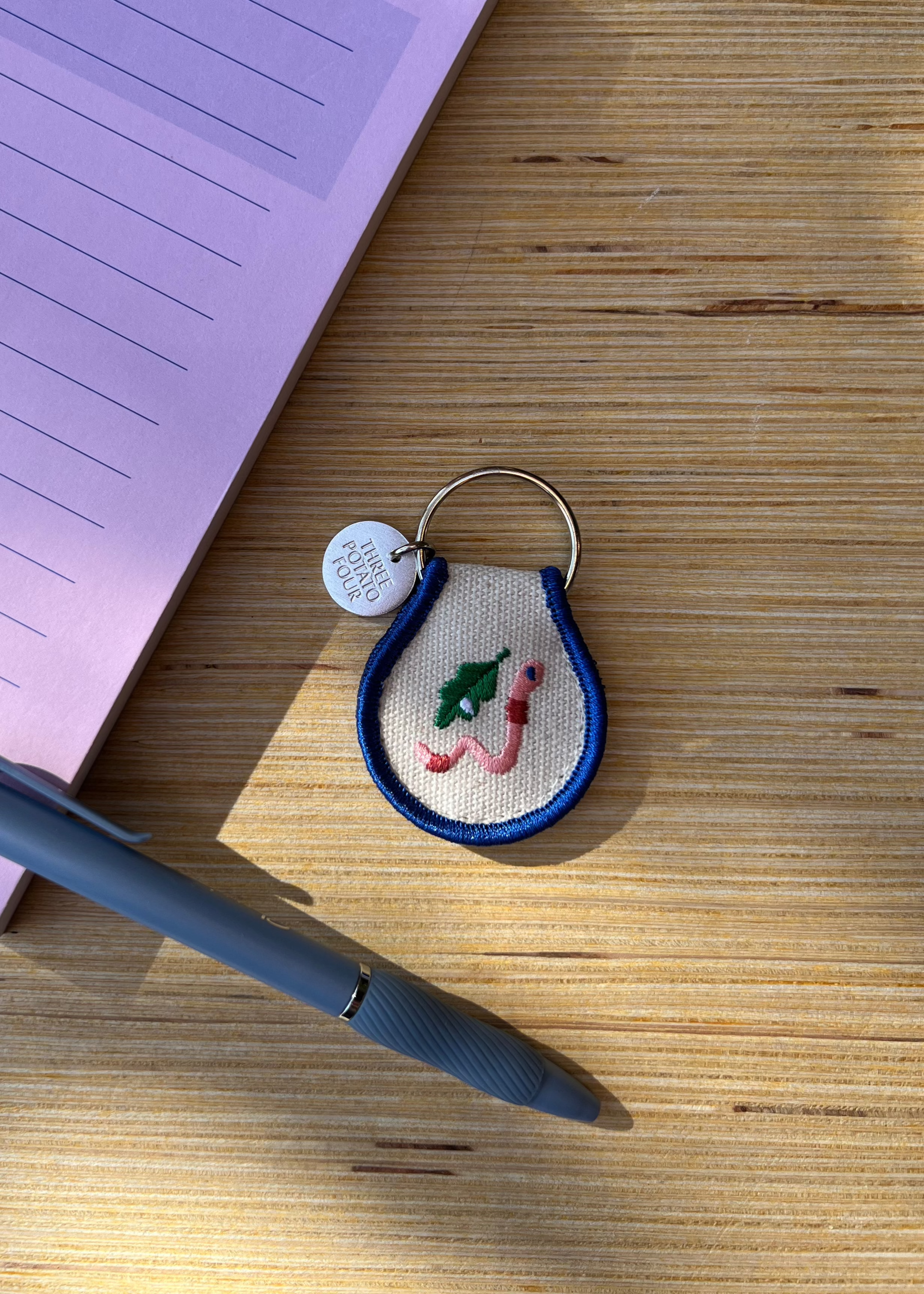 Super cute, double-sided, raised embroidered keychain with 3-dimensional worm. Made with high-quality materials for a durable, long-lasting accessory.