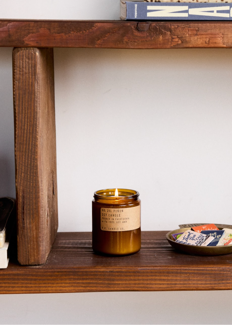 This Standard Candle is hand-poured into apothecary inspired amber jars with a signature kraft label and a brass lid. This size is meant for dressers, countertops, nightstands – basically everywhere. Scent of winters in the Southwest, lingering bonfires, wool jackets in rotation. Notes of piñon logs, cedar, and vanilla.