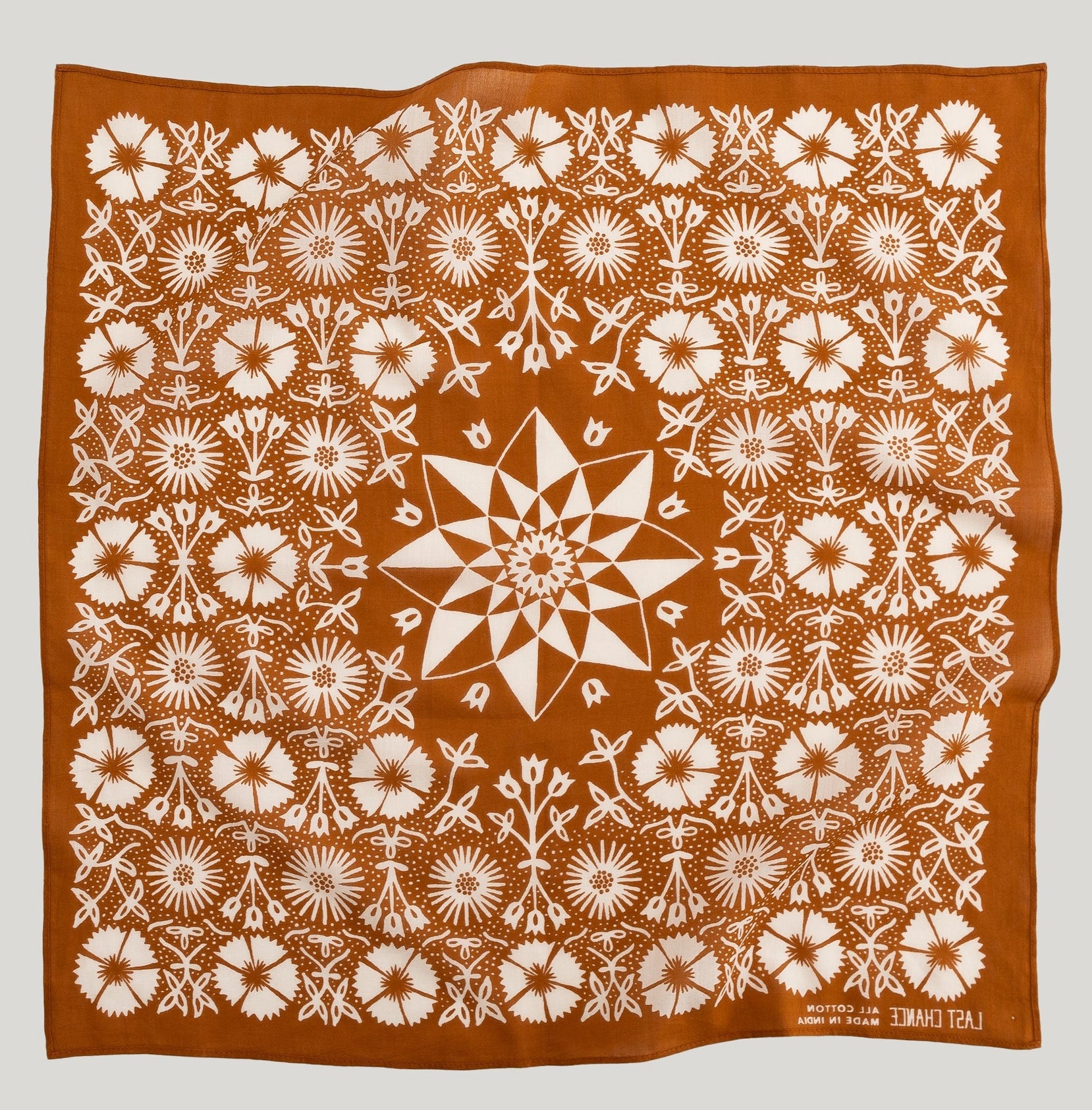 Pennsylvania Dutch Hex Stars inspire the medallion in the center of the Aster bandana, an auspicious symbol that brings luck to daily life and love. Surrounding this blessing is a field of flowers inspired by the Arts and Crafts movement. From the turn of the 20th century, this decorative style was rooted in medieval, romantic, and folk influences.