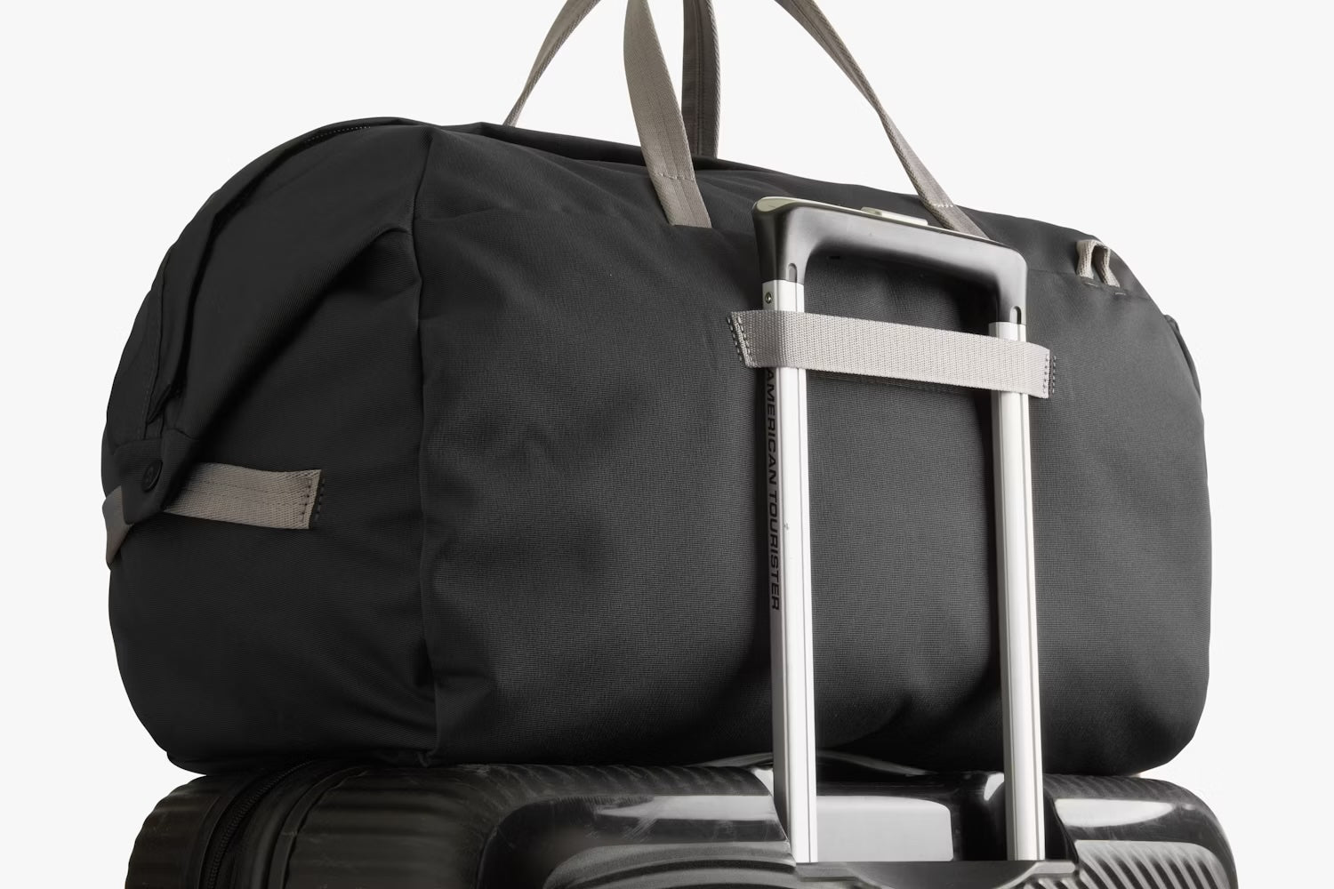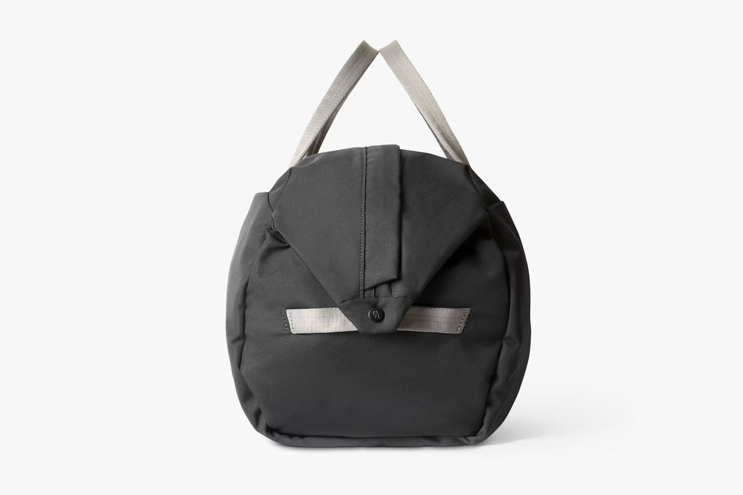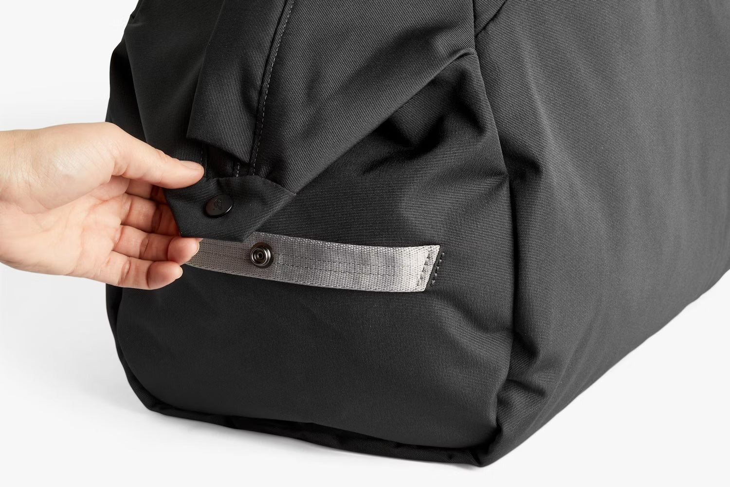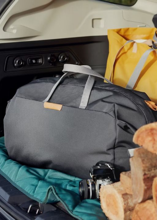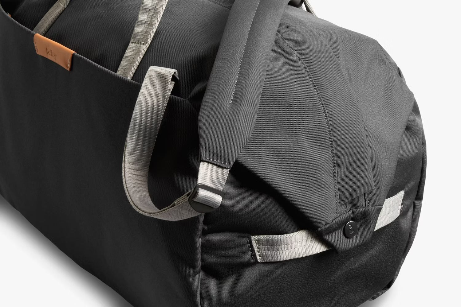 The Classic Weekender 45L Bag - Slate features a sleek barrel shape and convenient snap-down ends for easy wide-mouth packing. It also includes an external quick-access pocket with a key clip, internal slip pockets, a raised mesh zip pocket for valuables, strong rolled-edge webbing handles, grab loops at each end, a detachable padded shoulder strap, and a luggage pass-through. Additionally, a storm flap is included to protect the main zip.