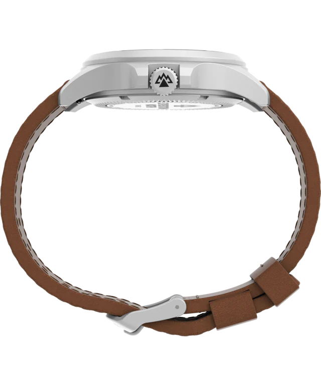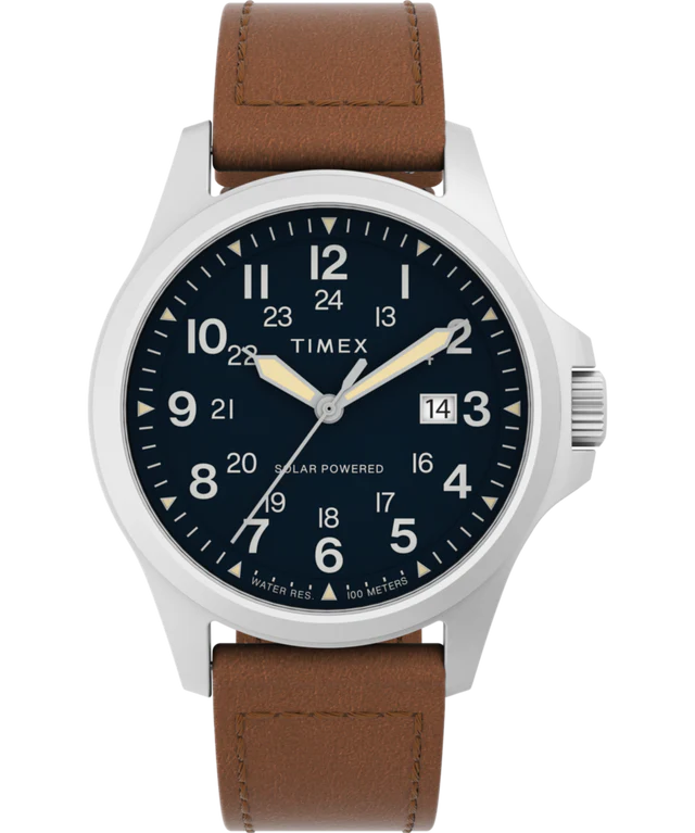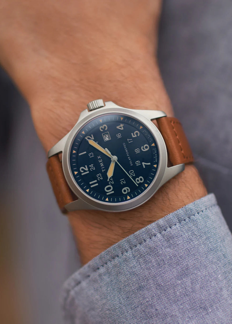Featuring a solar-powered movement that lasts up to 4 months and eliminates the need for battery changes, the Field Post 41 Solar is a military-inspired outdoor watch made to accompany you anywhere. It also boasts an anti-reflective sapphire crystal, 100-meter water resistance rating and a screw-down case back and crown in a perfect 41mm case profile. And thanks to the luminescent hands and dial markings, the sun works overtime to make this watch legible in the dark. Equipped with a comfortable brown Ecco™ DriTan™ leather strap — made with eco-friendly methods, and crafted to last — this watch can stay on your wrist all the way to the top.