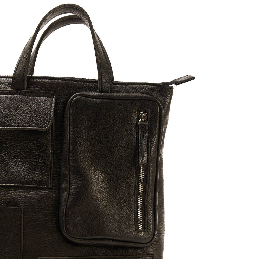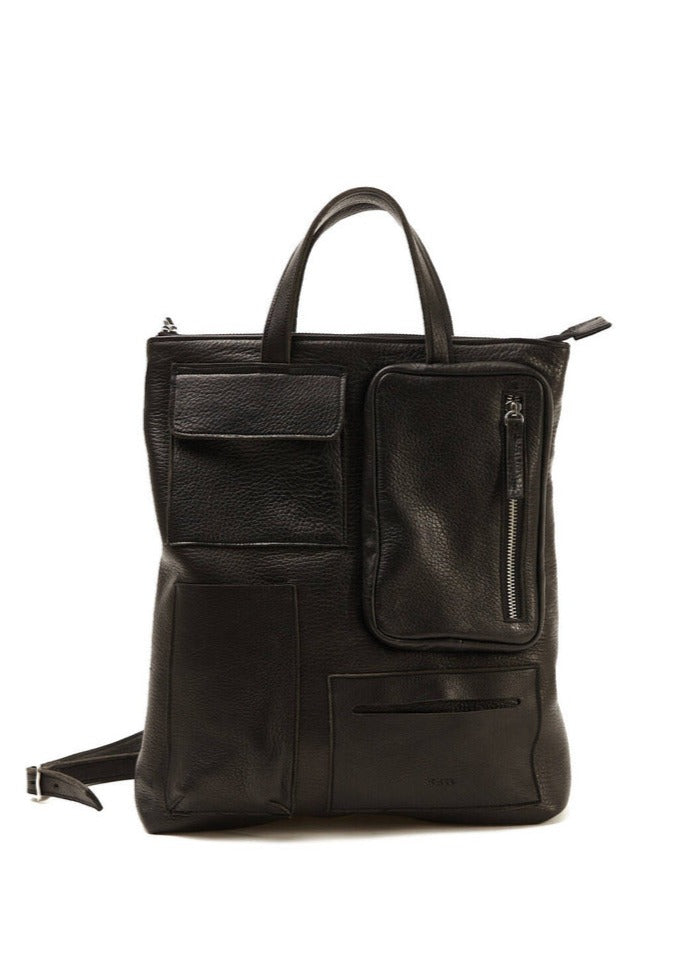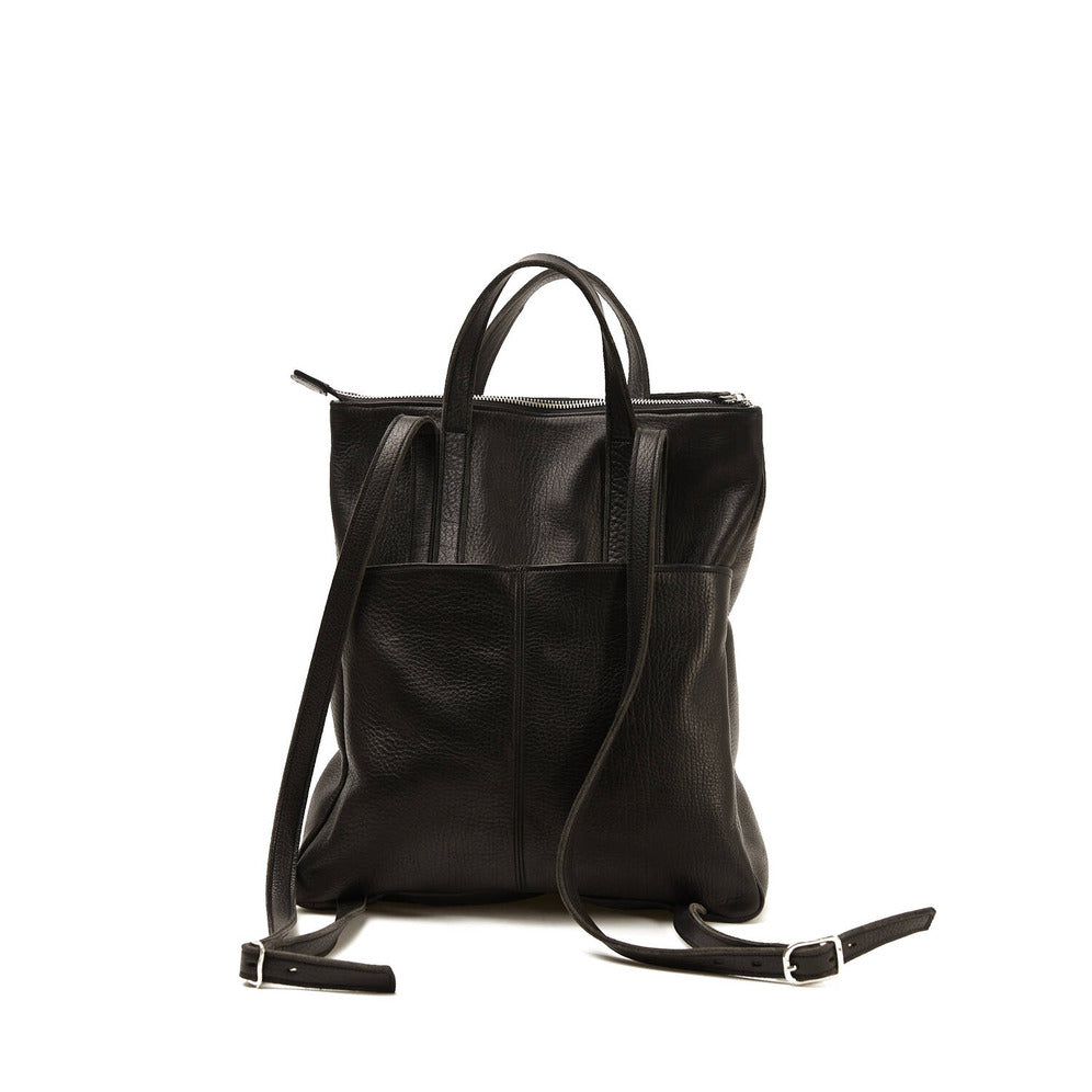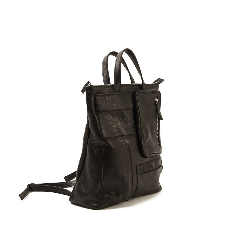 The most innovative and beautifully designed backpack does is exist. The cabernet backpack should hardly be called a backpack because of its sophistication and chicness. Constructed in natural grain, vegetable tanned black leather, it features four different size pockets in front, one big pocket on the back, division inside. Complete with adjustable straps and lined with printed fabric.