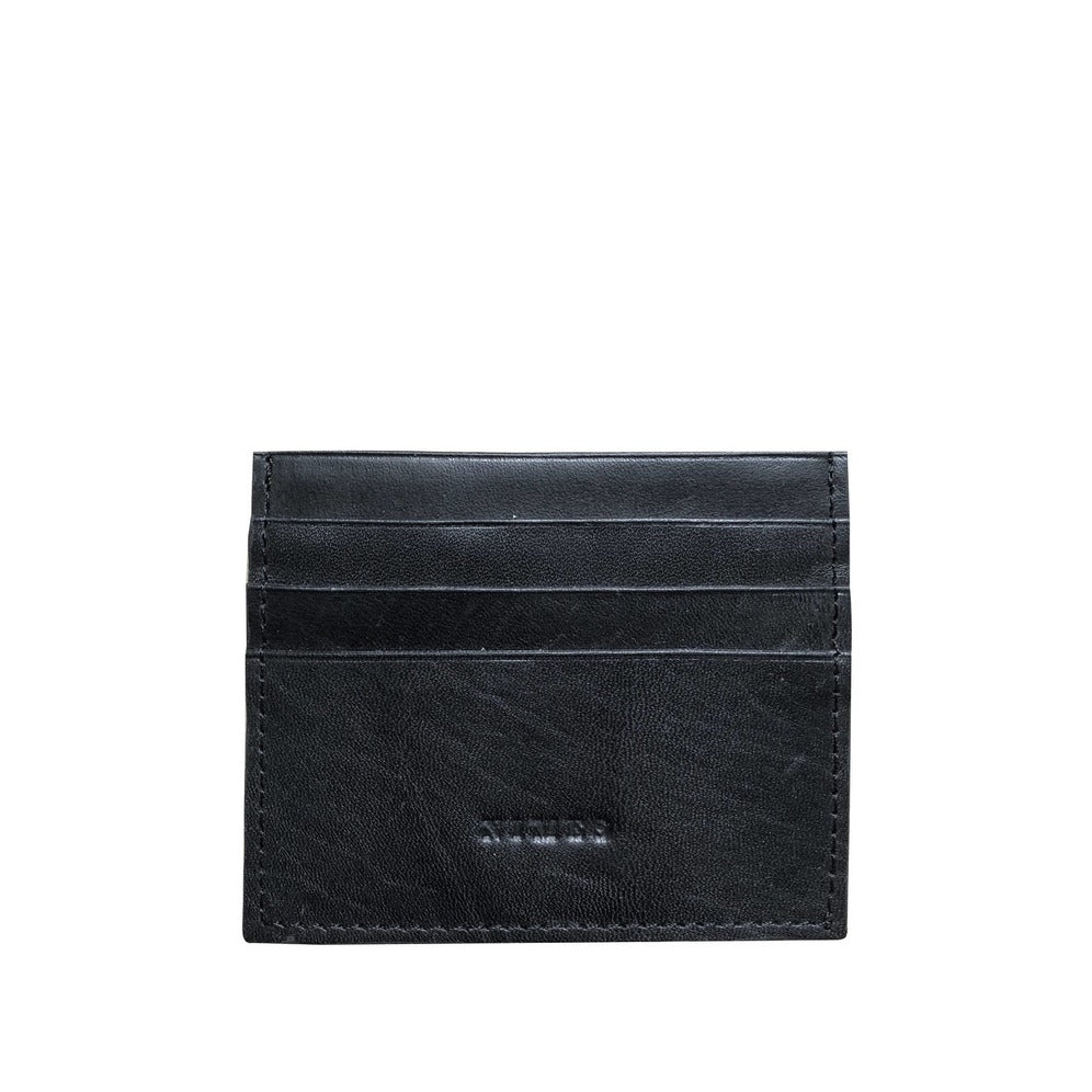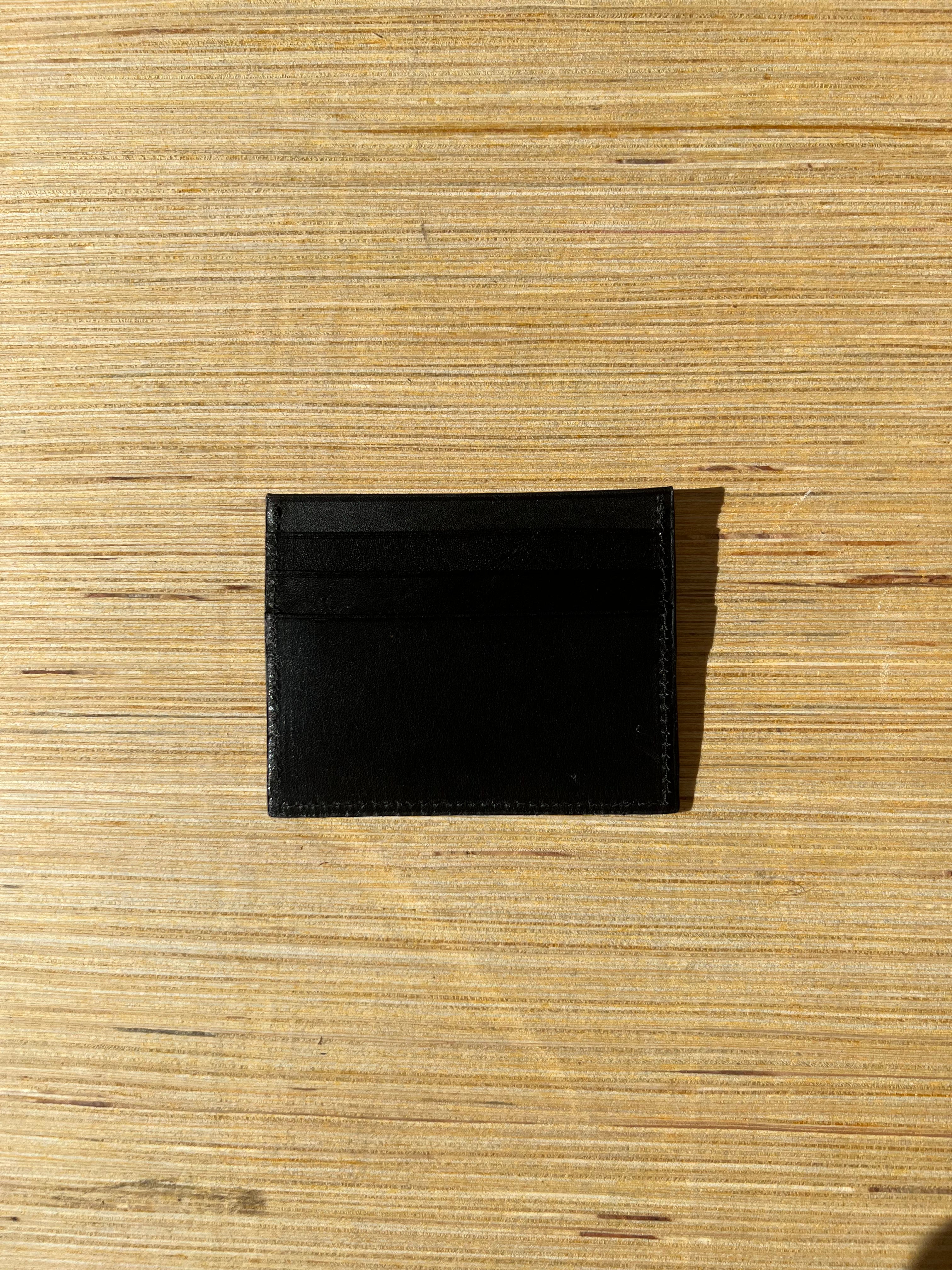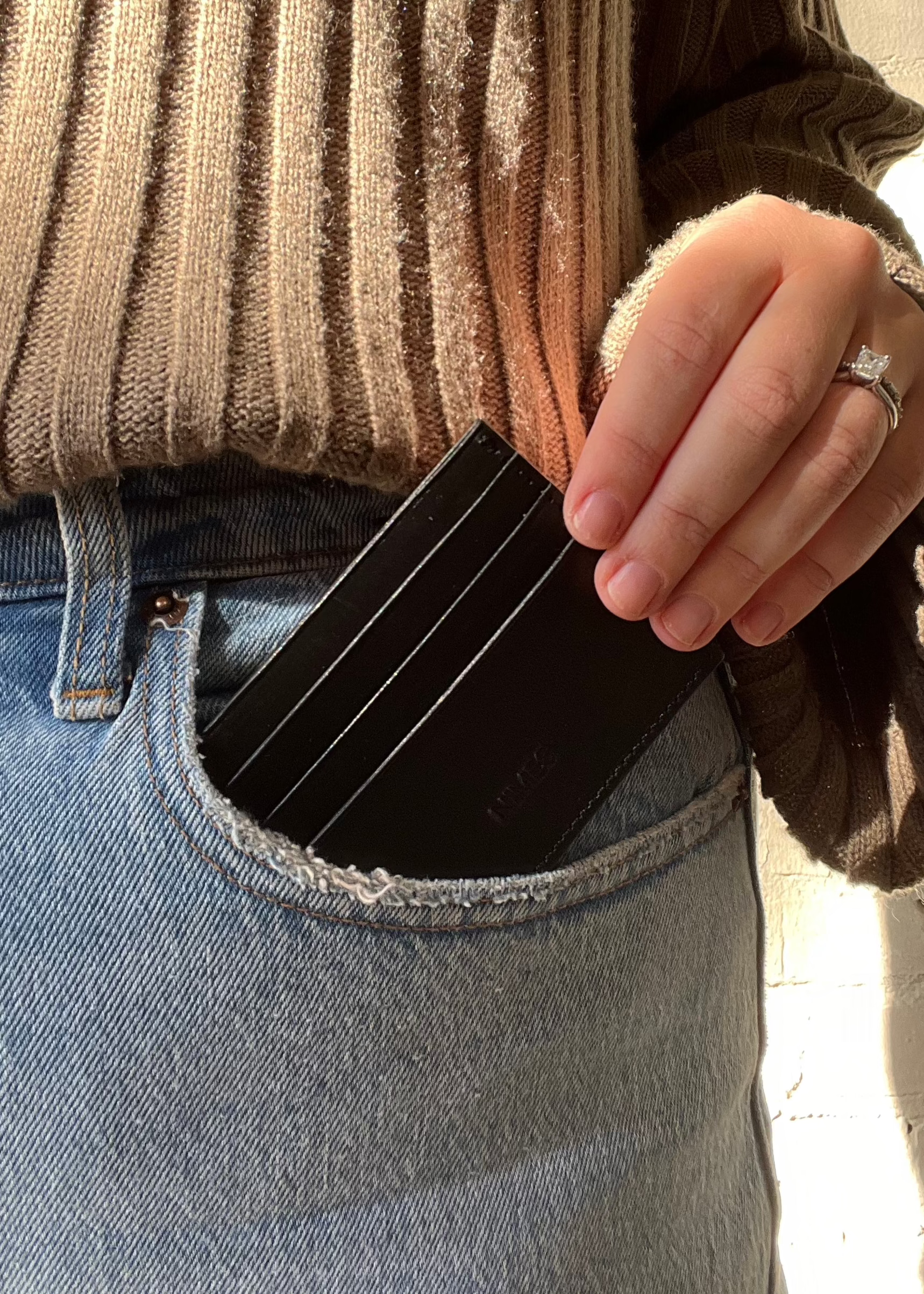 Sleek and simple, this leather card holder is an easy way to elevate your lifestyle. Hand made using vegetable tanned natural smooth black leather, it has one internal pocket and 3 credit card slots on each side, and is lined with printed fabric.
