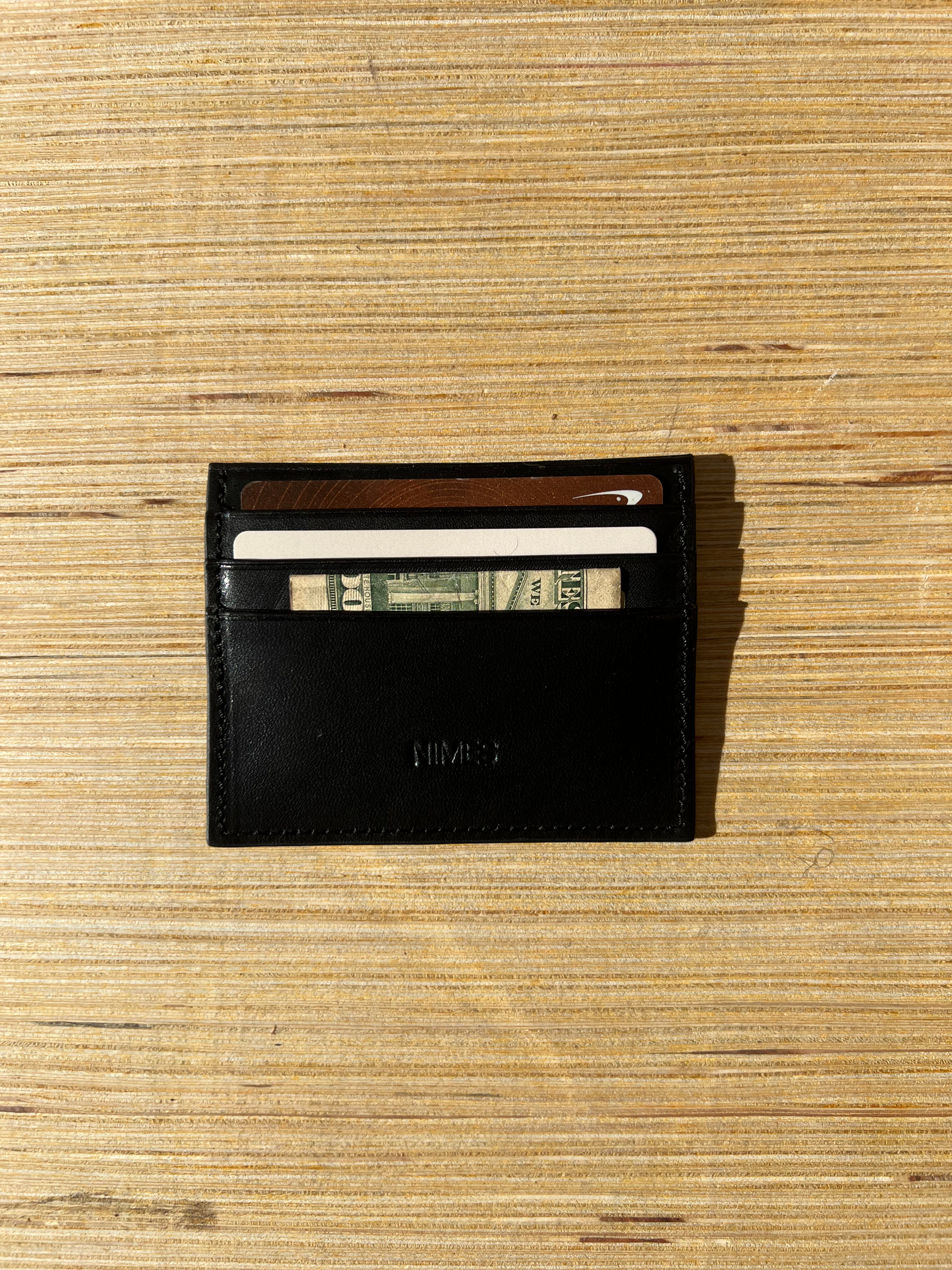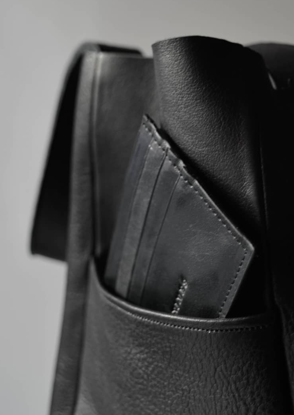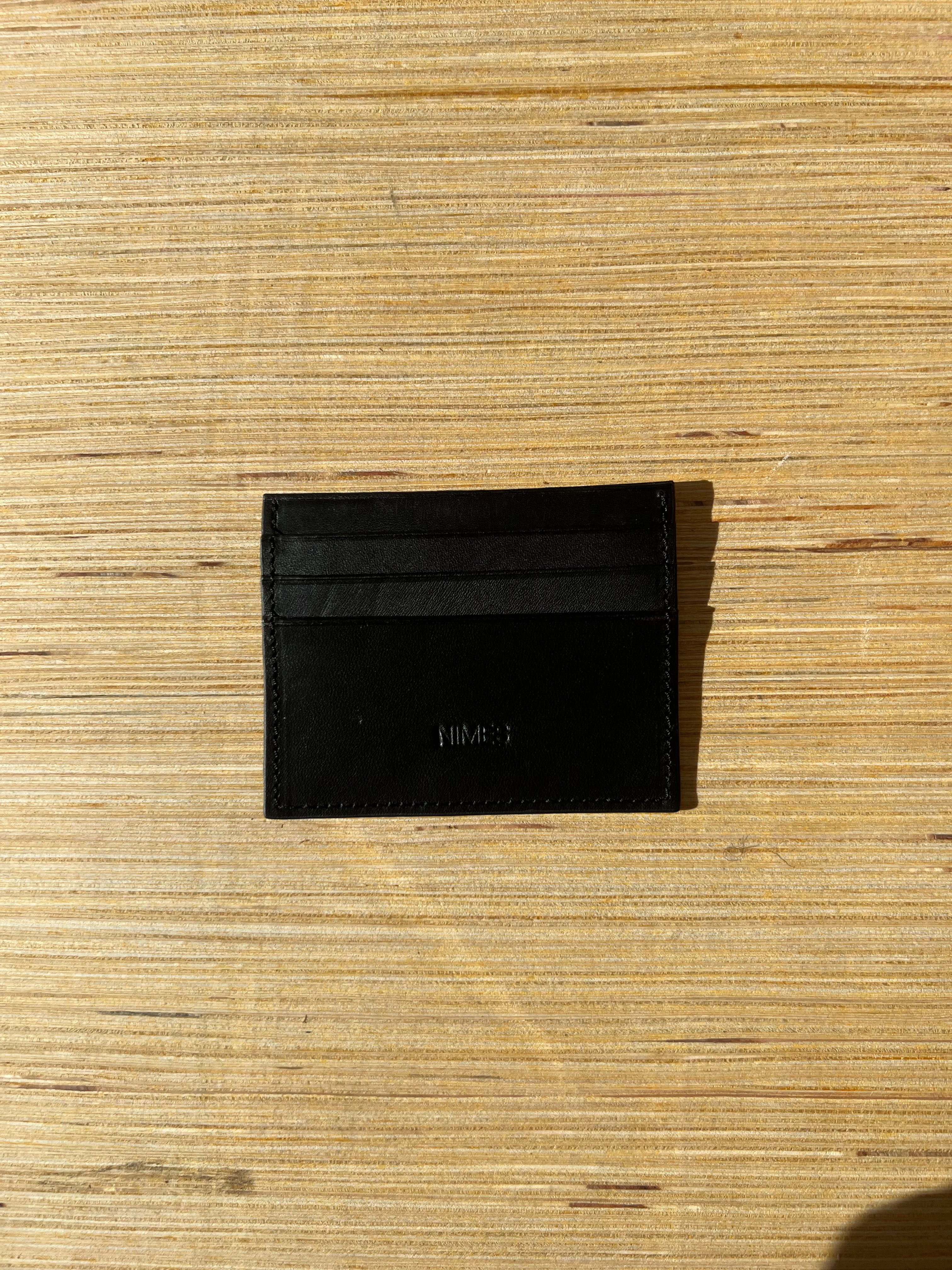 Sleek and simple, this leather card holder is an easy way to elevate your lifestyle. Hand made using vegetable tanned natural smooth black leather, it has one internal pocket and 3 credit card slots on each side, and is lined with printed fabric.