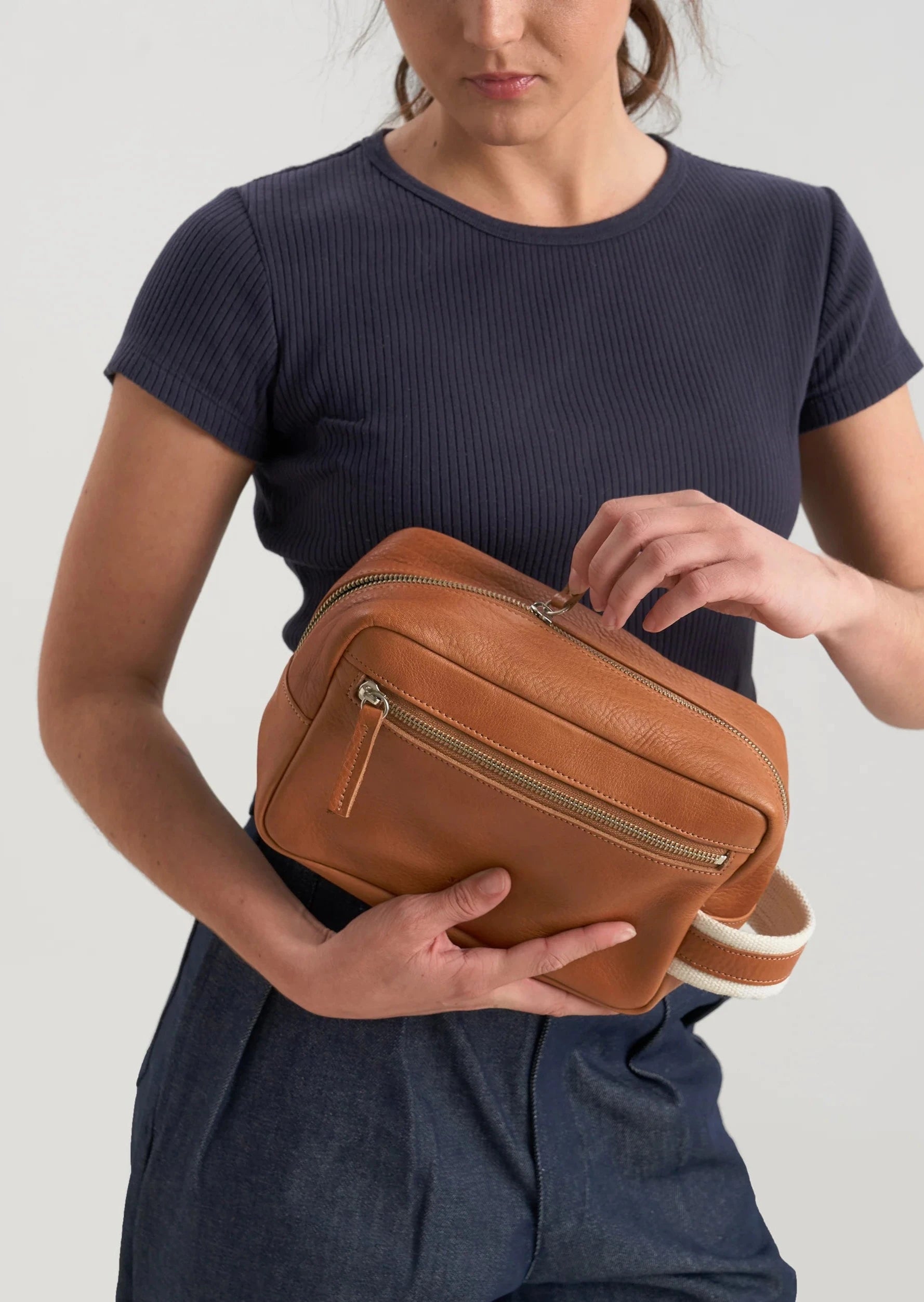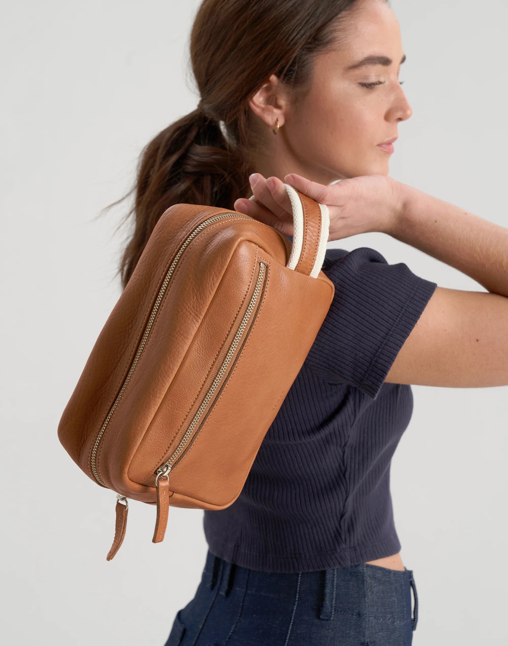 Travel in style with this smart toiletry bag made of natural, uncorrected leather. It's lined with striped fabric and has one external pocket and one internal one.