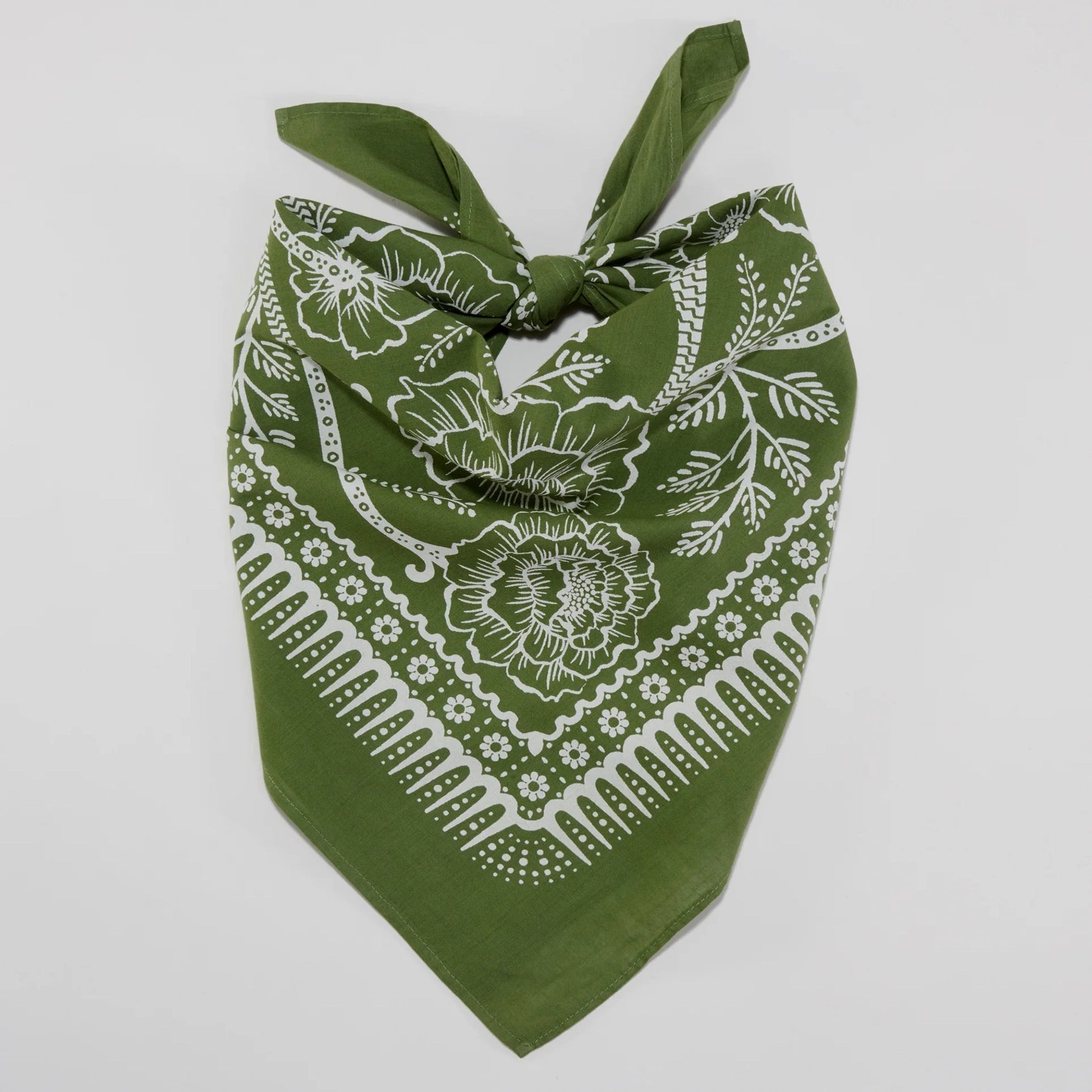 Rambling roses cover this soft cotton bandana dyed a muted green. Made with high-quality cotton. This is the perfect bandana to tie in your hair whether you're gardening at home or traveling the backcountry. Wear it as a reminder that wild beauty always comes with a few thorns.