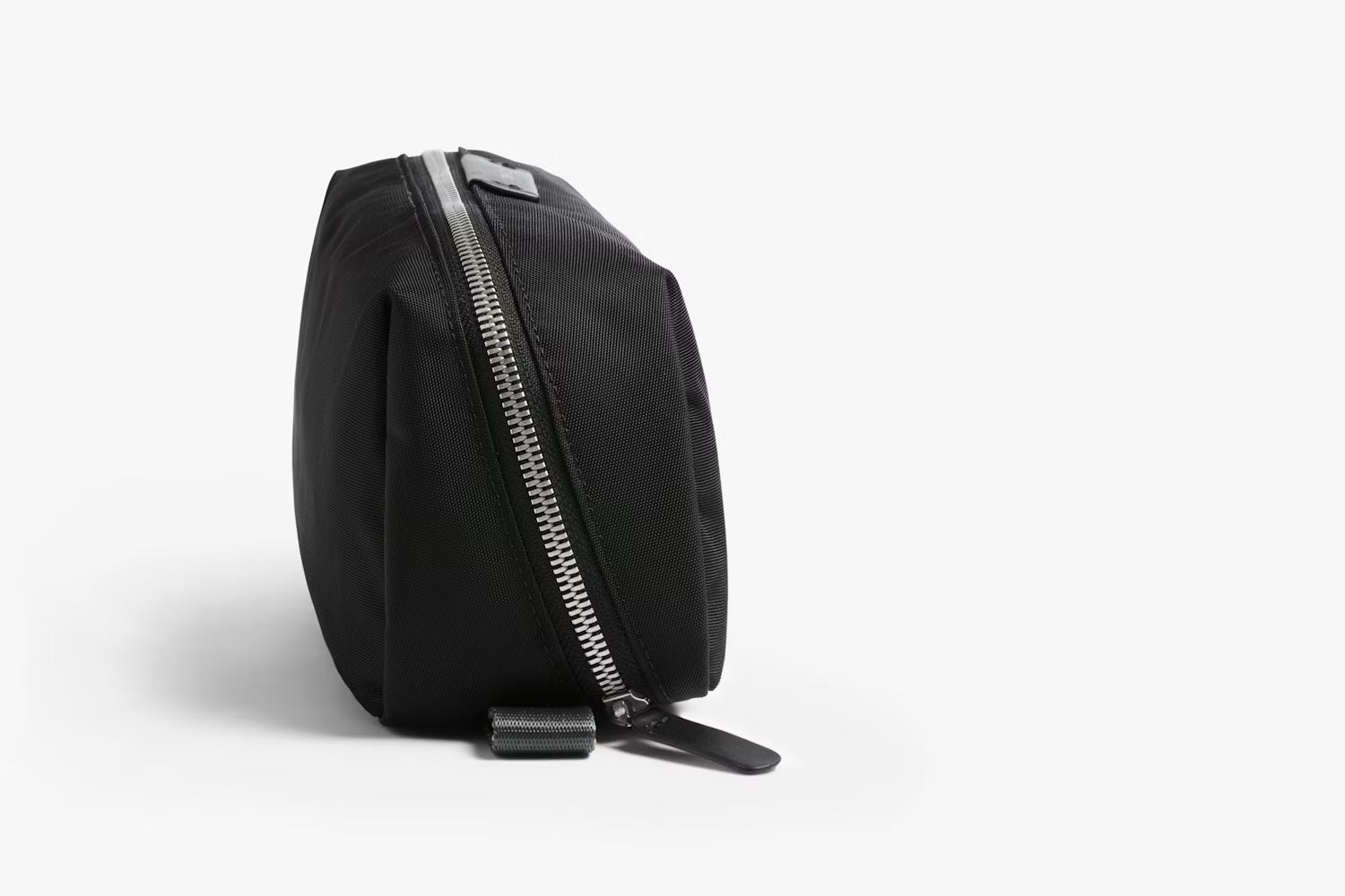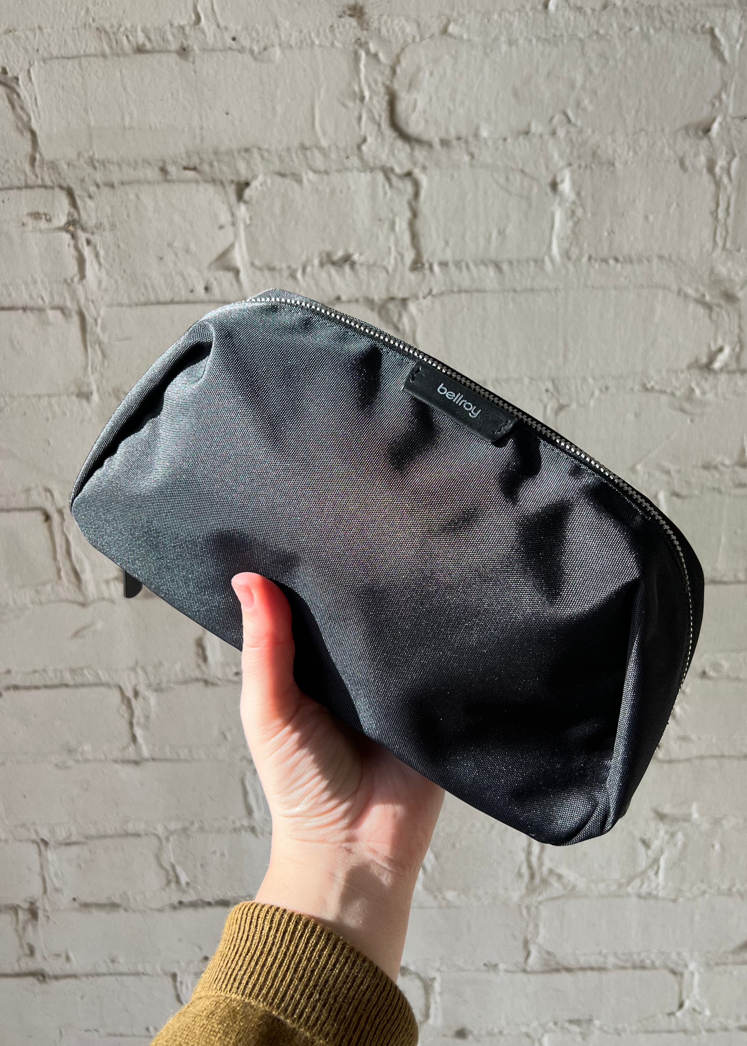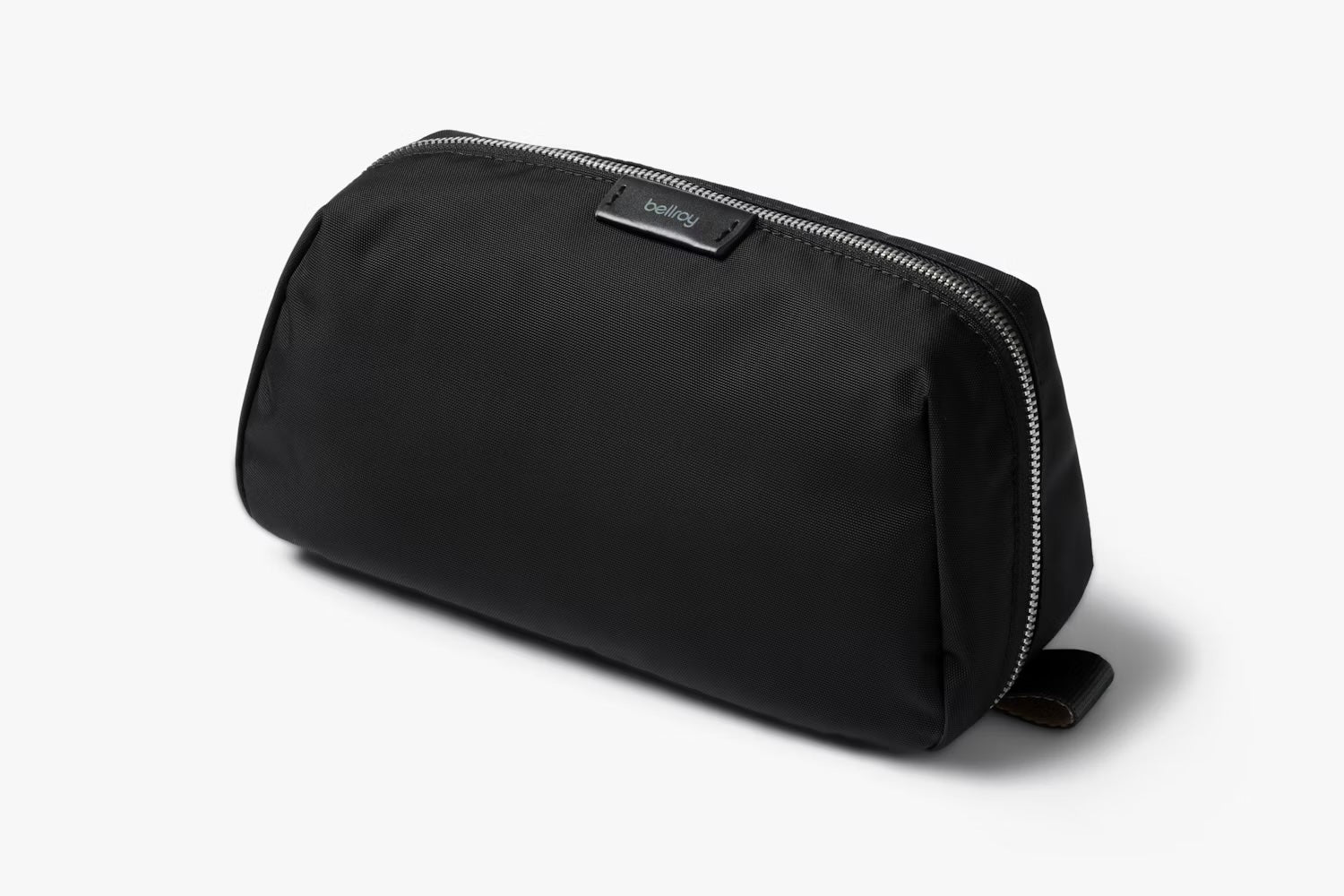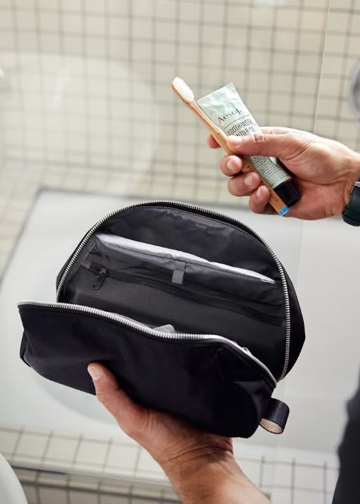 This toiletry kit is perfect for extended trips and larger products. With an angled zipper, you can easily access items without having to dig through the entire kit. The sturdy pocket keeps bottles organized and the stretchy mesh pockets can accommodate various small items. Keep loose items out of sight with the zip pocket, while the magnetic-closure shelf keeps your toothbrush separate. Soft grab loops allow for easy one-finger carry and removal from a deep bag. Plus, the water-resistant interior lining can be easily wiped clean. Made with durable, recycled fabric and premium, eco-tanned leather, this kit is built to last.