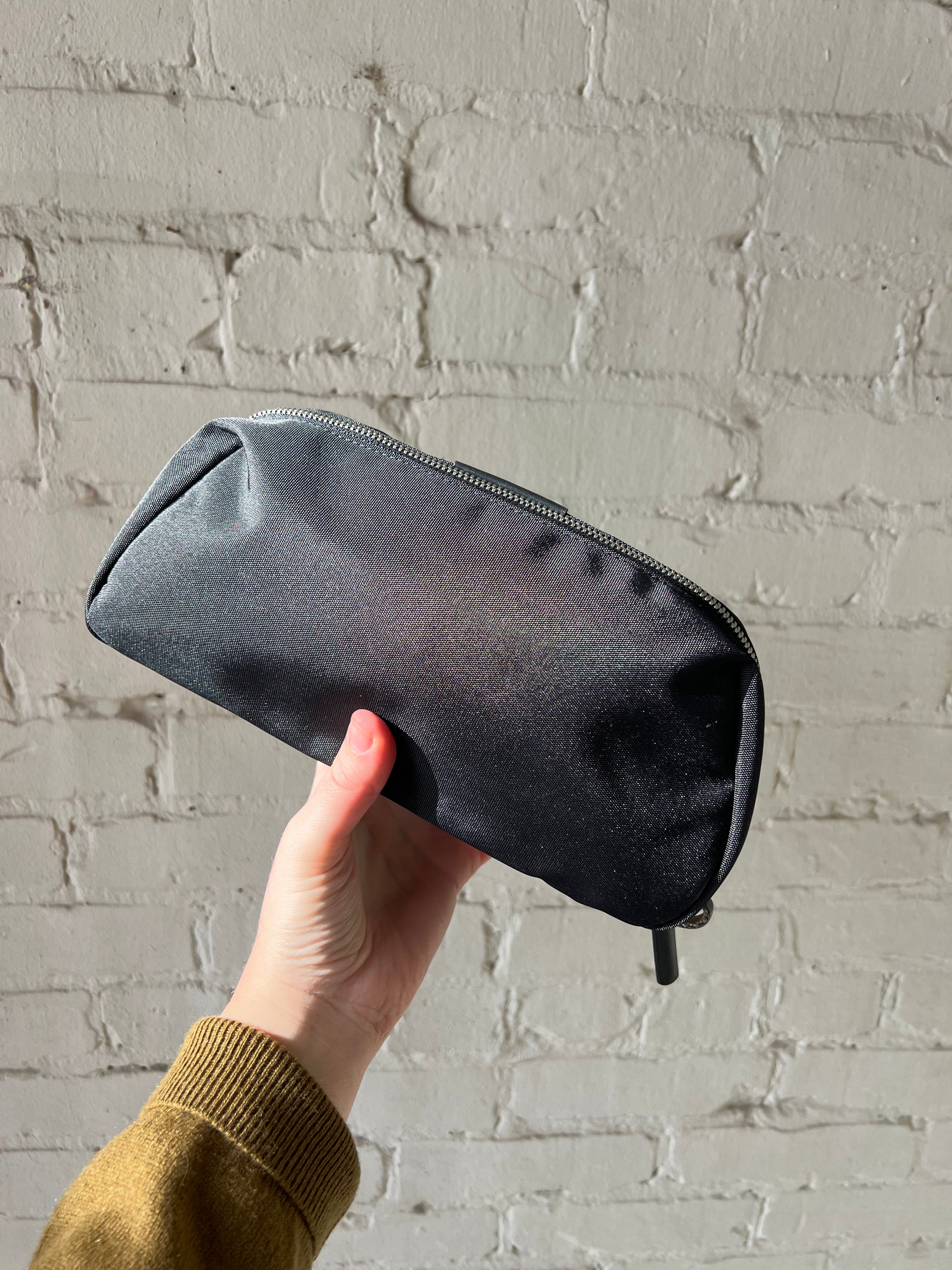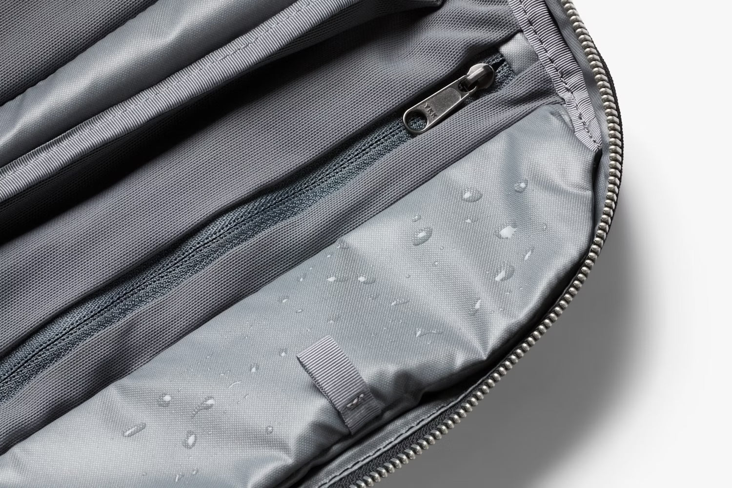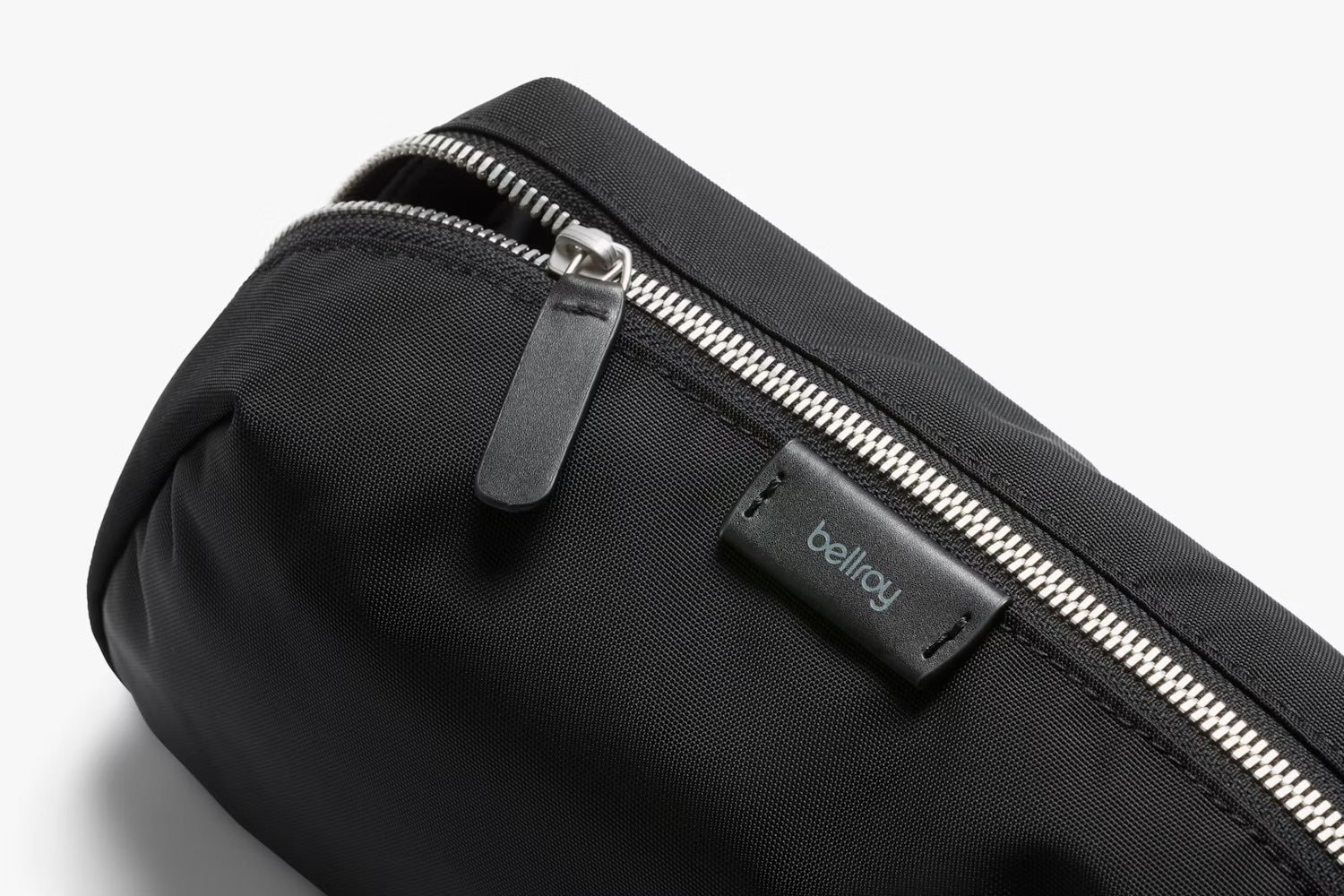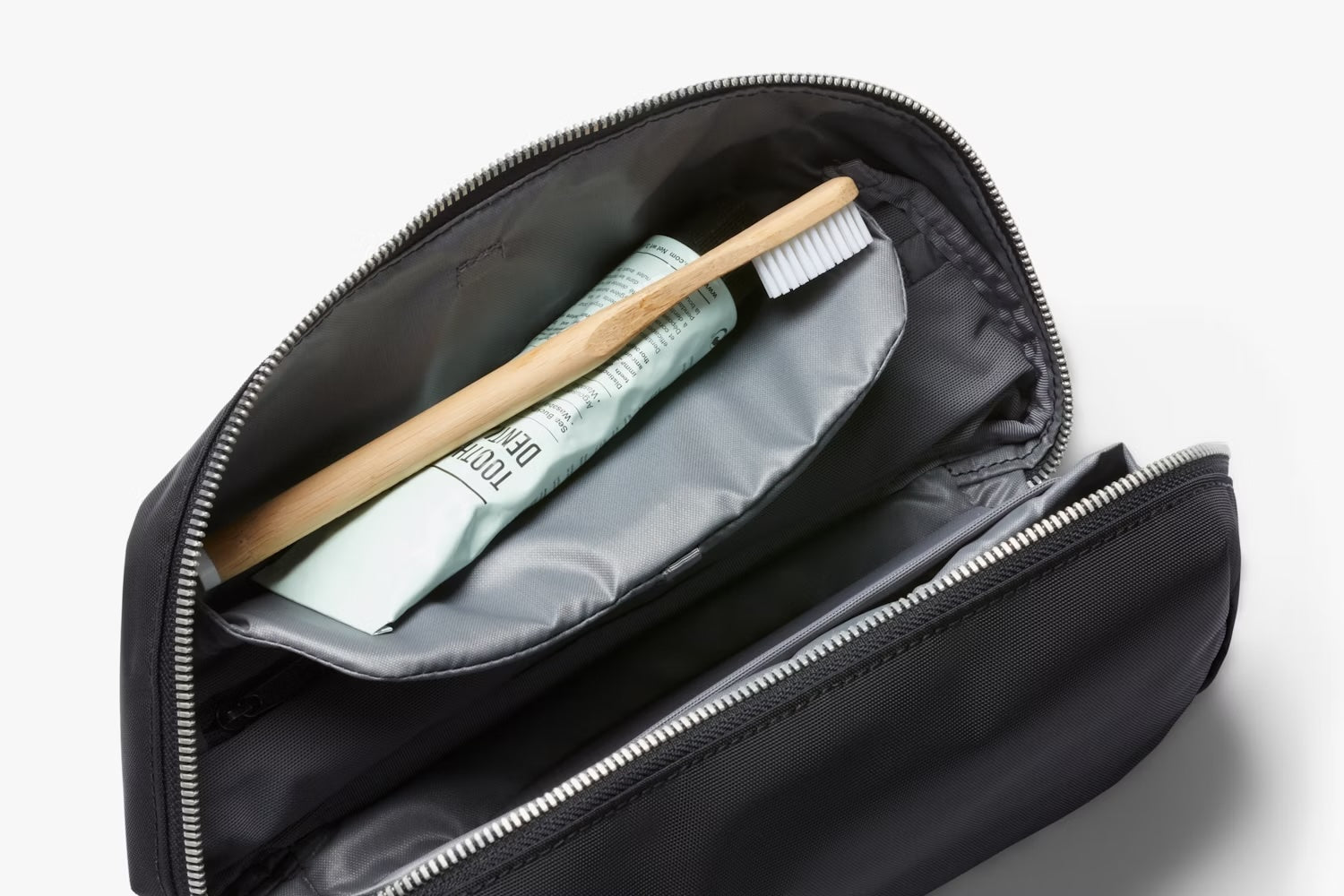 This toiletry kit is perfect for extended trips and larger products. With an angled zipper, you can easily access items without having to dig through the entire kit. The sturdy pocket keeps bottles organized and the stretchy mesh pockets can accommodate various small items. Keep loose items out of sight with the zip pocket, while the magnetic-closure shelf keeps your toothbrush separate. Soft grab loops allow for easy one-finger carry and removal from a deep bag. Plus, the water-resistant interior lining can be easily wiped clean. Made with durable, recycled fabric and premium, eco-tanned leather, this kit is built to last.