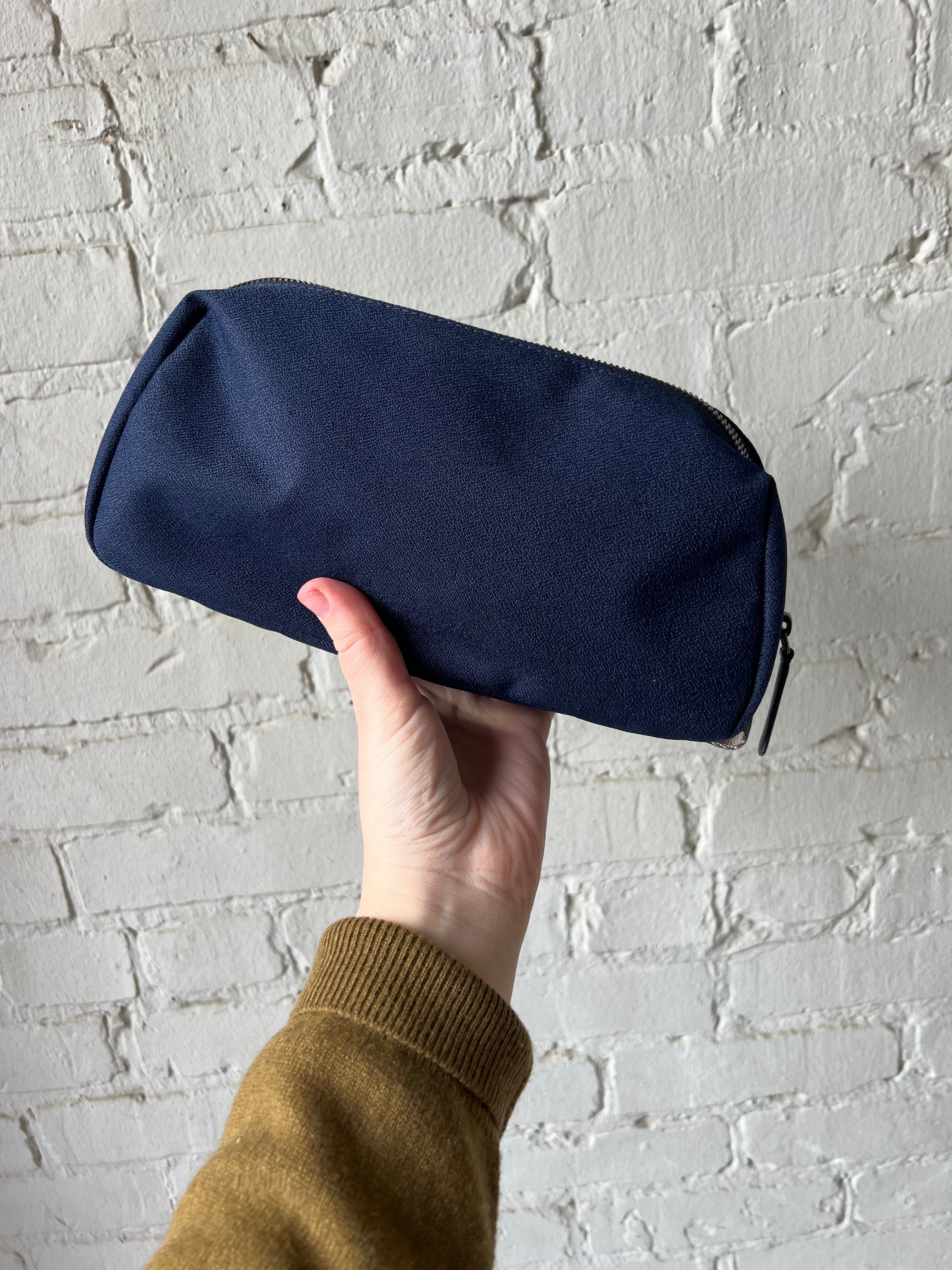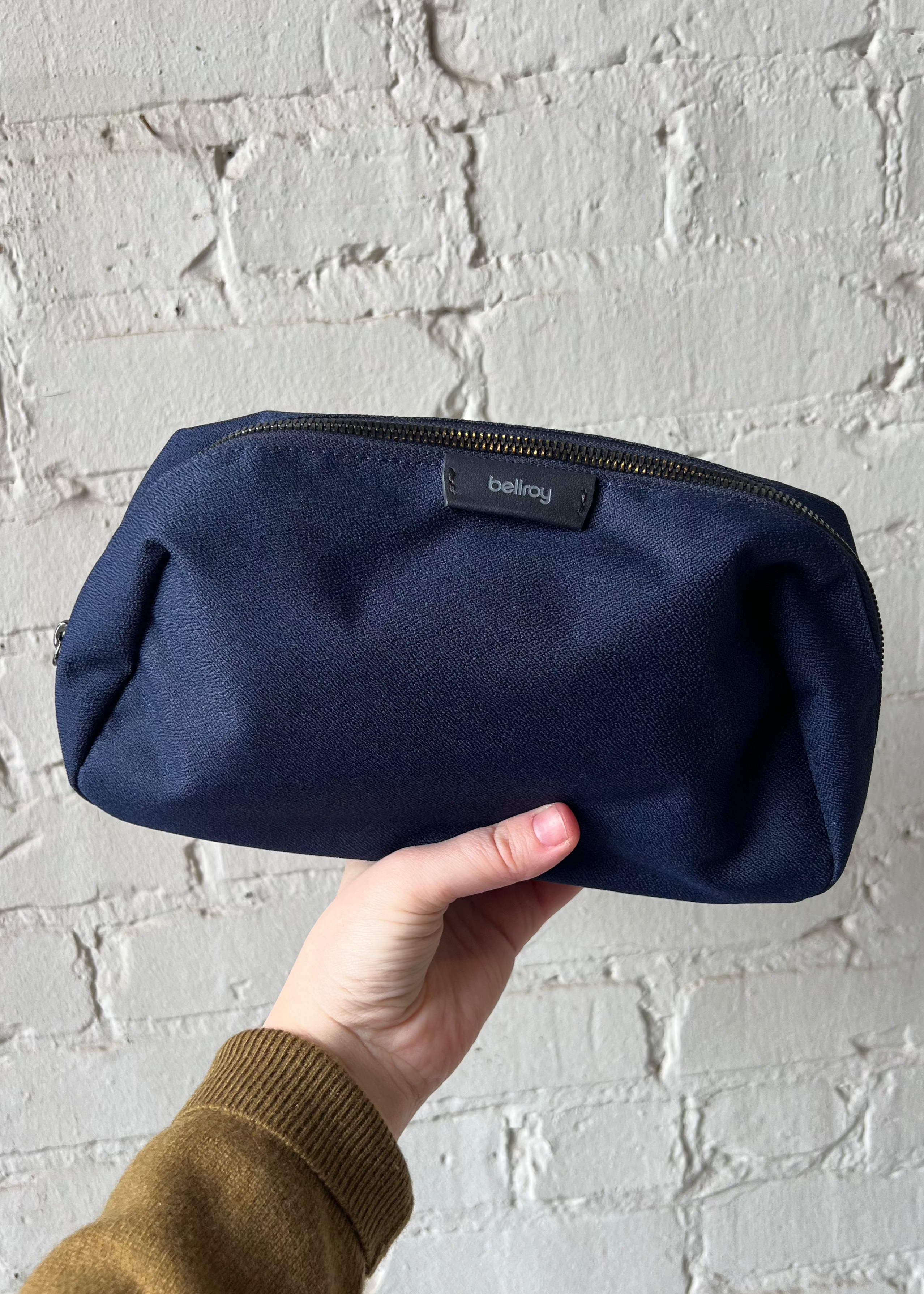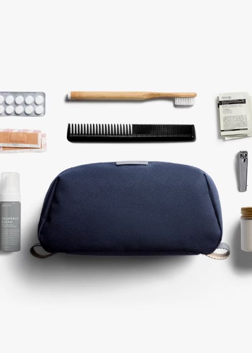 This toiletry kit is perfect for extended trips and larger products. With an angled zipper, you can easily access items without having to dig through the entire kit. The sturdy pocket keeps bottles organized and the stretchy mesh pockets can accommodate various small items. Keep loose items out of sight with the zip pocket, while the magnetic-closure shelf keeps your toothbrush separate. Soft grab loops allow for easy one-finger carry and removal from a deep bag. Plus, the water-resistant interior lining can be easily wiped clean. Made with durable, recycled fabric and premium, eco-tanned leather, this kit is built to last.