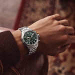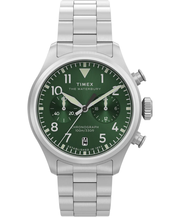 The Waterbury Ace Chronograph pairs classic pilot-watch design with modern refinement. Its 41mm brushed stainless-steel case and striking green sunray dial deliver timeless style, while luminous hands and bold numerals keep functionality front and center. A date window, quick-release bracelet, and butterfly clasp round out this versatile everyday watch.