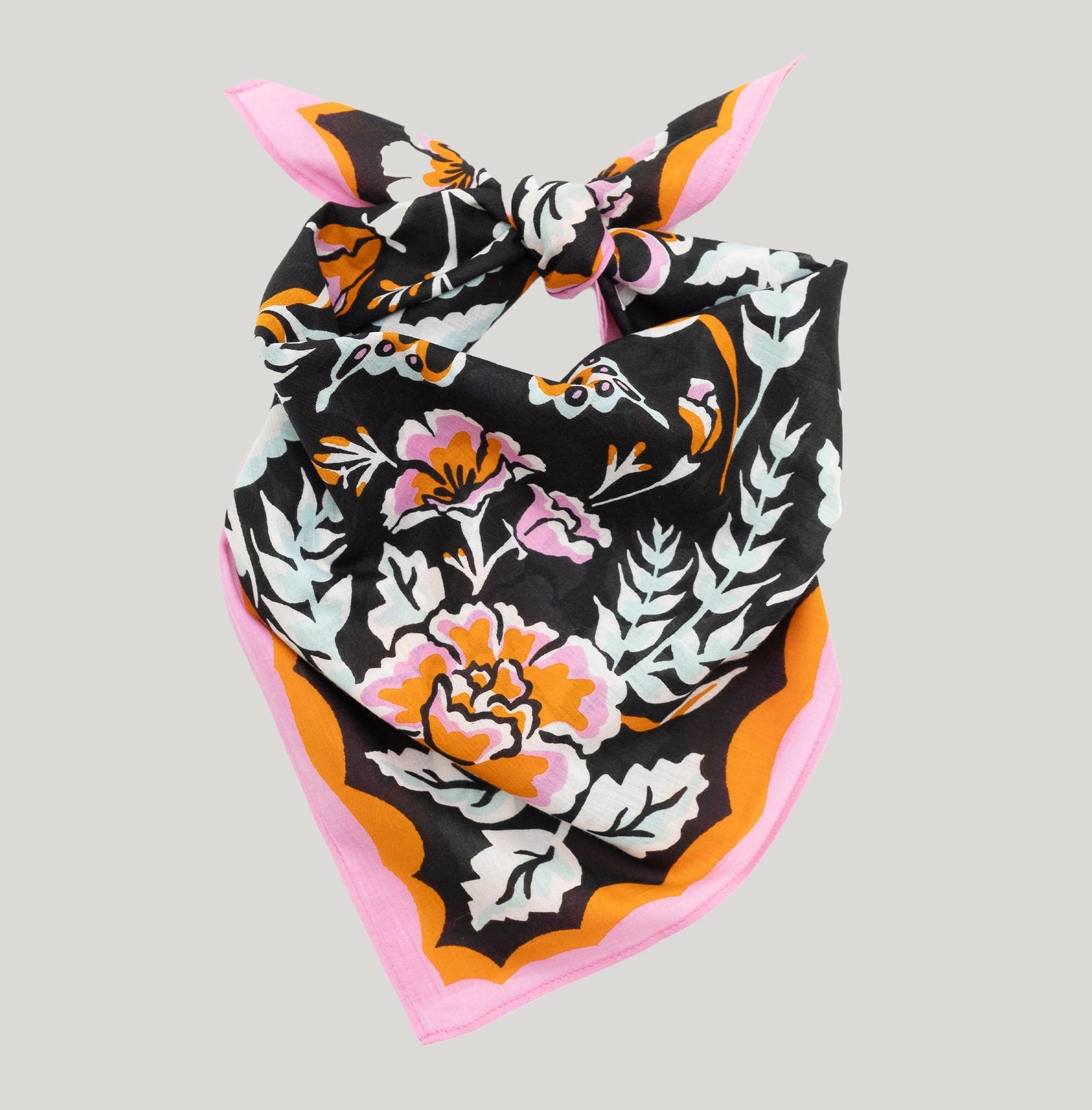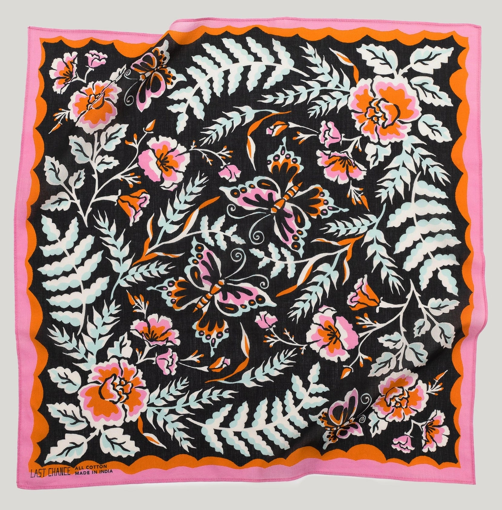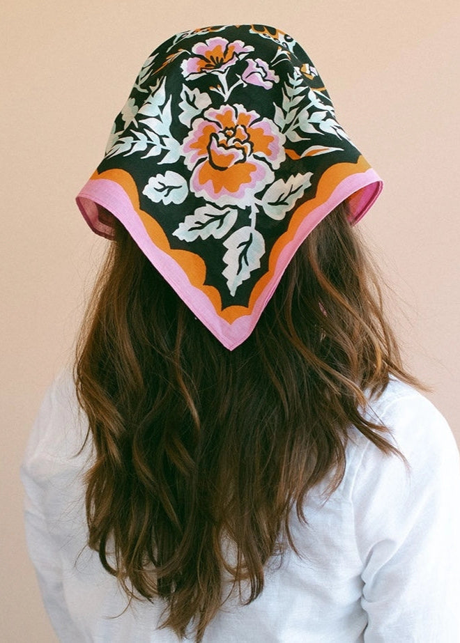 Wild roses, ferns, California poppies and butterflies flutter across this bold bandana.