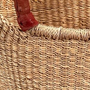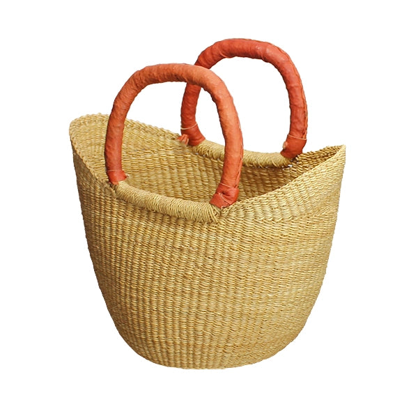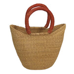 The natural (undyed) grass is variegated, which creates unique beauty in every basket. Known as "U-Shoppers" in Ghana, their distinctive "U" shape is formed by the flared top edge that creates more room inside each basket. Each mini tote has two leather-wrapped handles that come together over the top for easy carrying. The color of the leather may vary. Approximately the size of a lunchbox, mini totes are ideal for use as a purse, small shopping bag, or a stylish way to carry everyday essentials.