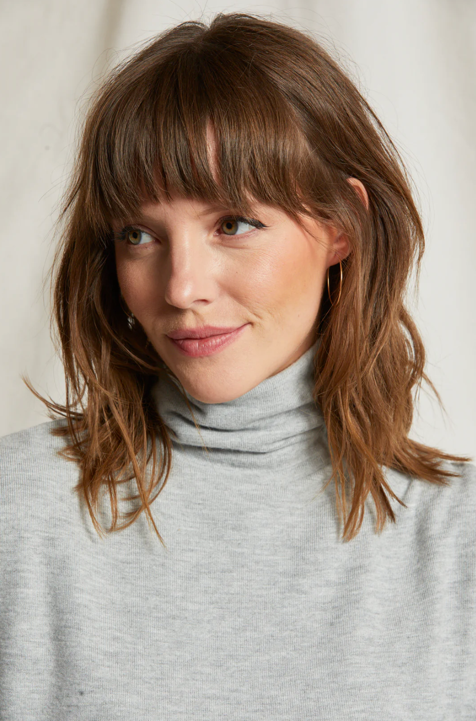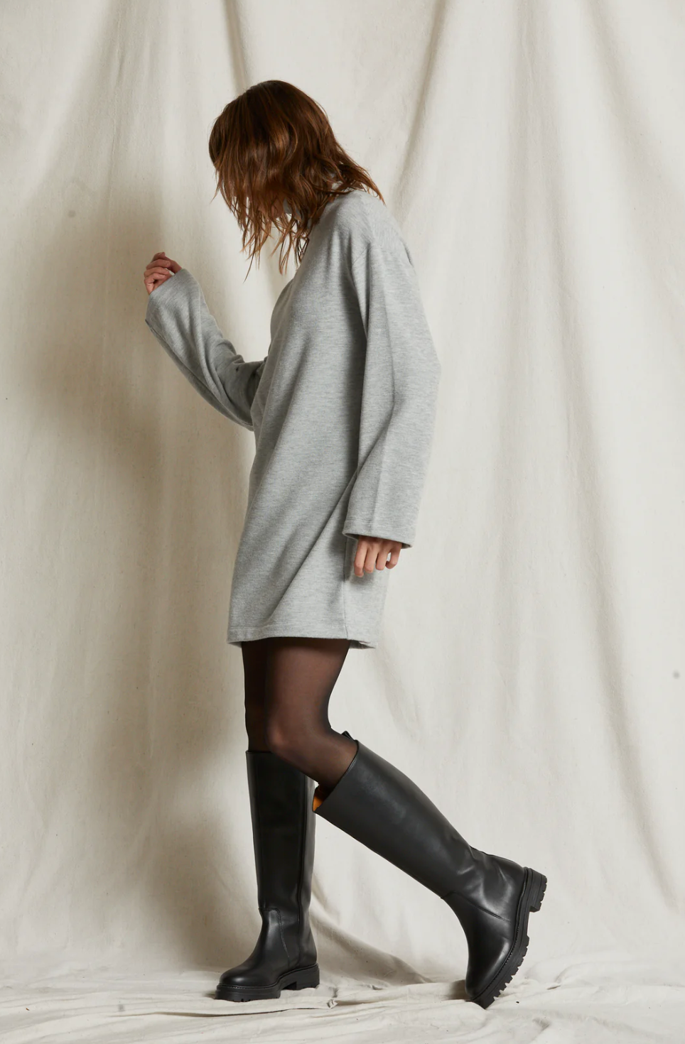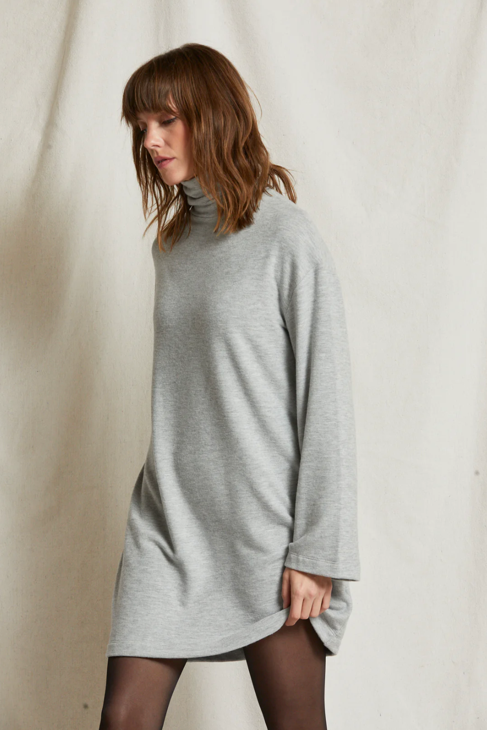 This mid-length dress is crafted from ultra-soft brushed jersey and flows gracefully away from the body. It features a mock neck, drop shoulders, full-length sleeves, and a relaxed fit that falls at mid-thigh. True to size and versatile, it can be dressed down for everyday wear or elevated with knee-high boots and tights for a night out.