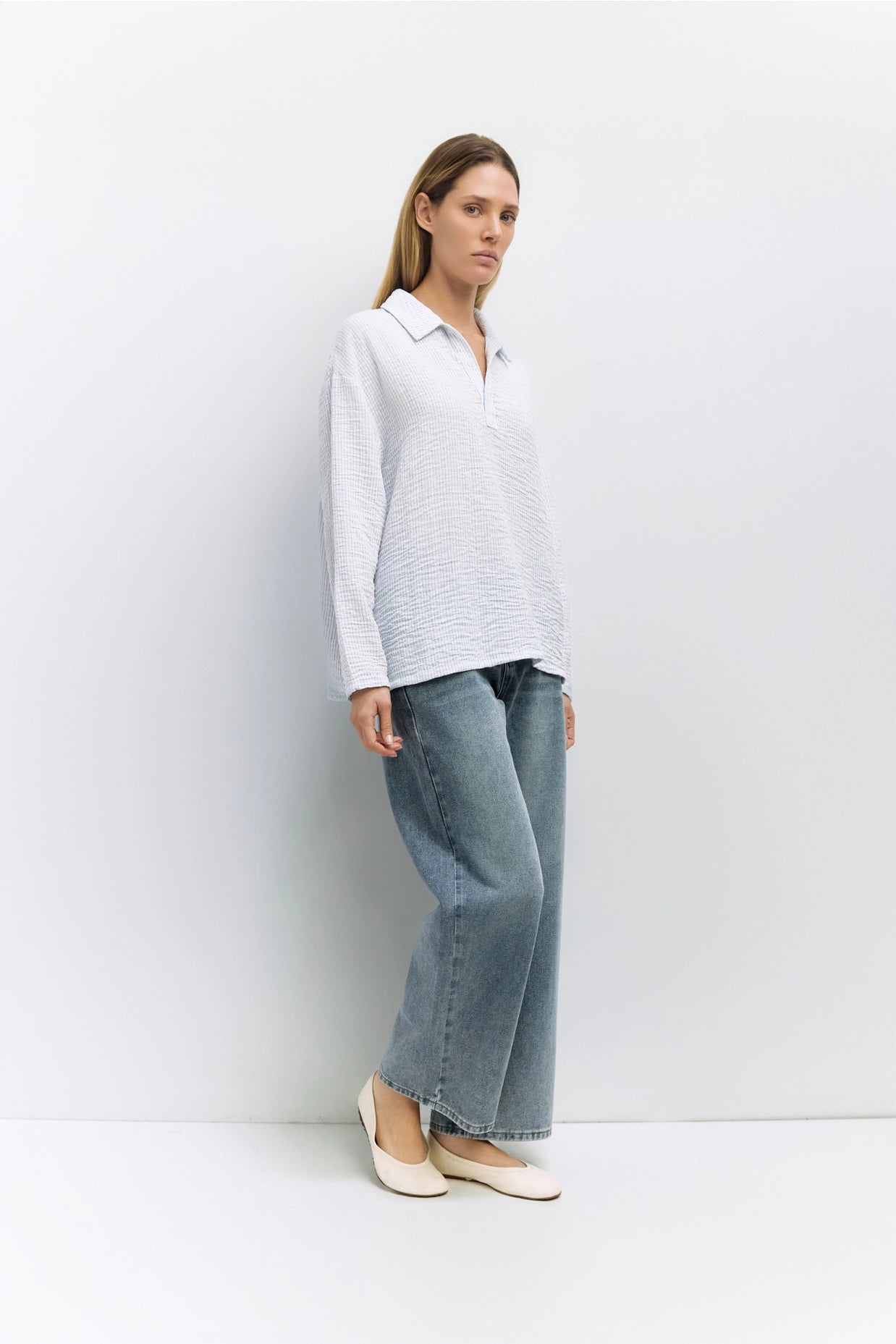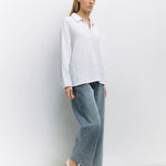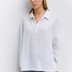 The Becca Top features a relaxed fit in a semi-sheer, linen-like striped fabrication, designed with a collared neckline and partial button closure, and finished with long sleeves for an effortless, airy look.
