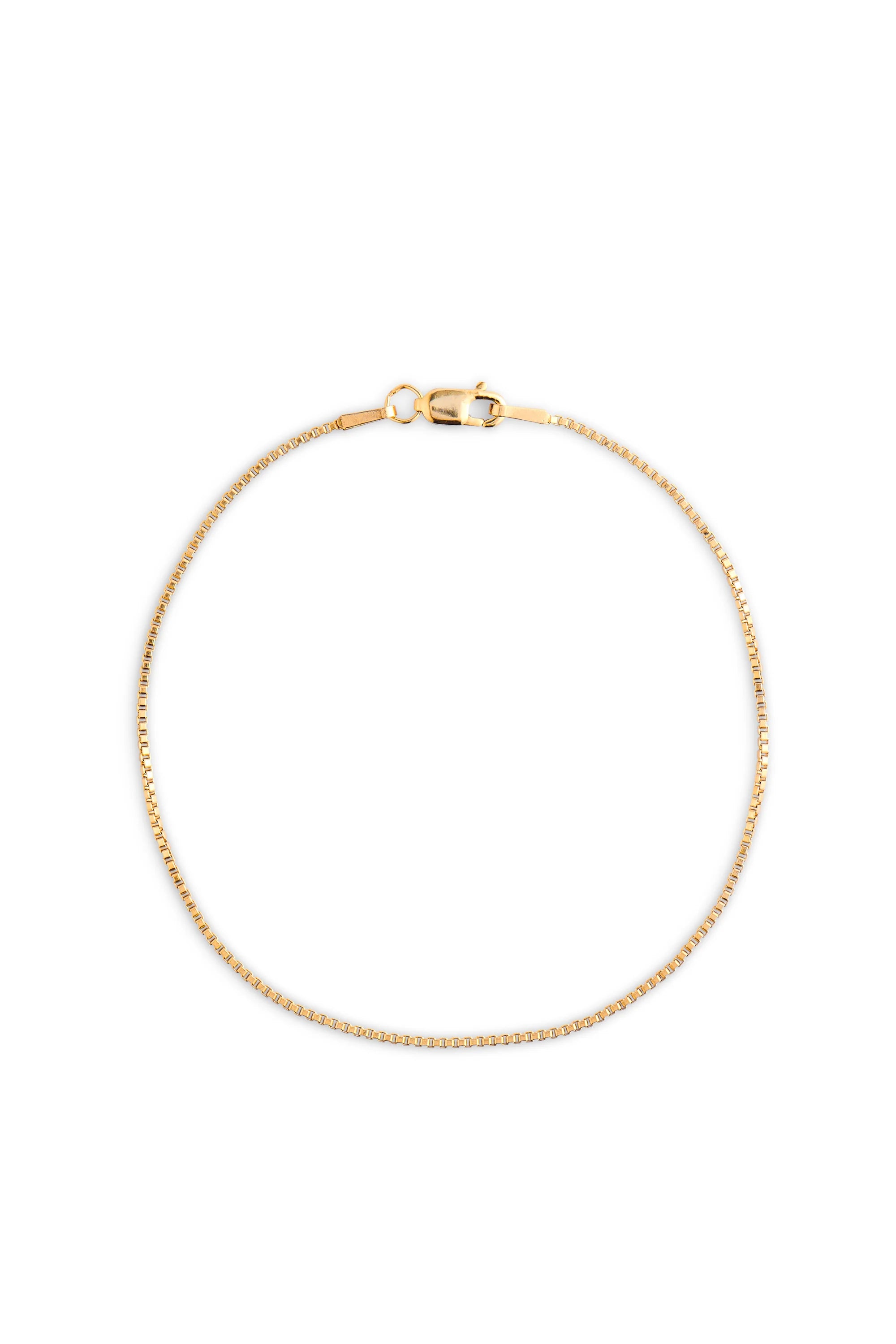 The Byrdie Bracelet is a delicate box chain bracelet with a slim 1mm profile made of 14k Gold Filled. This is a very classic and minimal piece that is perfect for every day and also layers seamlessly with your other favorites.