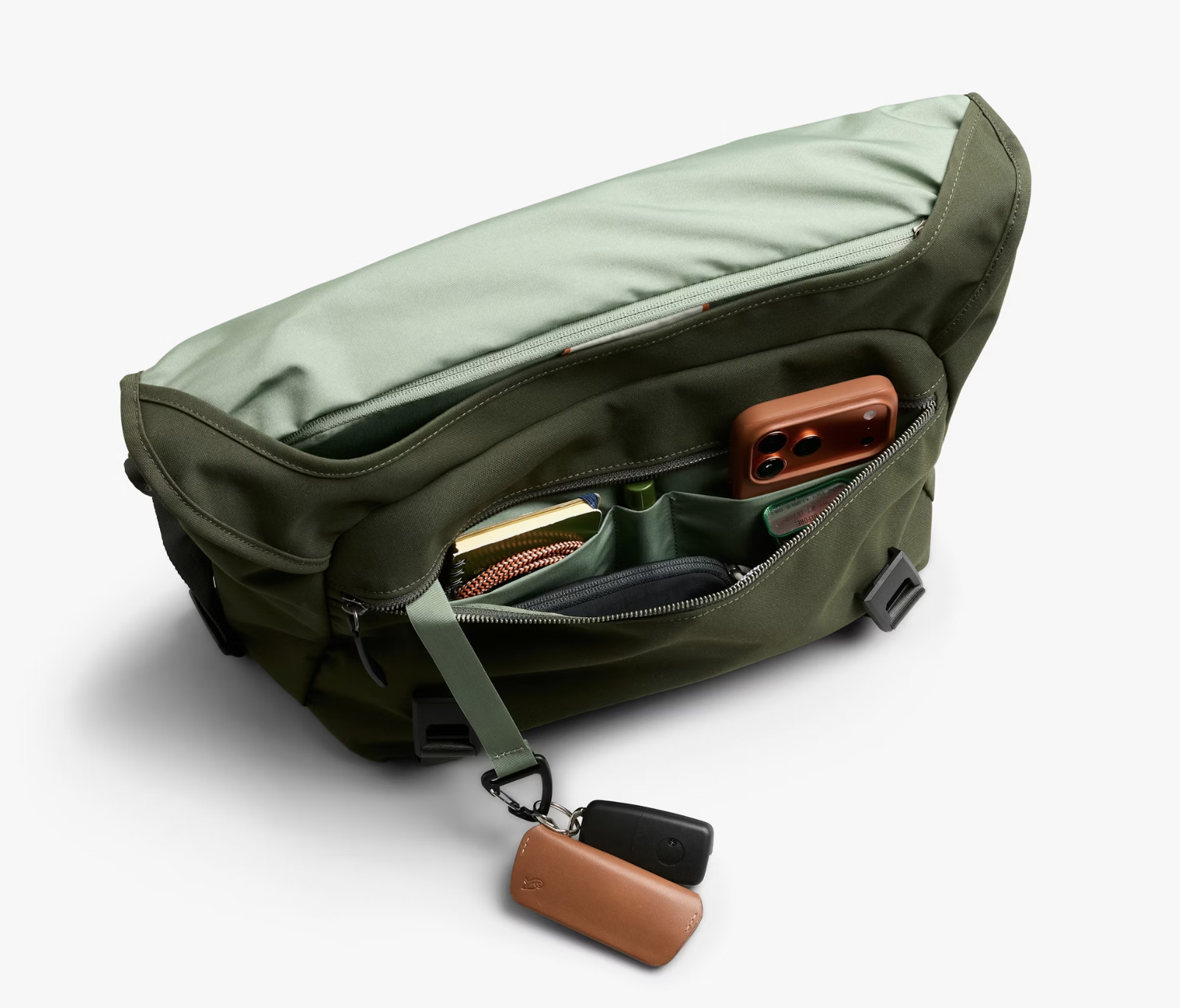 - Organized front pocket with integrated key clip