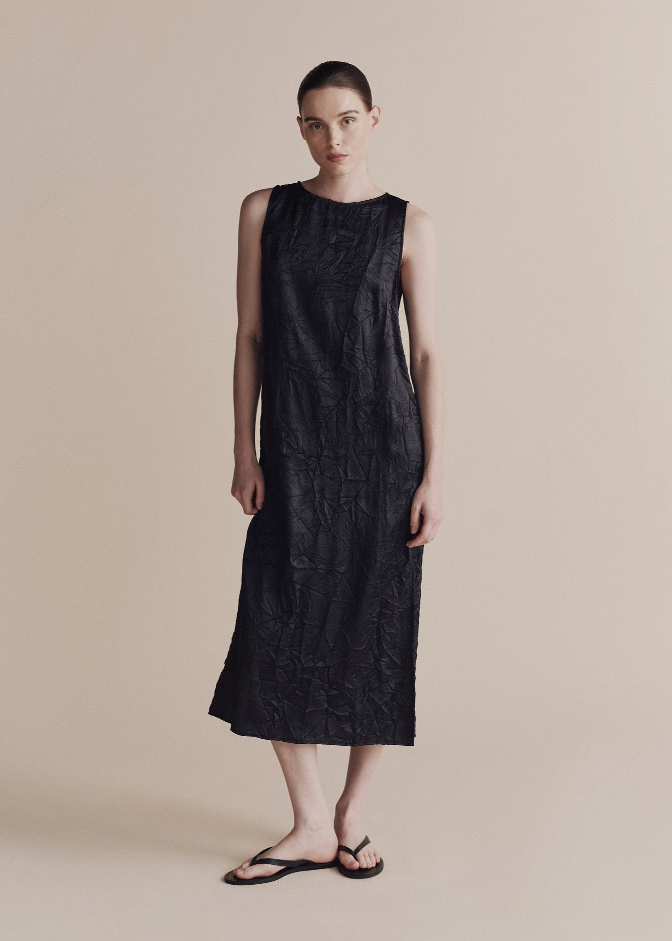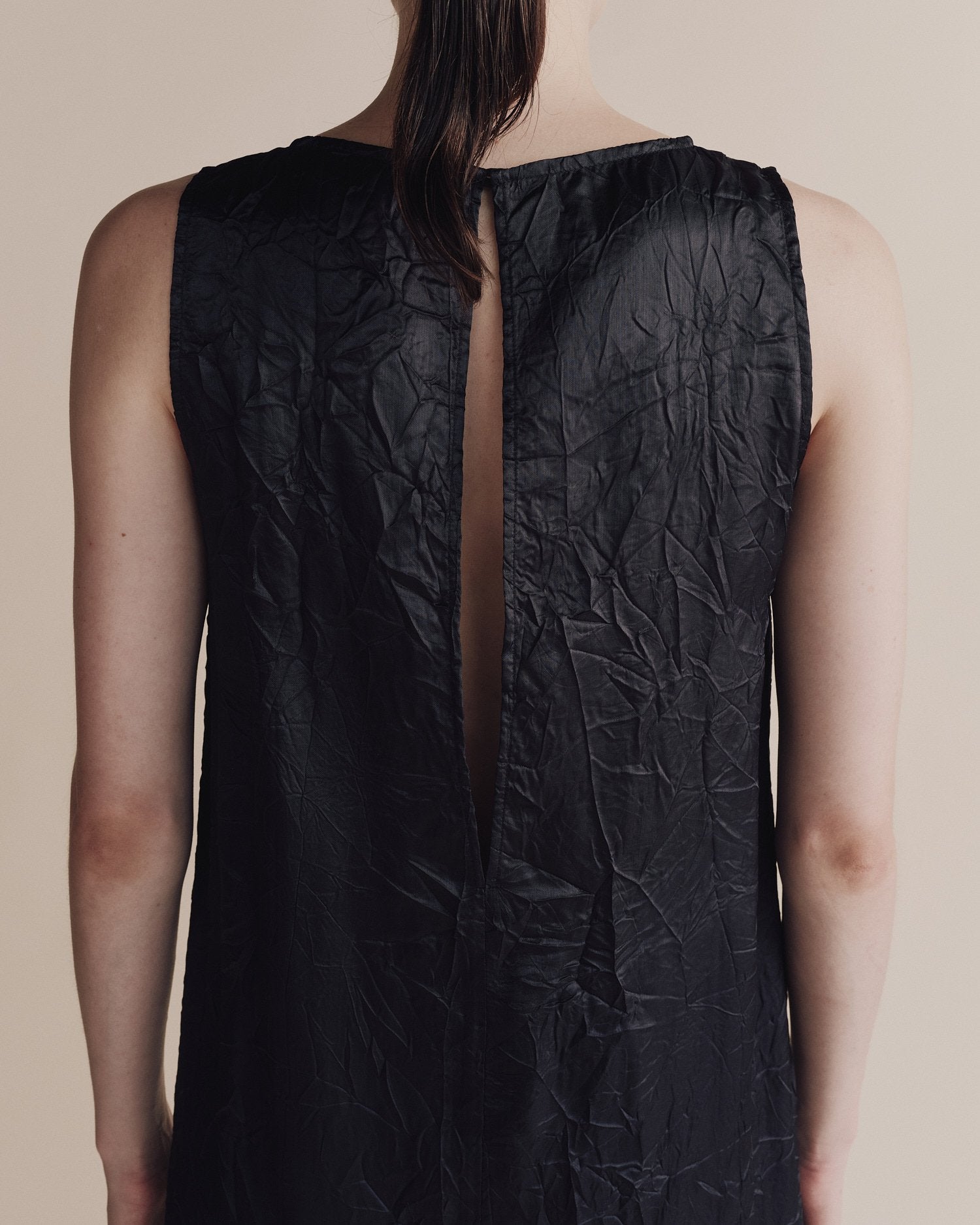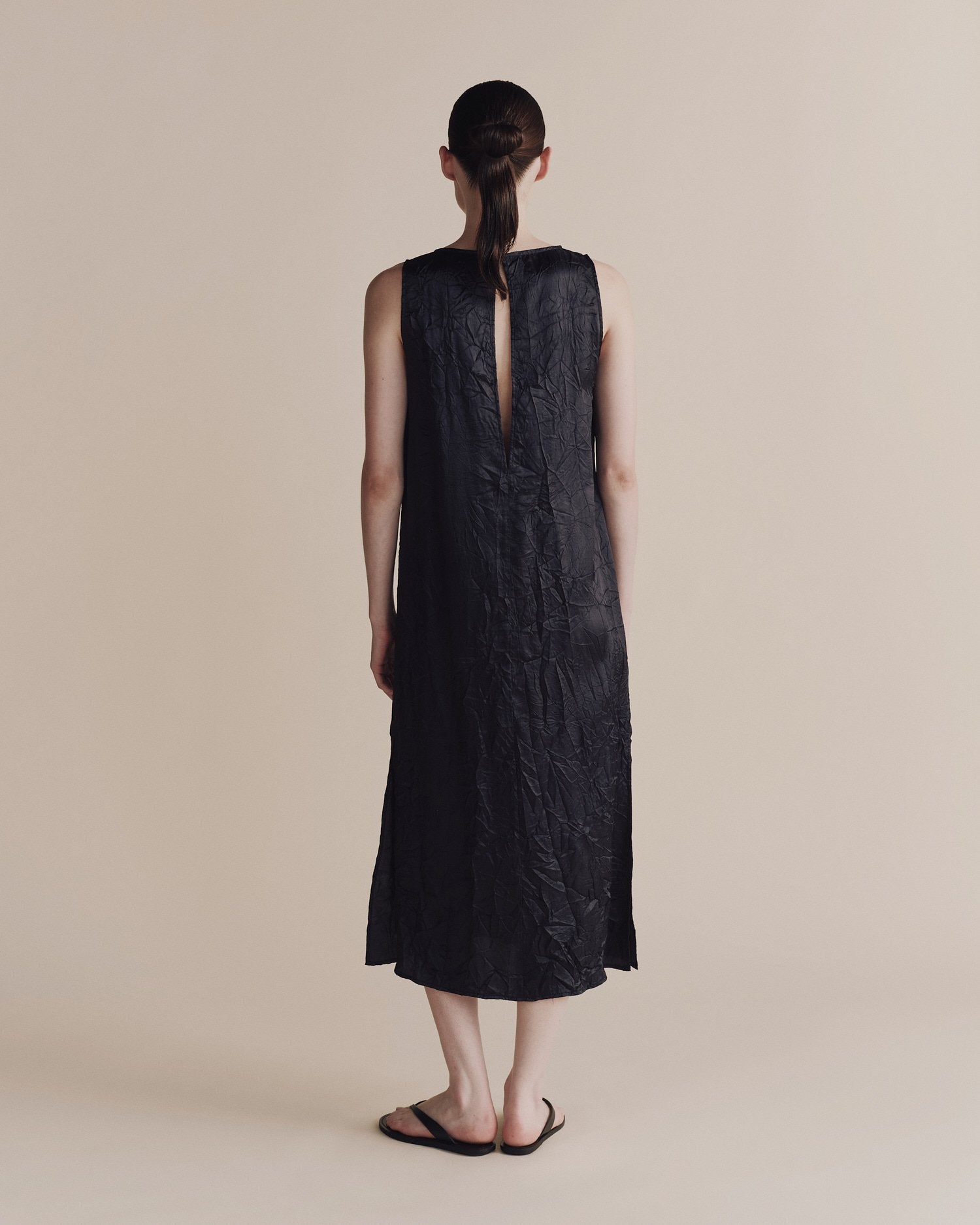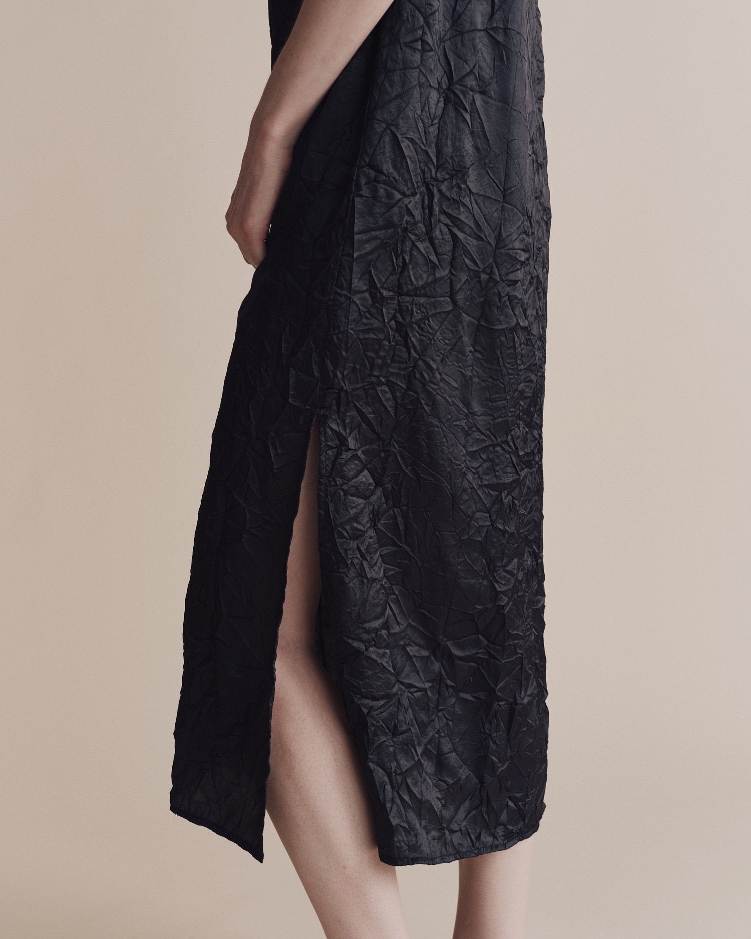 Expertly crafted for a sleek and sophisticated look, the Creased Satin Mini Dress in Navy is a must-have for any formal occasion. With a boat neckline, side seam slit, and straight silhouette, this dress flatters your figure while darts at the chest add subtle detailing. The hidden button closure at the back provides a seamless finish.