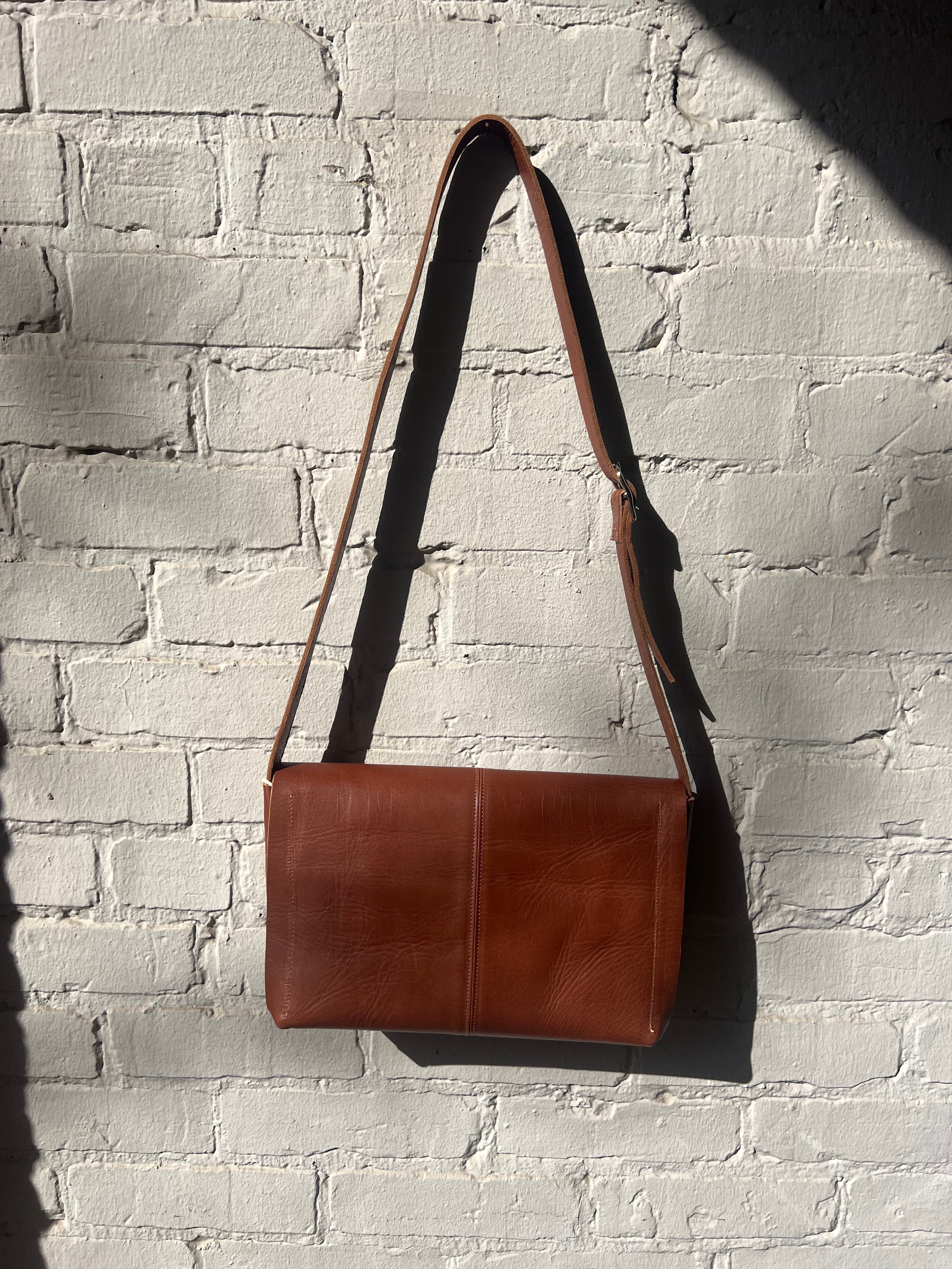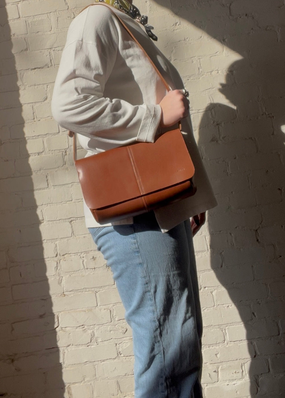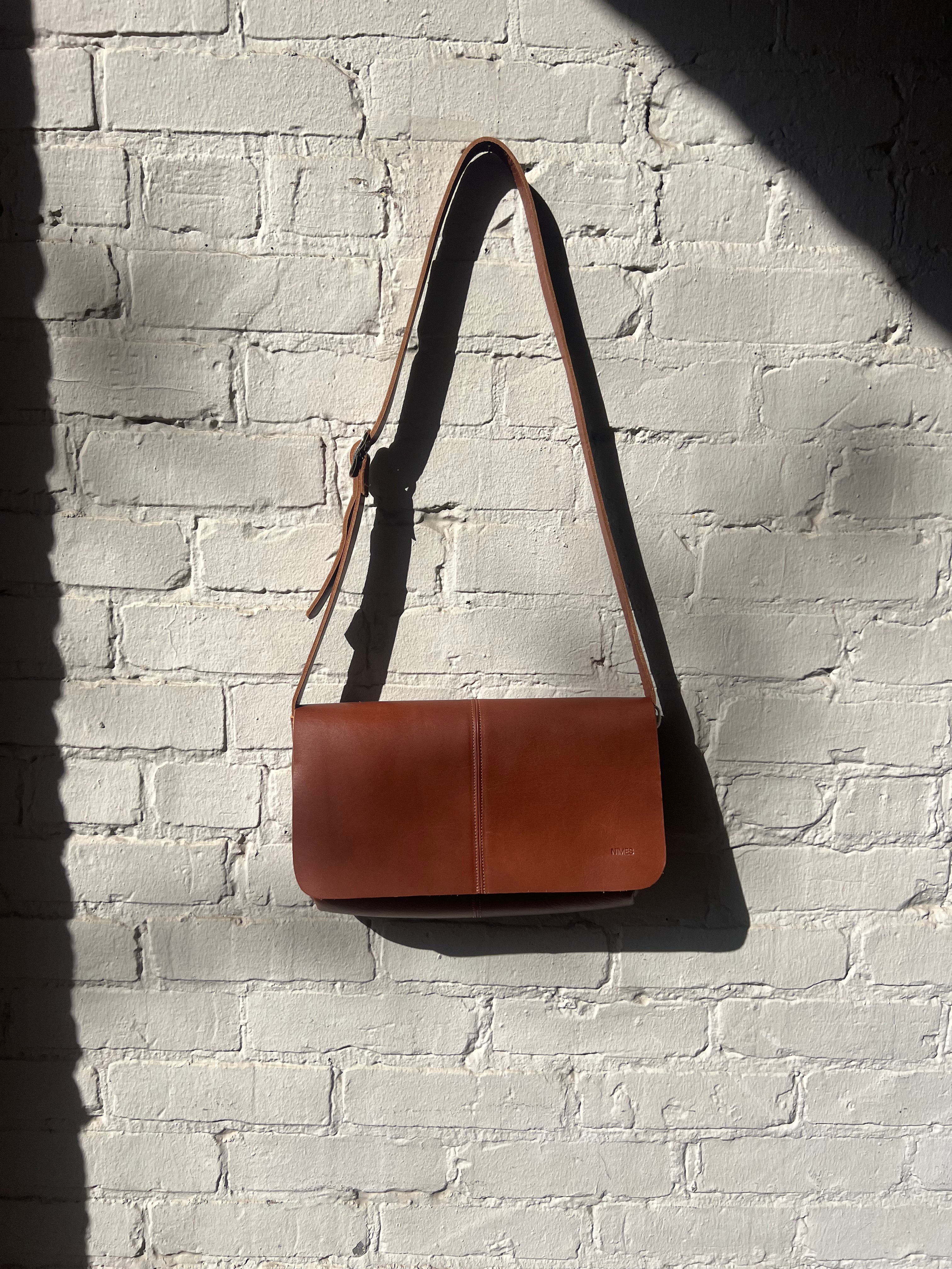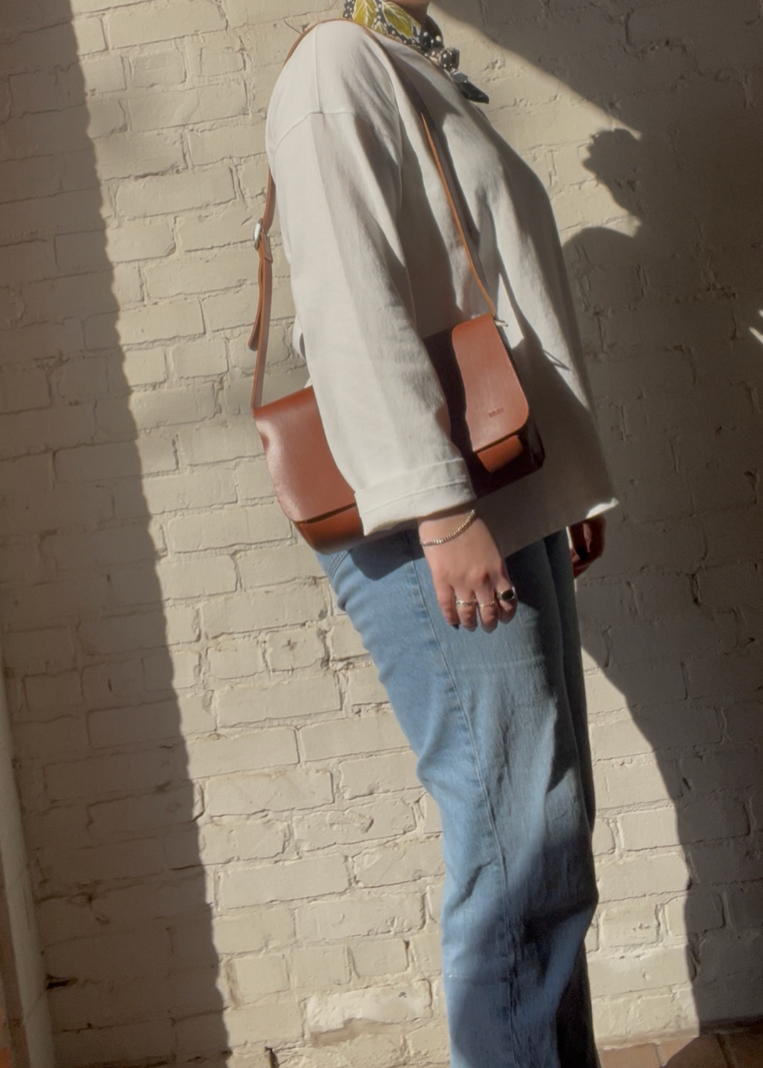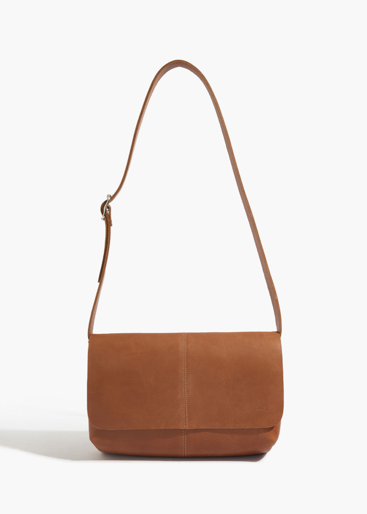 Crafted from smooth, vegetable-tanned natural leather, this crossbody bag features a top flap closure with a contrasting grainy leather lining, a small embossed ‘NIMES’ logo, an adjustable leather strap, and an internal pocket with a leather interior.