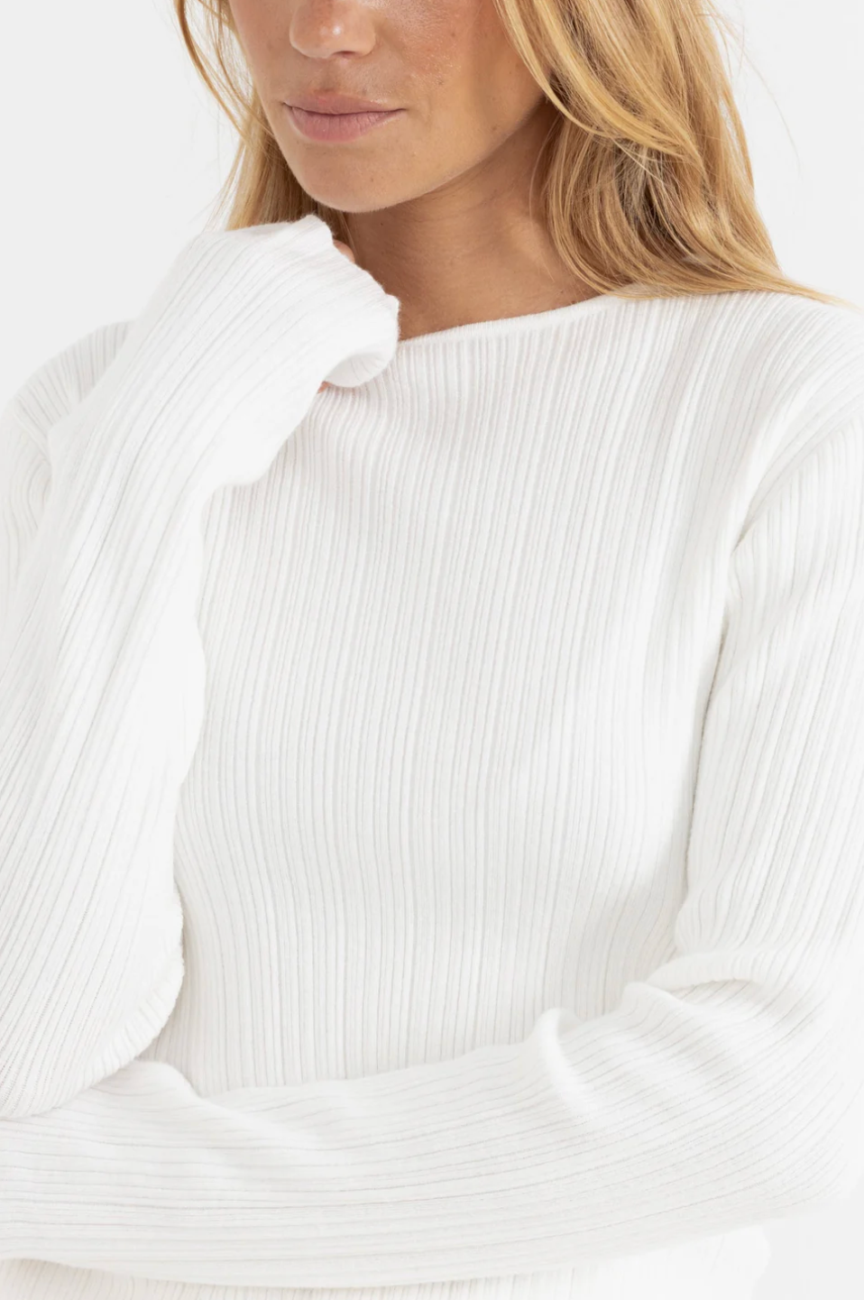 Elevate your essentials with the Essential Long Sleeve Knit top. This fitted design features a boat neckline and long slim sleeves, providing a flattering silhouette that is both stylish and comfortable.
