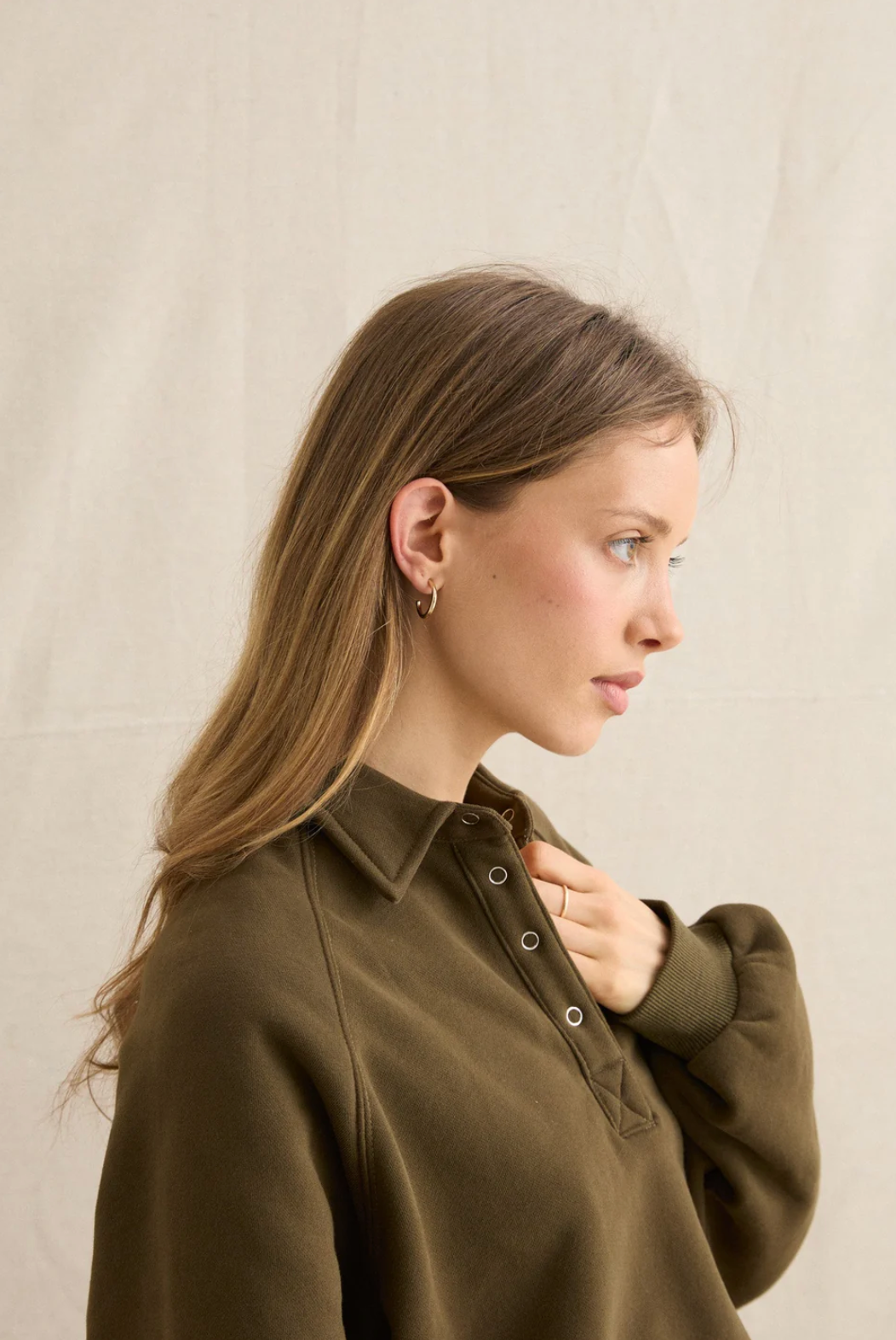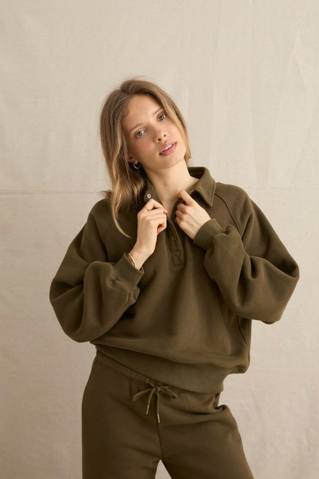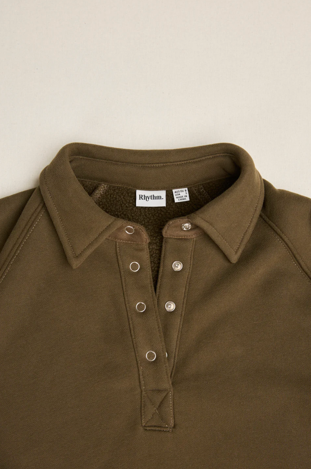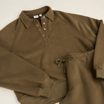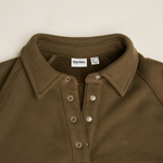 A new relaxed fit pullover with a collar and centerfront metal snap closure. Designed for cozy layering as the weather cools. Perfect for chilly mornings or post-surf lounging.