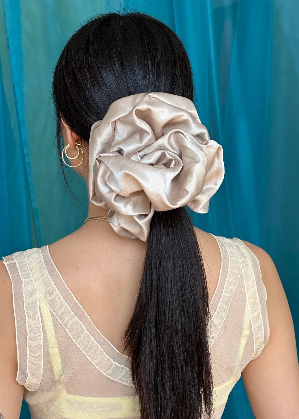 A voluminous satin hair statement scrunchie. Great for thick and curly hair!