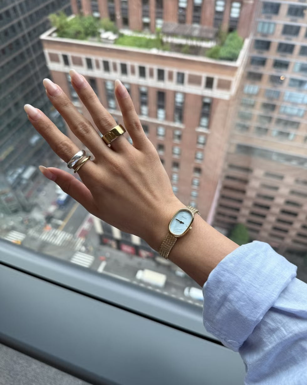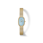 The Jane Tethered watch features a compact 18mm oval case and is complemented by a champagne mother of pearl dial with a woven mesh bracelet that fastens with a quick release clasp. Mother of Pearl is a product of nature; there will be variances in texture on each dial.