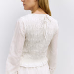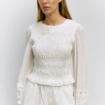 The Lucine Top is crafted from lightweight cotton with a lined, form-fitting smocked silhouette, featuring long embossed peasant sleeves with elastic cuffs, a crewneck, and a back partial tie closure.