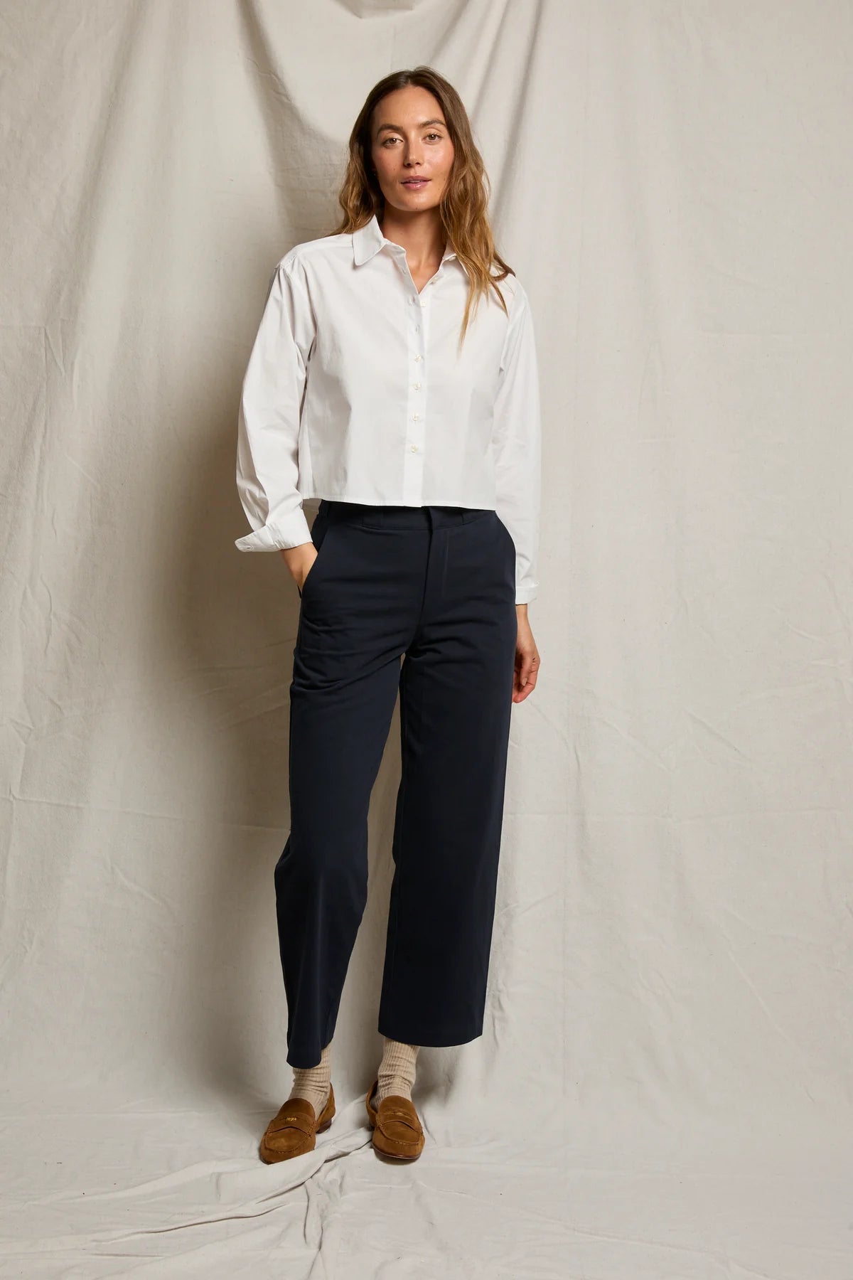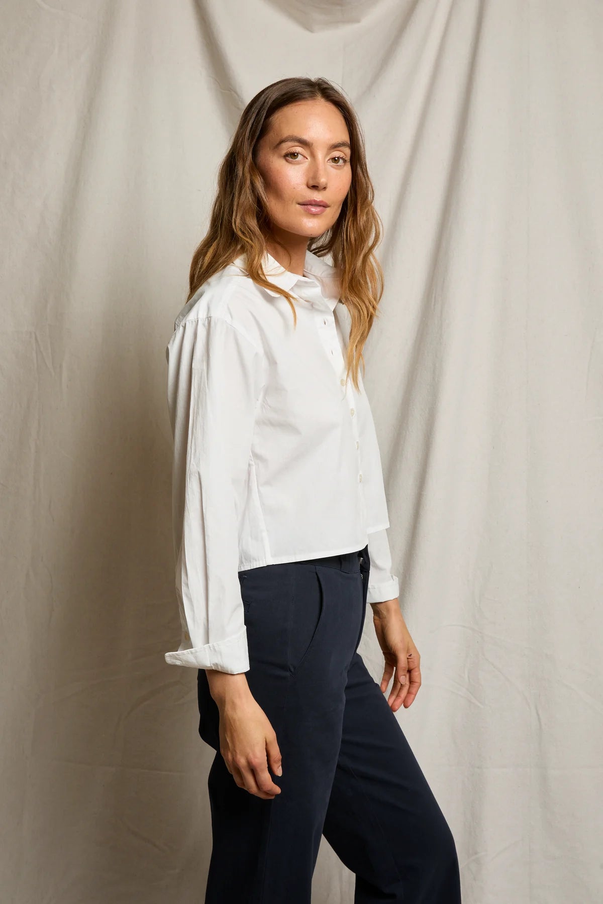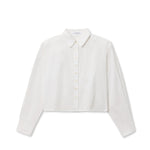 Cut from crisp cotton poplin, it features an easy, boxy shape that feels modern and effortless. With its clean collar, it’s the perfect piece to pair with high-waisted anything.
