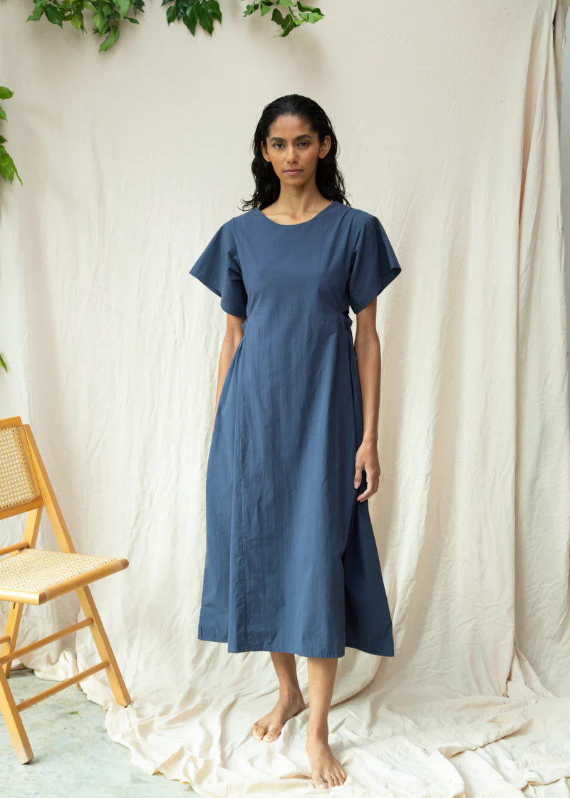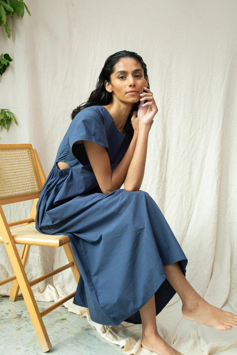 The Nathalia Dress is a structured style with a loose cut A-line body, featuring cut outs and elasticated gathers to the side, side pockets at the hip, and a lower, gathered back. Crafted from 100% Organic Cotton poplin for a crisp, cool feel.