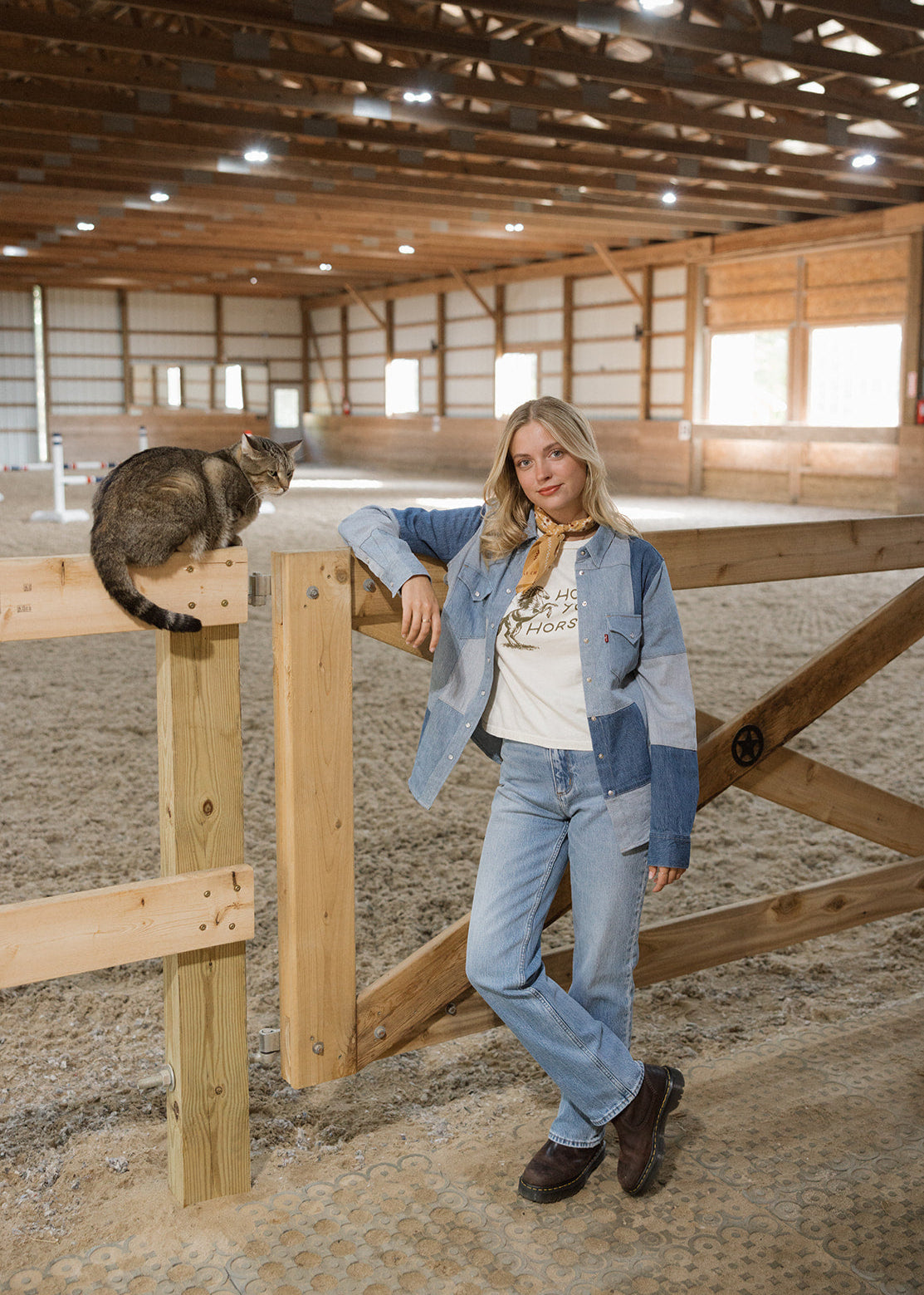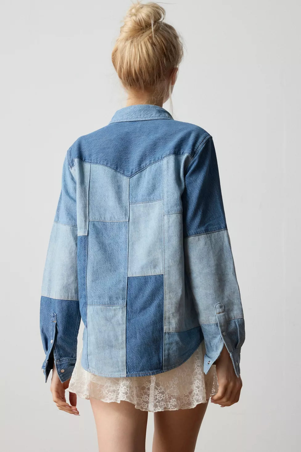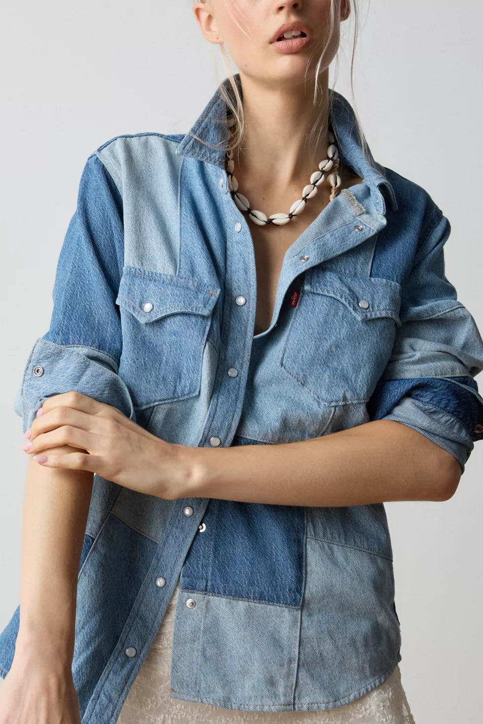 Vintage-inspired Levi's denim shirt in a relaxed fit. Designed in a lightweight, patchwork cotton denim featuring a collared neckline, long cuffed sleeves and snaps down the front. Topped with pointed double-breasted flap pockets and yoke detailing for western flair.