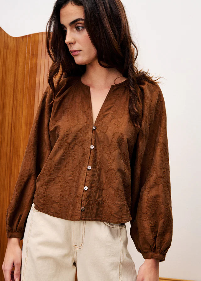 The Pensee Blouse features a soft textured fabric with long puffed sleeves and a flattering V-neck. Its loose, flowing cut offers comfort and effortless style, perfect for everyday wear or dressing up your look.