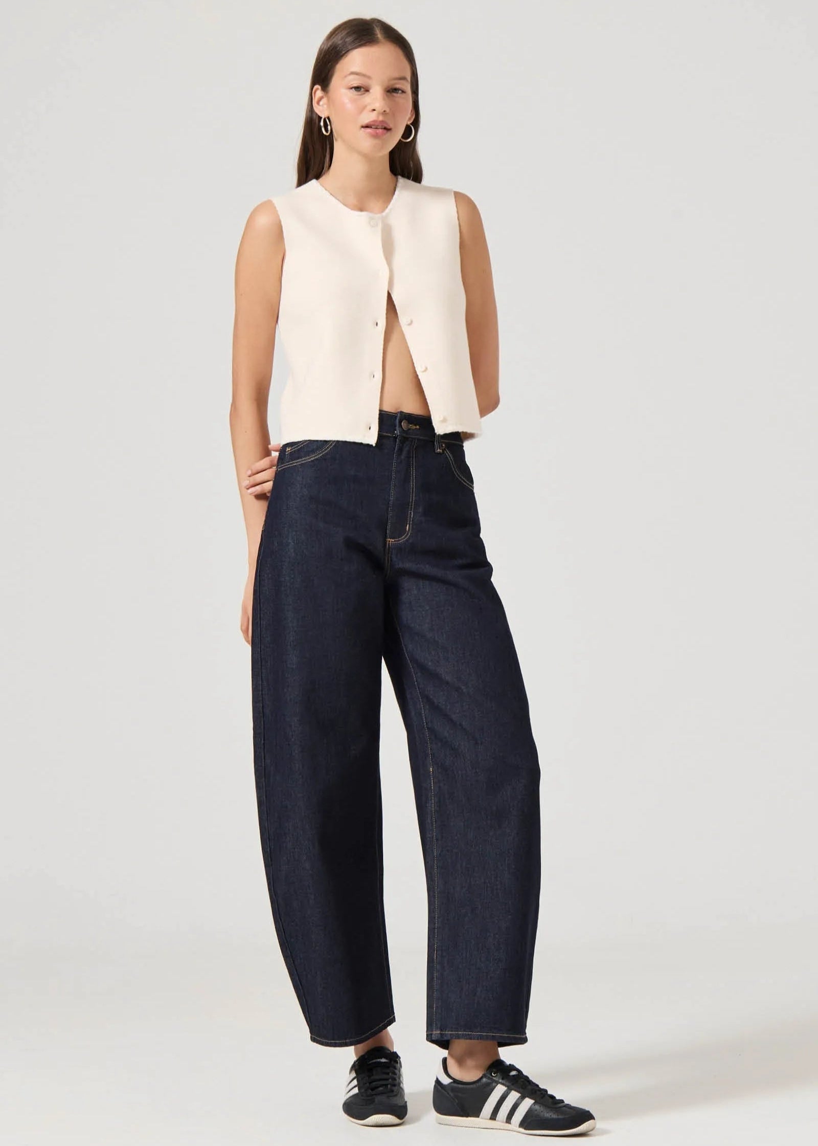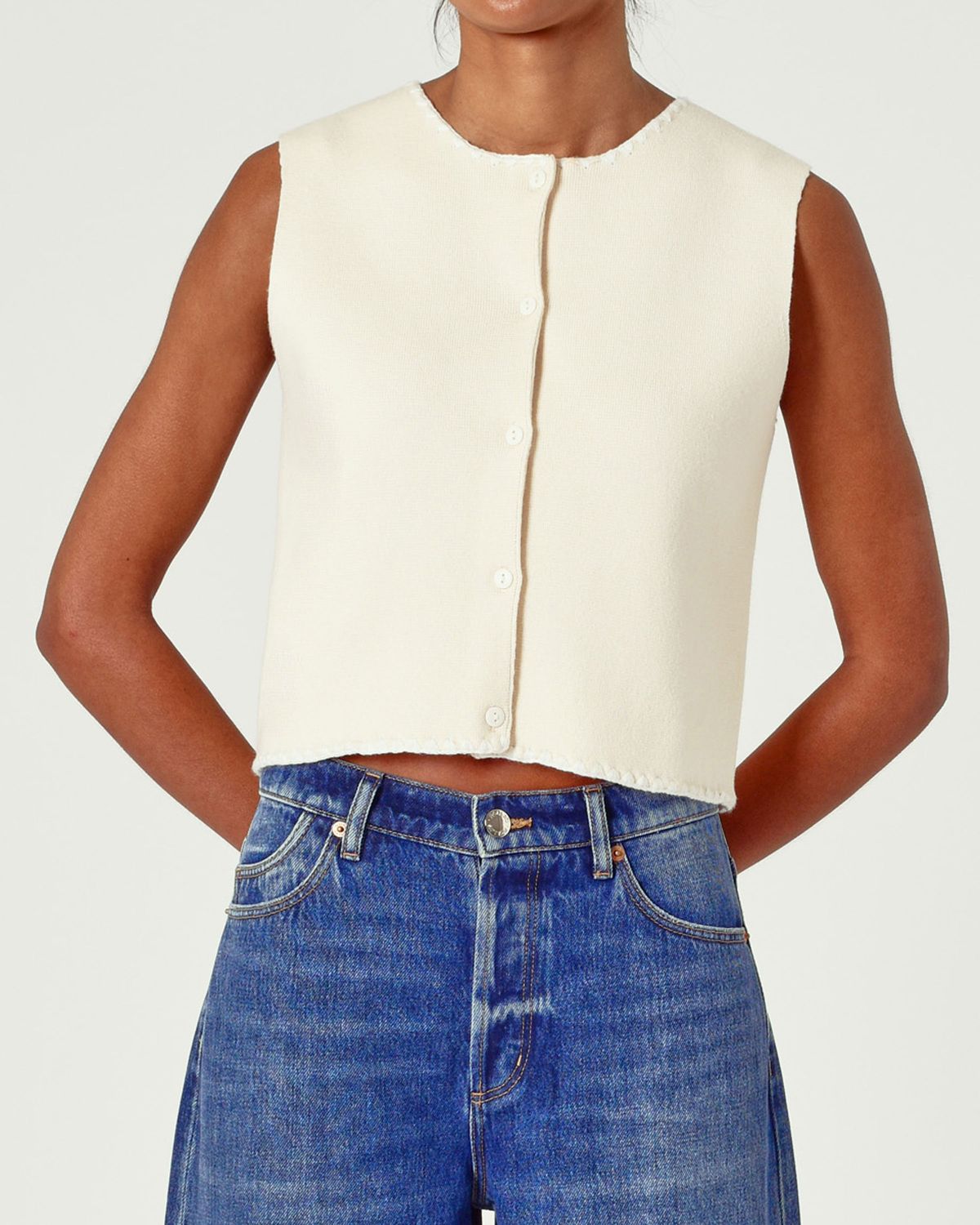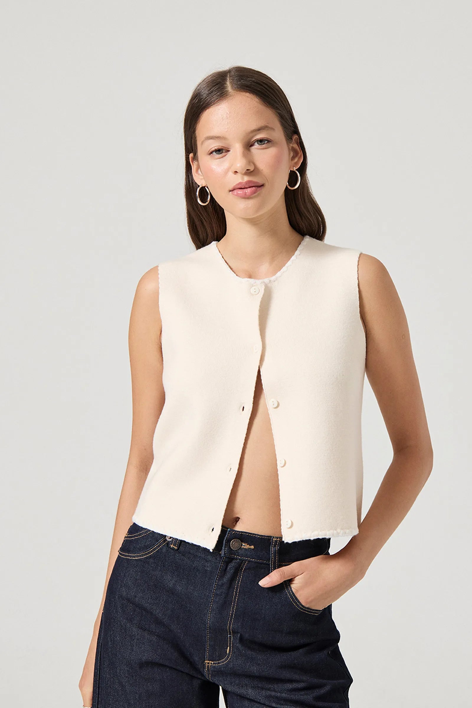 The Pia Vest in Vintage White is made from soft, 100% cotton knit fabric, making it ideal for layering throughout the year. Its button-down front and classic crew neckline give it a timeless look, while the relaxed fit ensures comfort and easy styling. Wear it alone or layer it over tees and dresses for a versatile addition to your wardrobe.