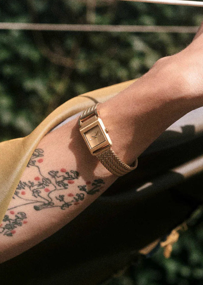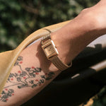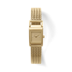 The Revel Tethered watch carries a petite 18mm squared case with a delicate buckle feature and a woven mesh bracelet that fastens with a quick release clasp.
