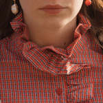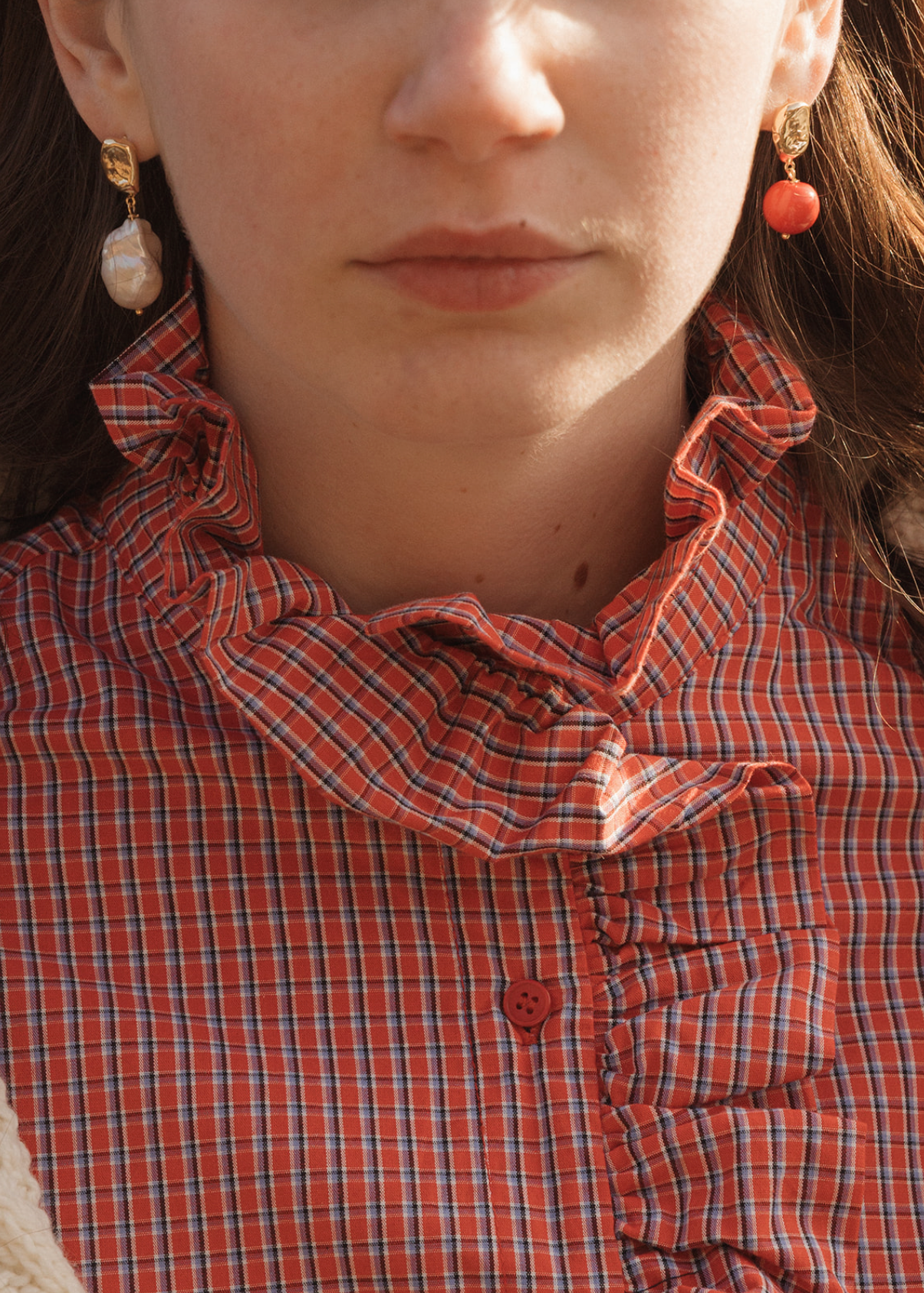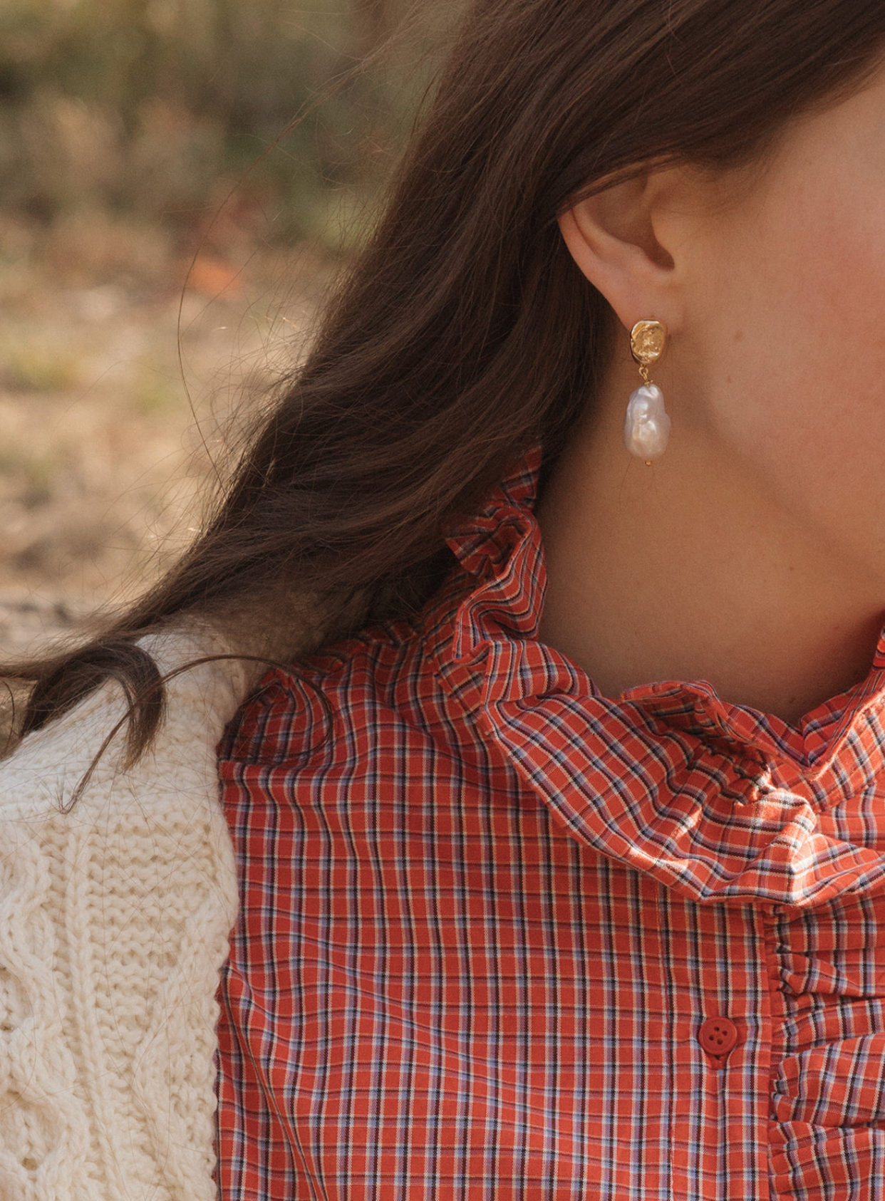 Abstract sculpted posts with mis-matched drops. An organic shaped baroque pearl and round shiny bead for a pop of color.