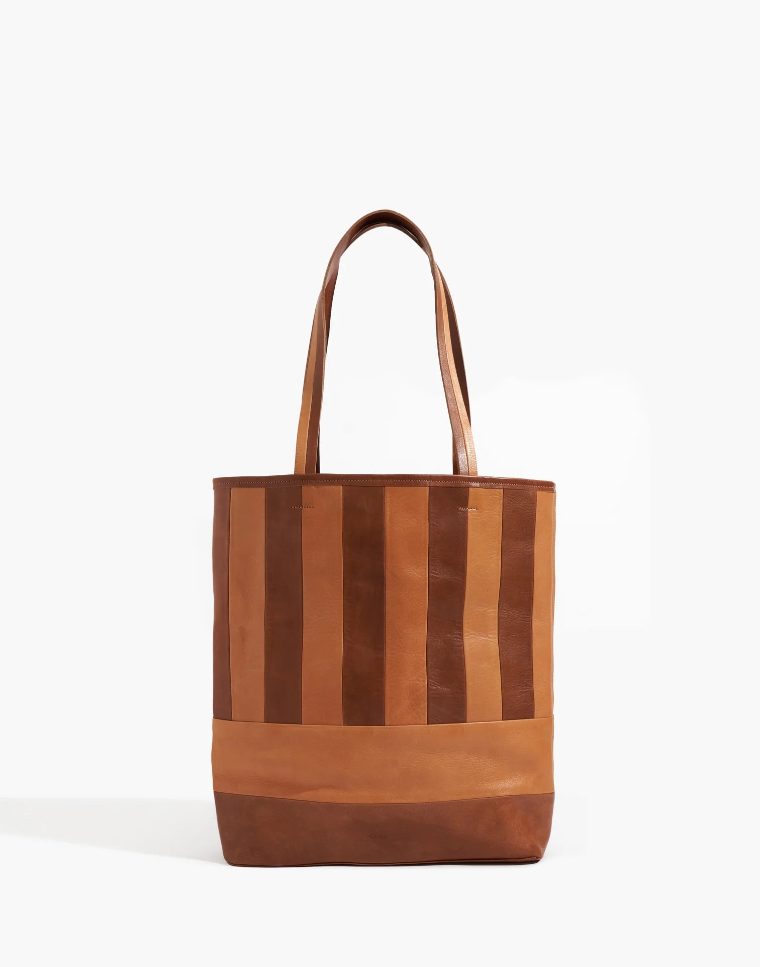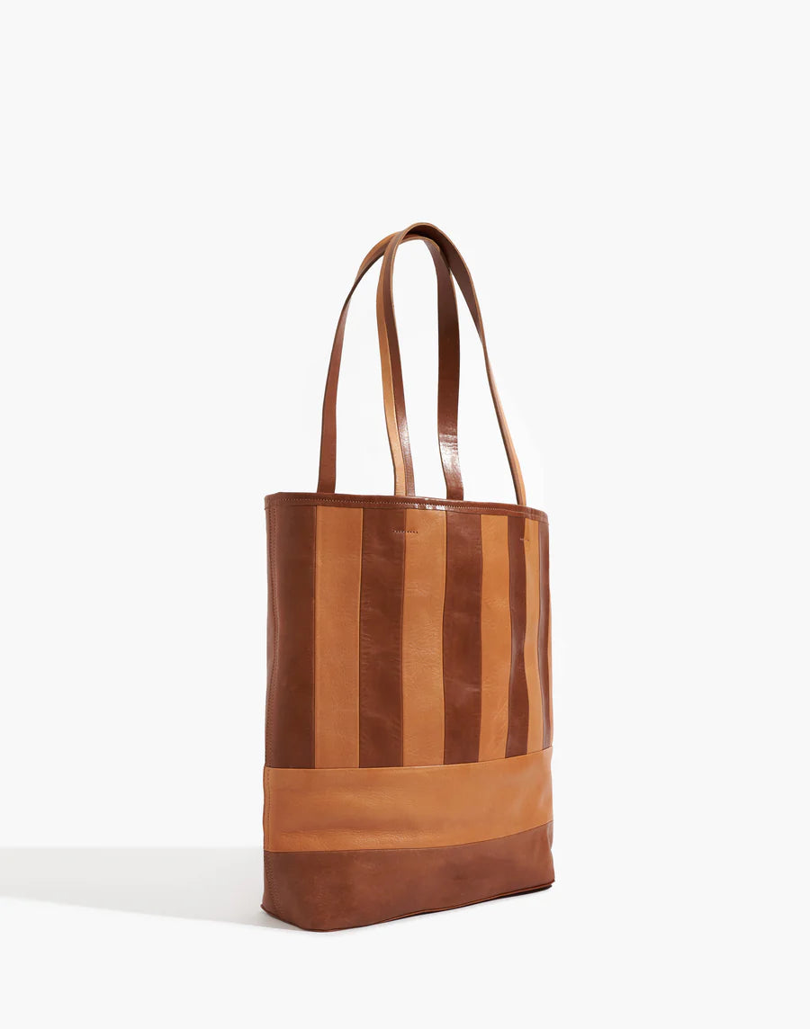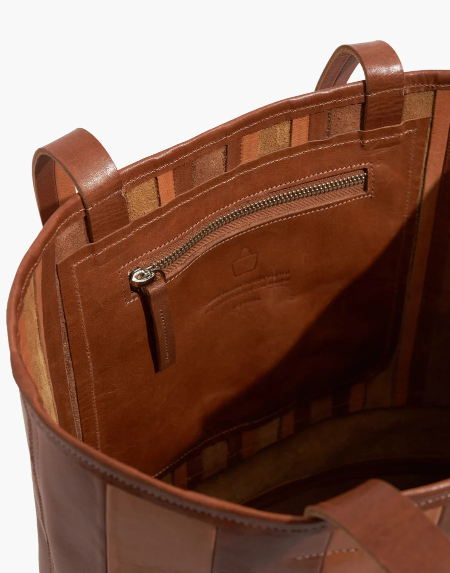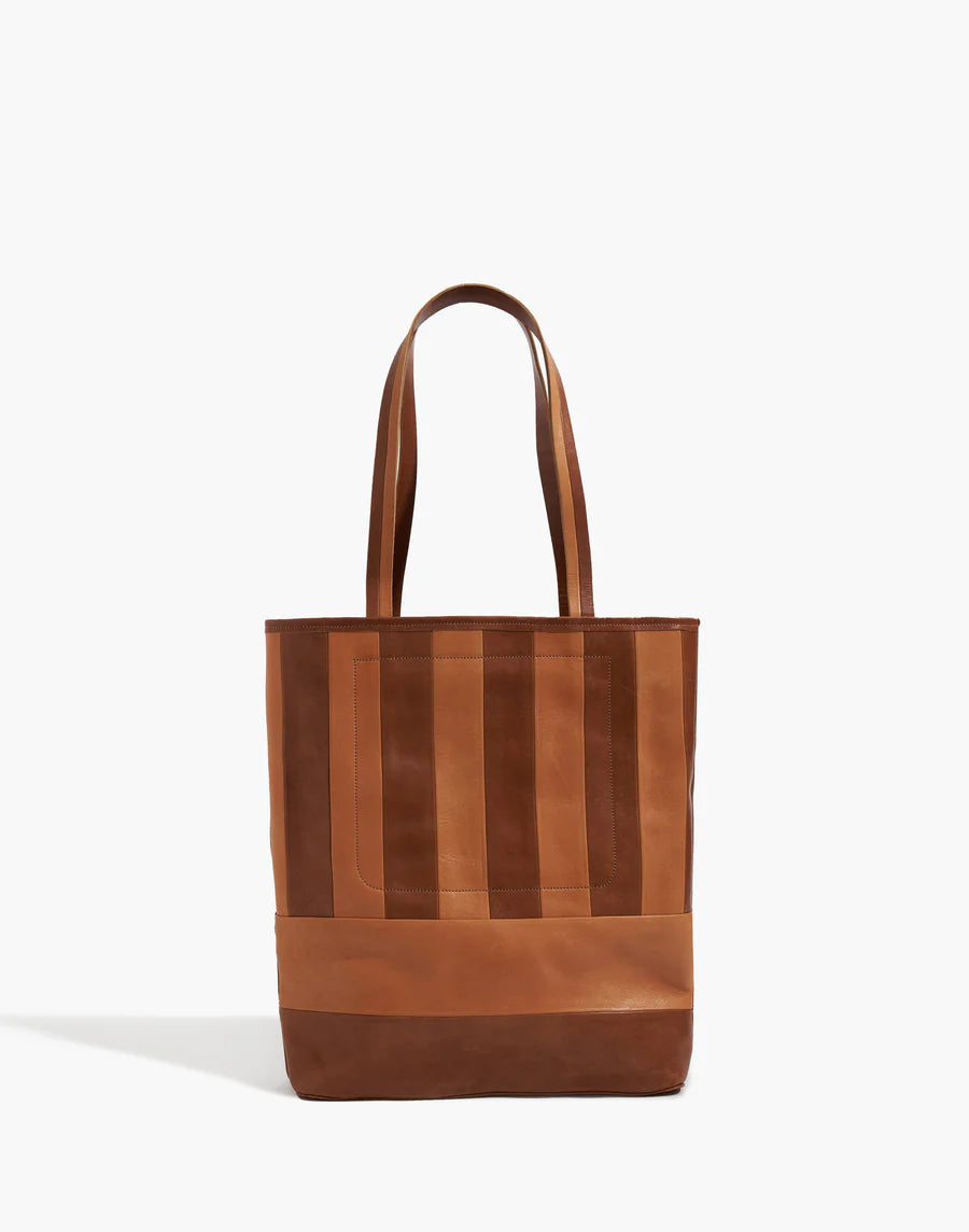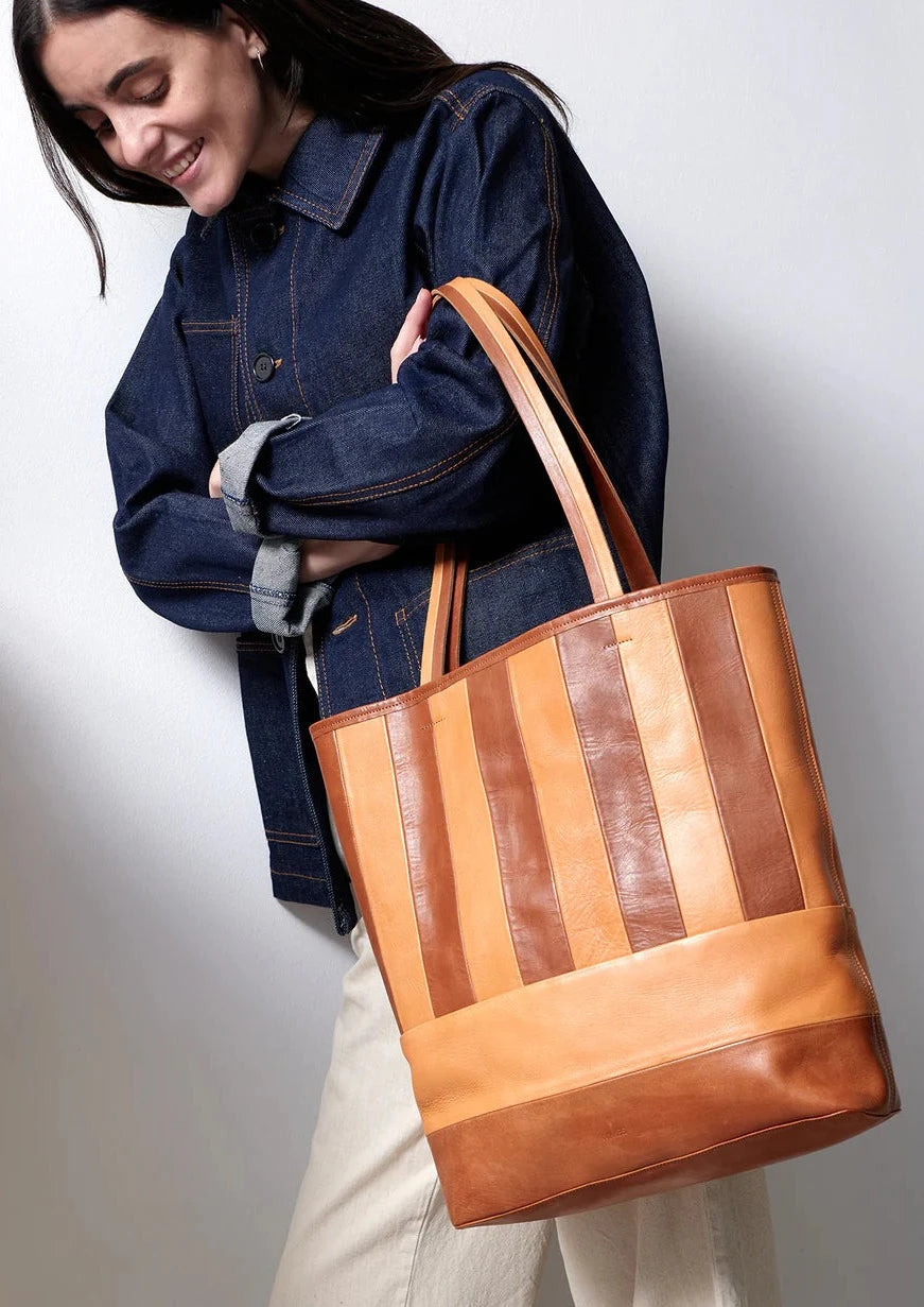 Beautiful and unique, this large tote features a two toned striped pattern in a smooth natural vegetable tanned leather. One internal zippered pocket.