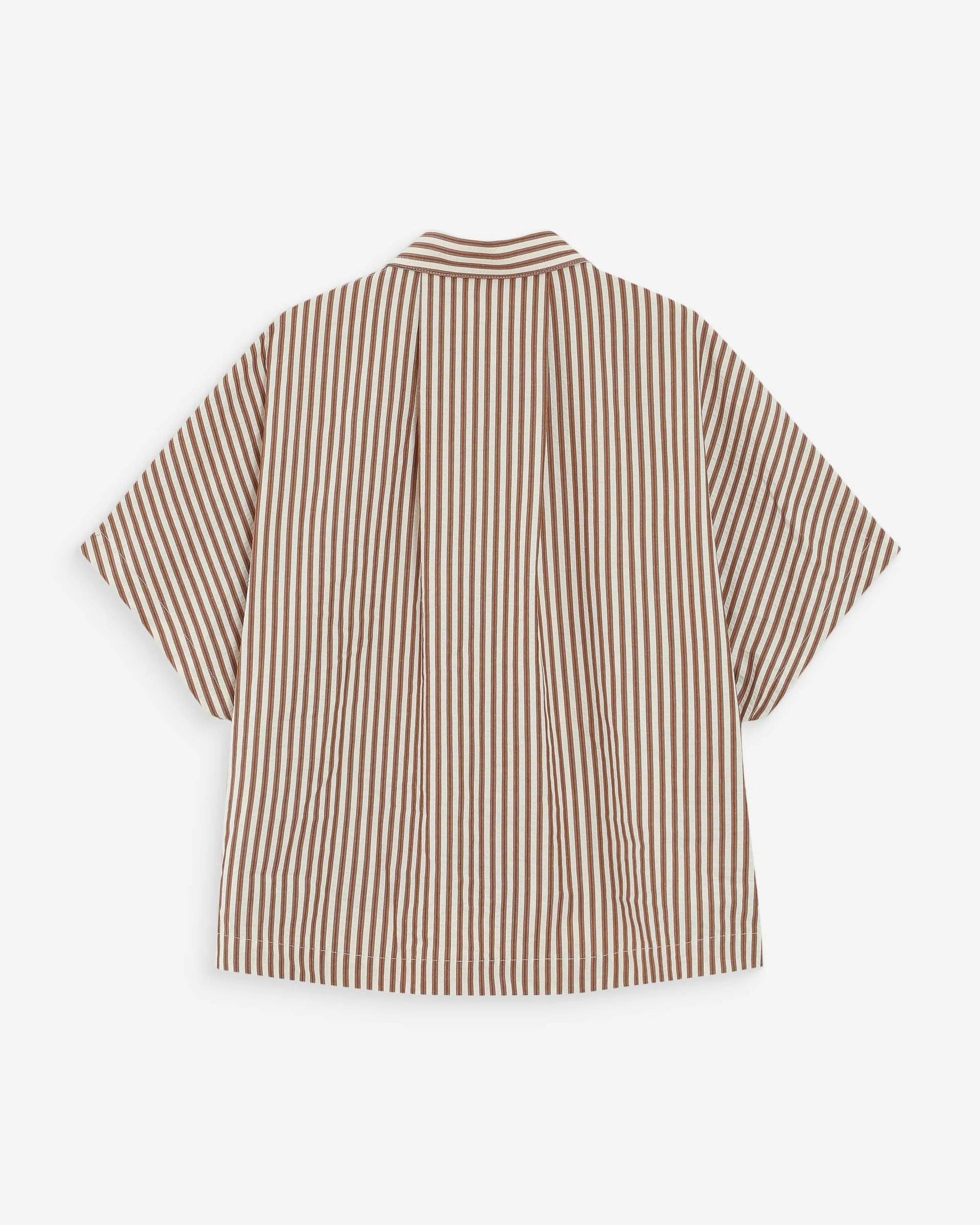 This shirt features a loose fit with short sleeves. Its classic collar and patch pocket on the left chest make it an essential piece in your wardrobe.