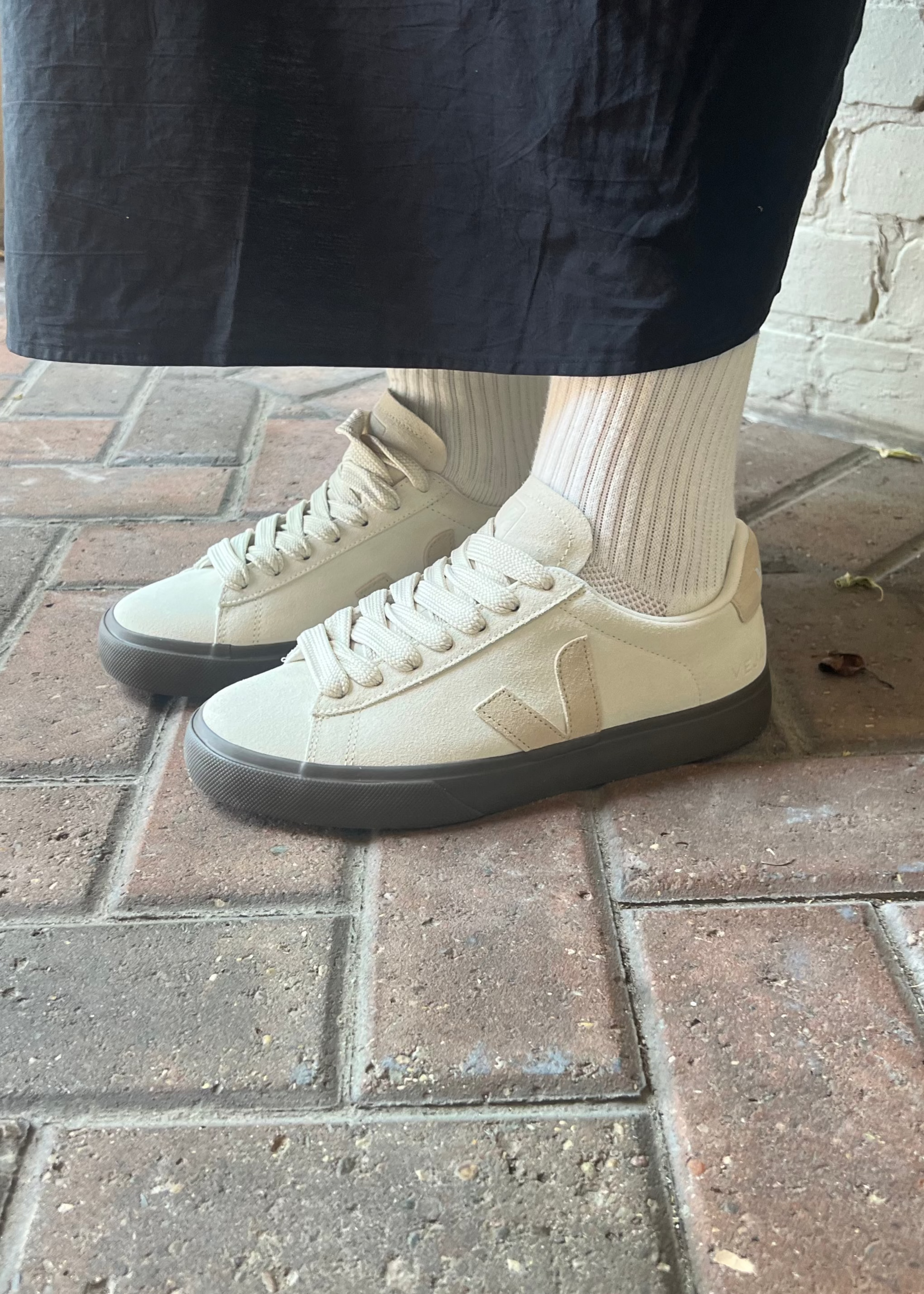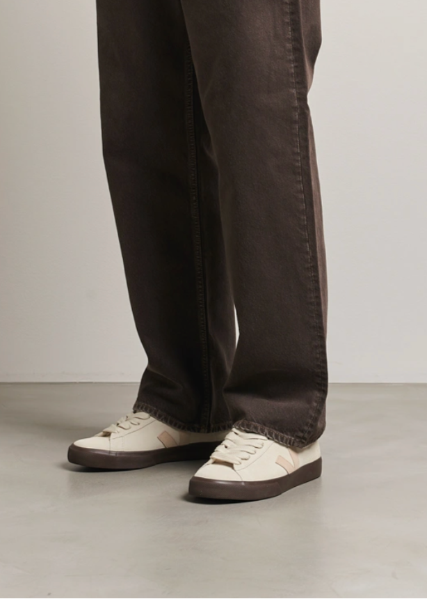 Suede is the underside of leather, sanded to give it a soft and smooth feel. It comes from farms in the Rio Grande do Sul region and is tanned in Brazil without harmful or prohibited chemicals. VEJA uses dyes that meet regulations and prioritizes responsible water use during the tanning process. This suede is then coated with PFC-free water-repellent oils to shield the sneakers from light rain.