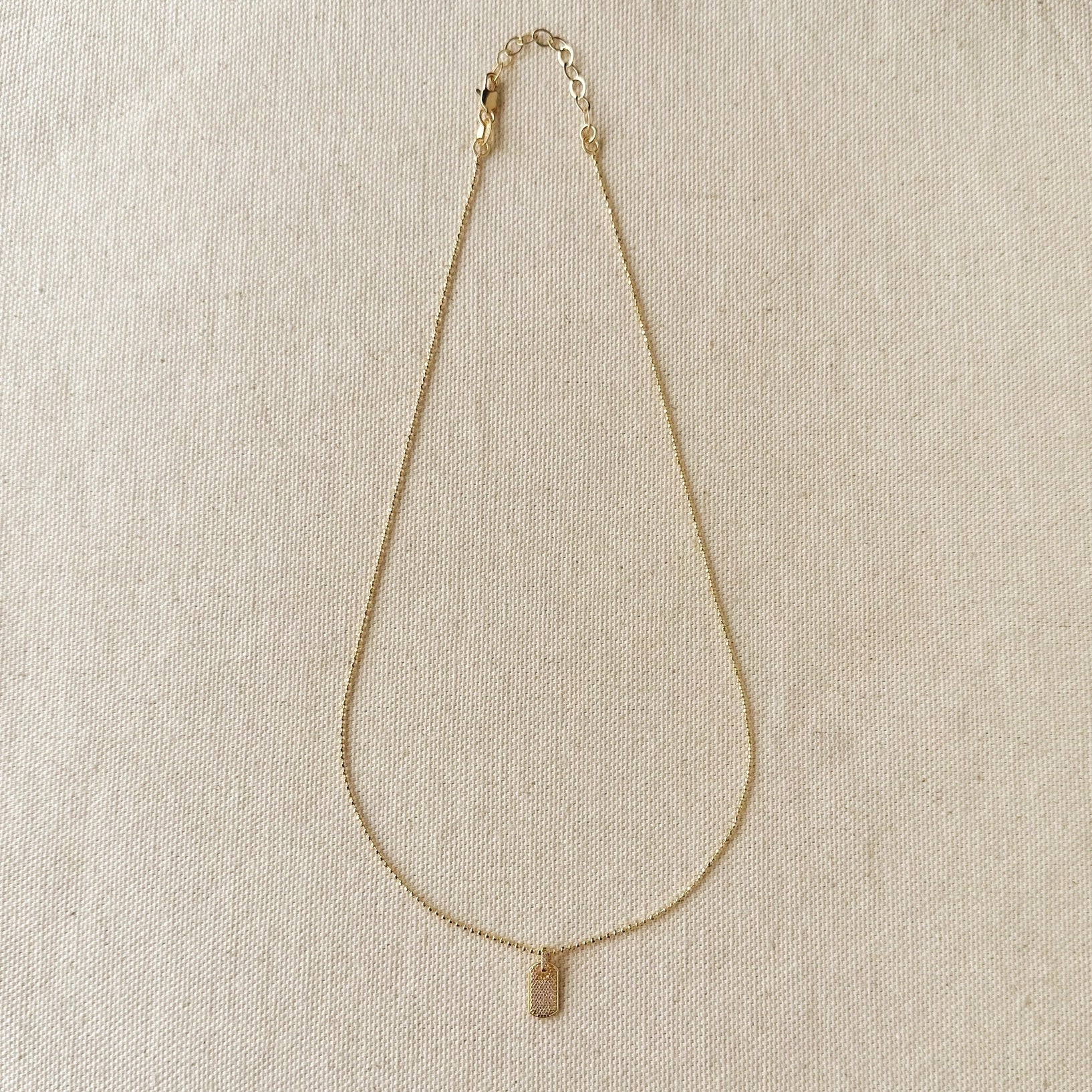 18k Gold Filled Mini Dog Tag Necklace featuring micro Cubic Zirconia Stones Modernize your look with this stunning 18k Gold Filled Mini Dog Tag Necklace! Its sleek and minimalist design exudes sophistication and style, making it an essential addition to your collection.