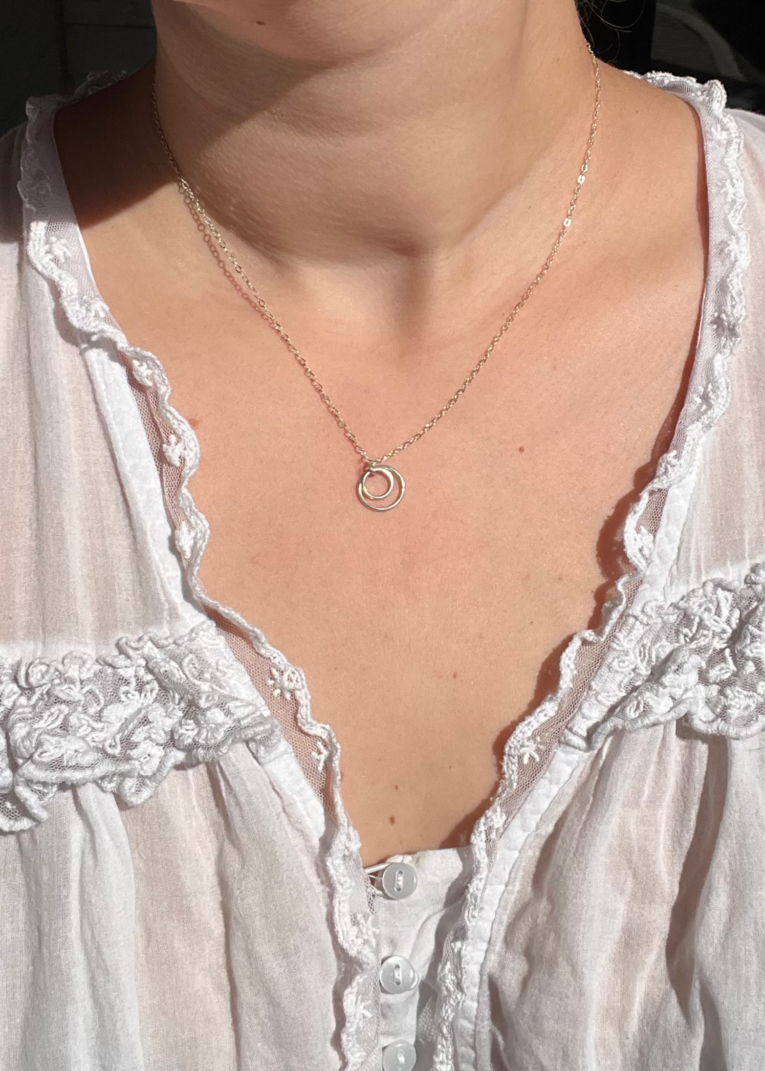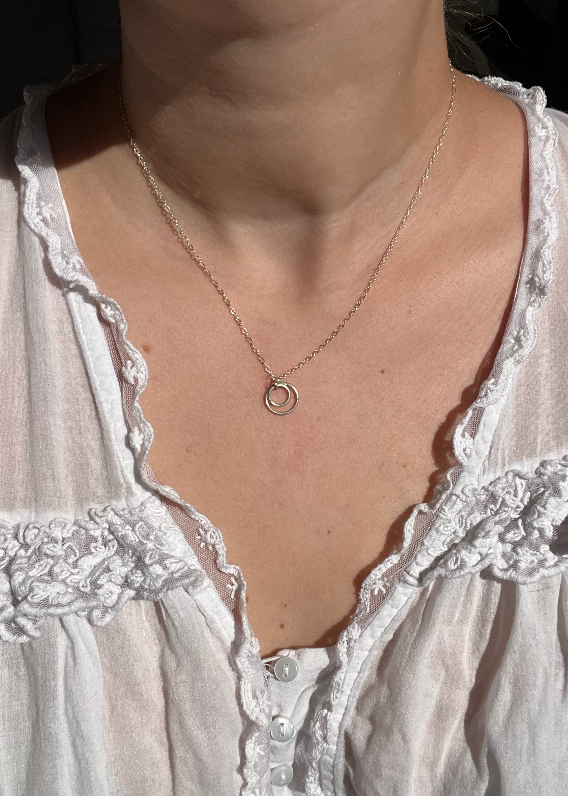 The Eclipse Necklace features two lightly hammered circles suspended on a delicate chain.