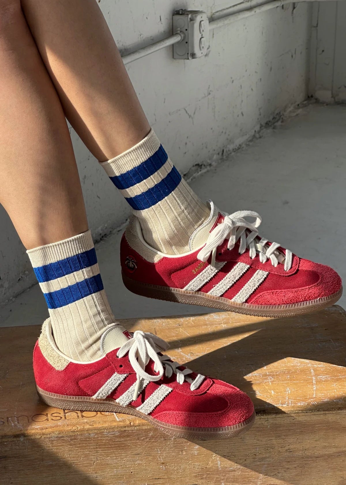 A bold varsity stripe is timeless and always a classic. Her Varsity Socks is a varsity striped style that is classically ribbed, perfect height, cotton blend durable, chic go to socks. Add an understated sporty touch to any look. Style with a mini skirt, plaids, and oversized cable knit sweaters.