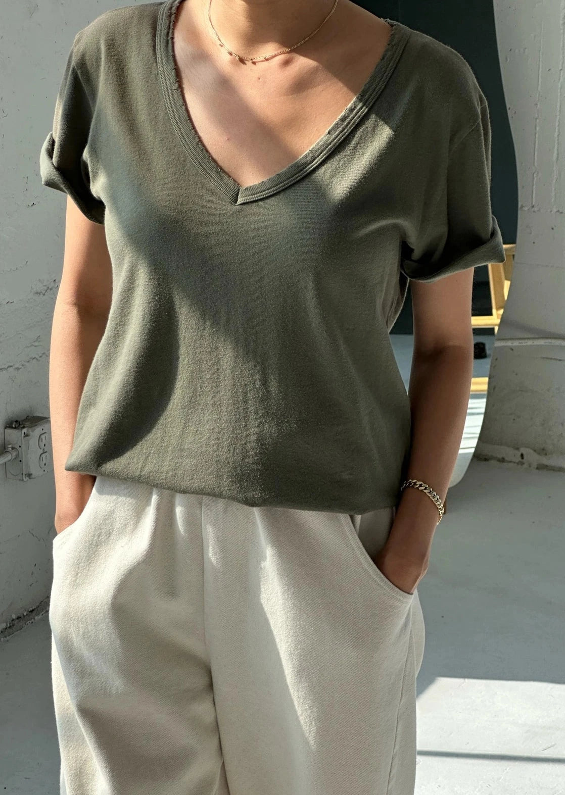 This V-neck tee shirt features an ideal V-neck, seemingly so simple but actually so hard to get right. It is gently distressed for that gorgeous vintage look but without the smell, and has the most flattering relaxed fit.