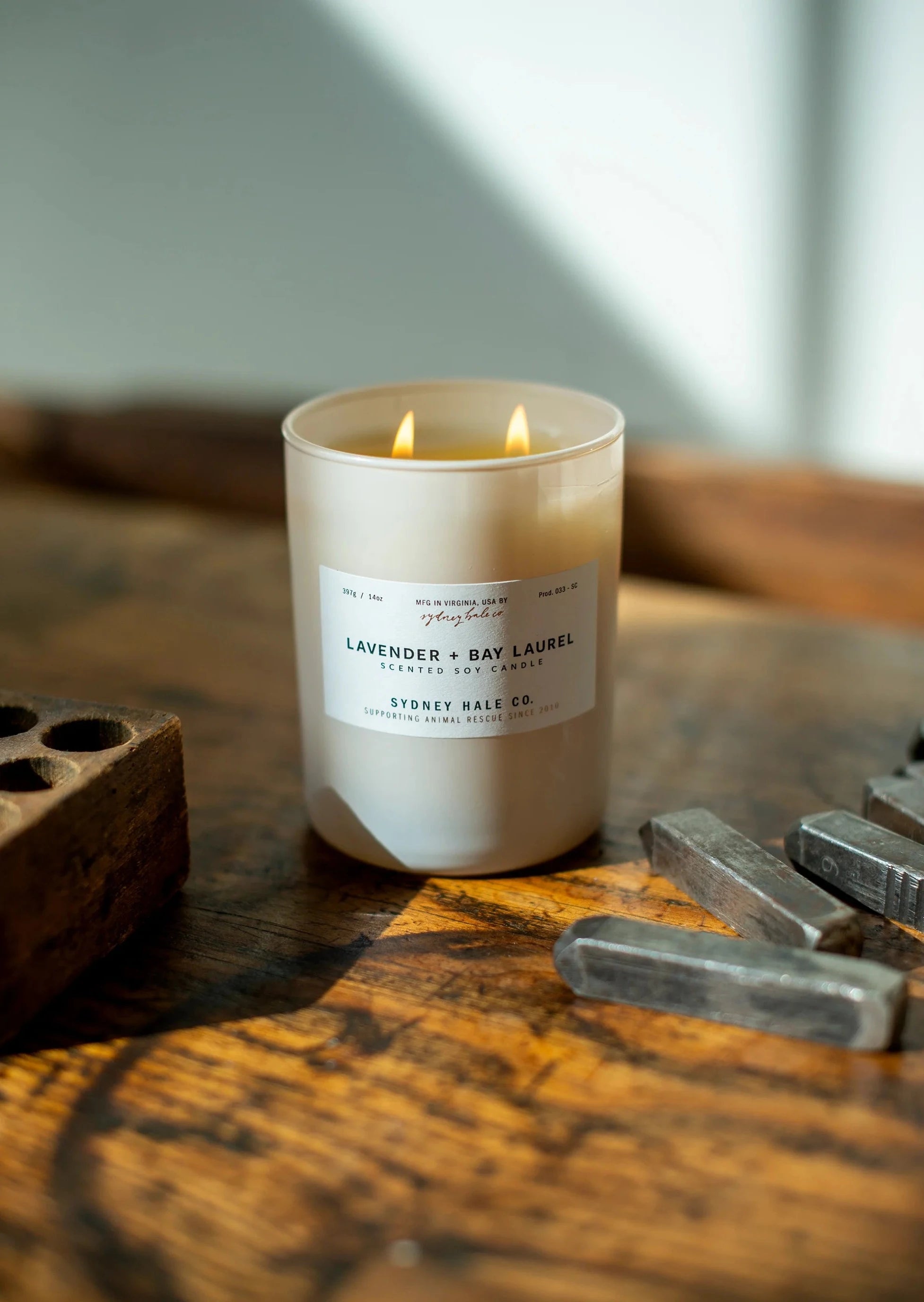 A handmade premium soy wax blend candle with a double cotton wick in a glass jar. Herbal and bright scent in its signature with lavender, bay laurel, lemon + cedar.