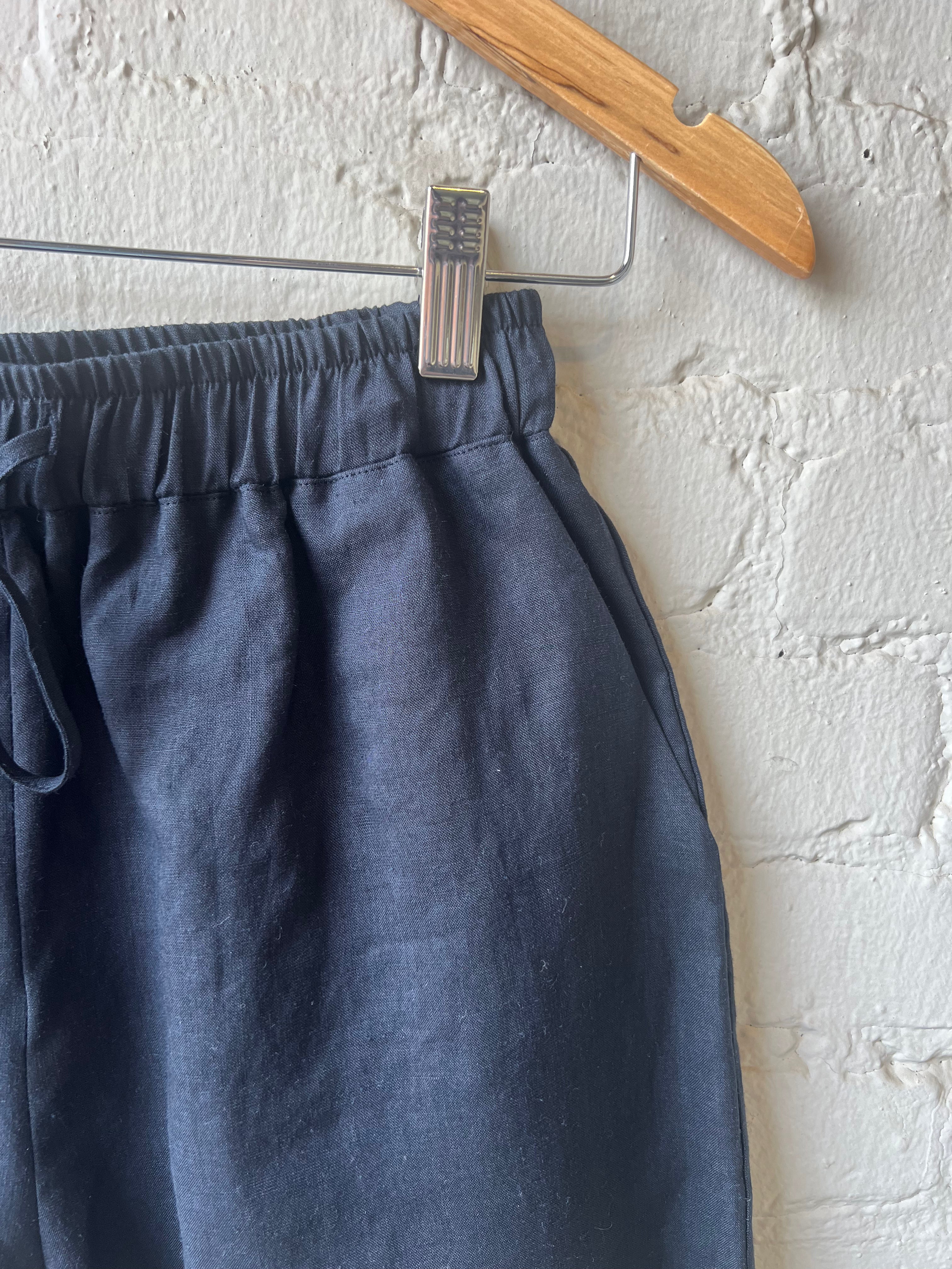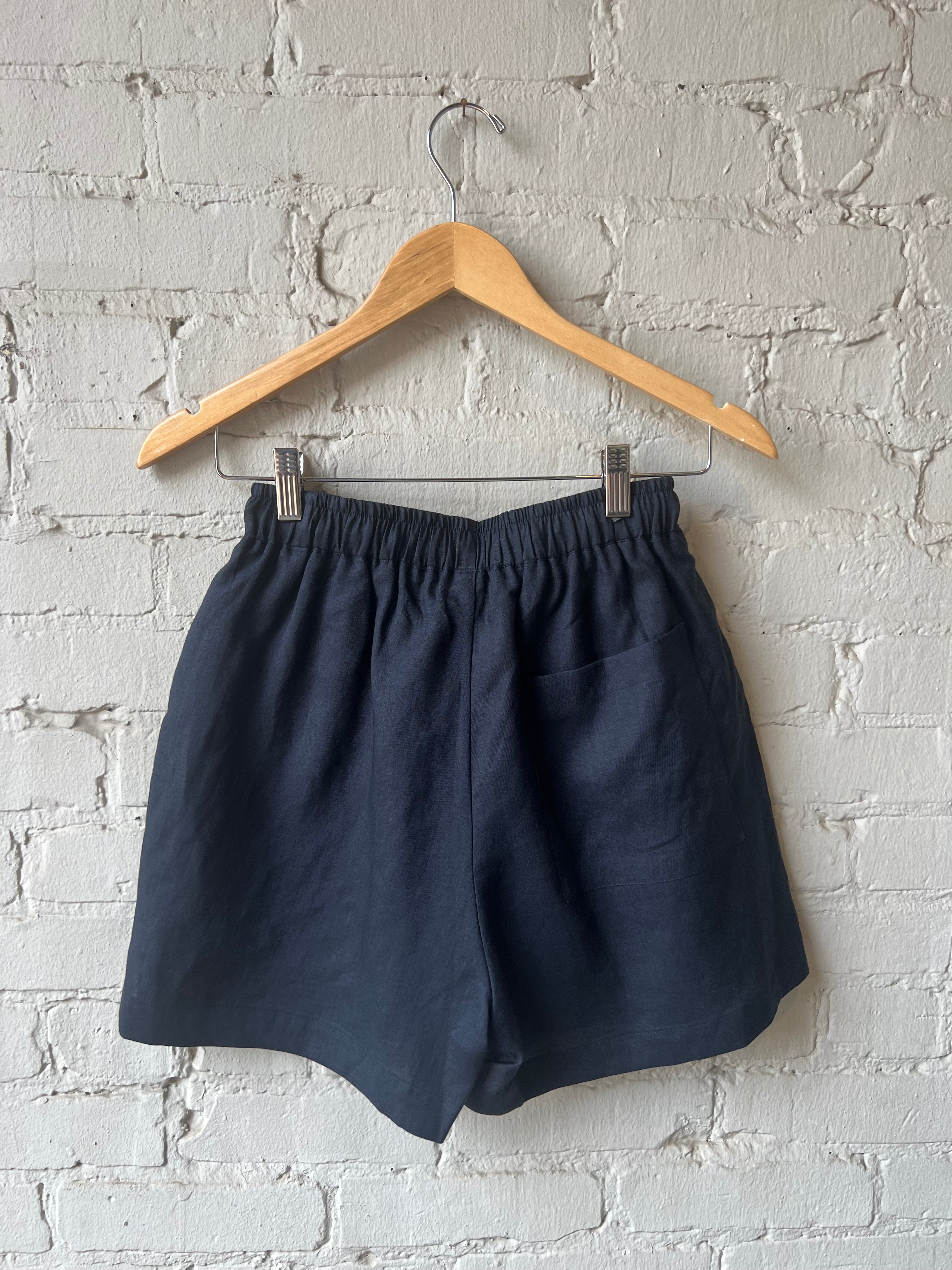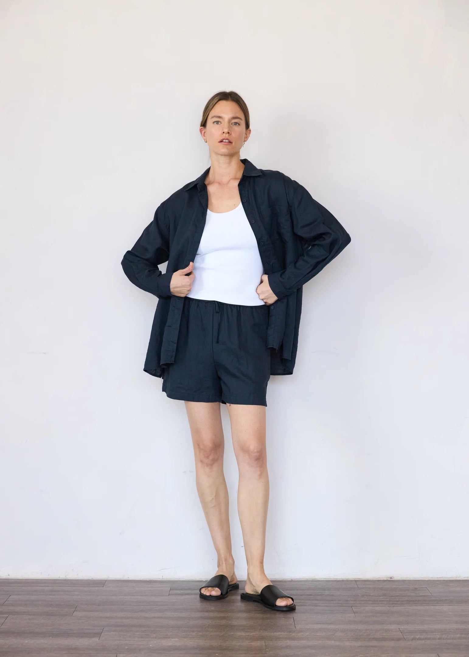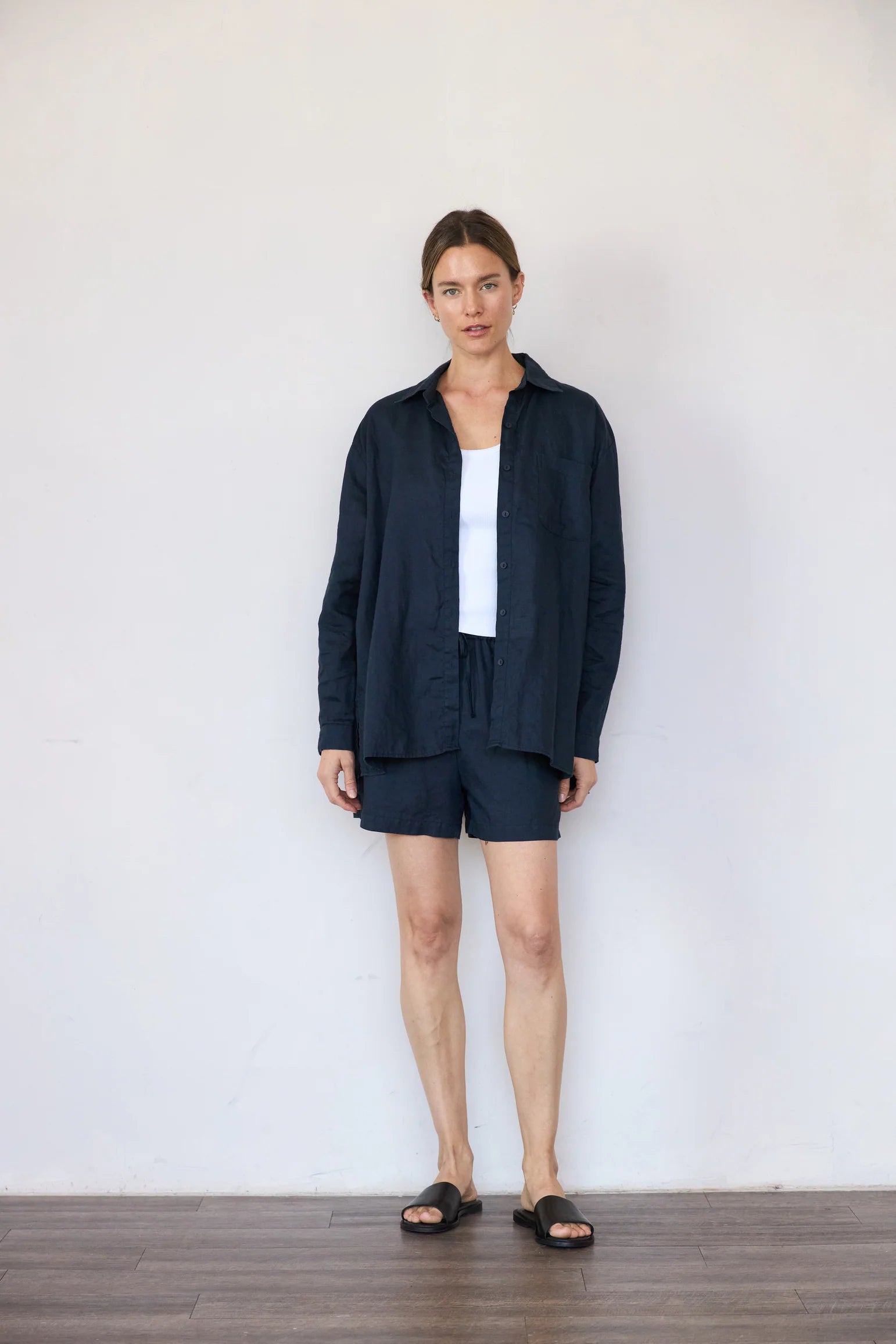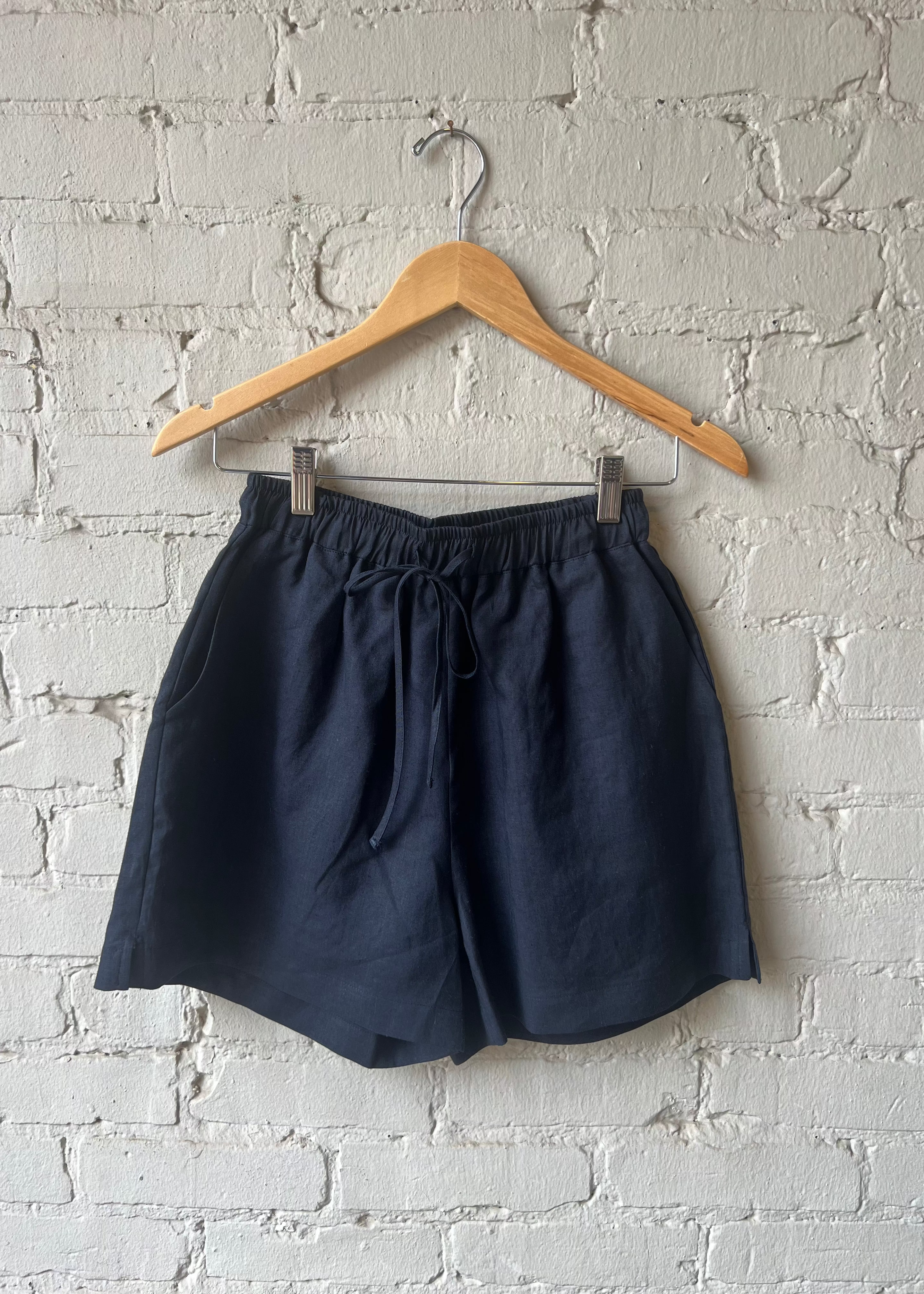 Expertly crafted with a relaxed fit, these navy linen shorts feature an elastic waist and side seam pockets for ultimate comfort and convenience. Perfect for a day at the beach or a casual outing, these versatile shorts are an essential addition to any summer wardrobe.