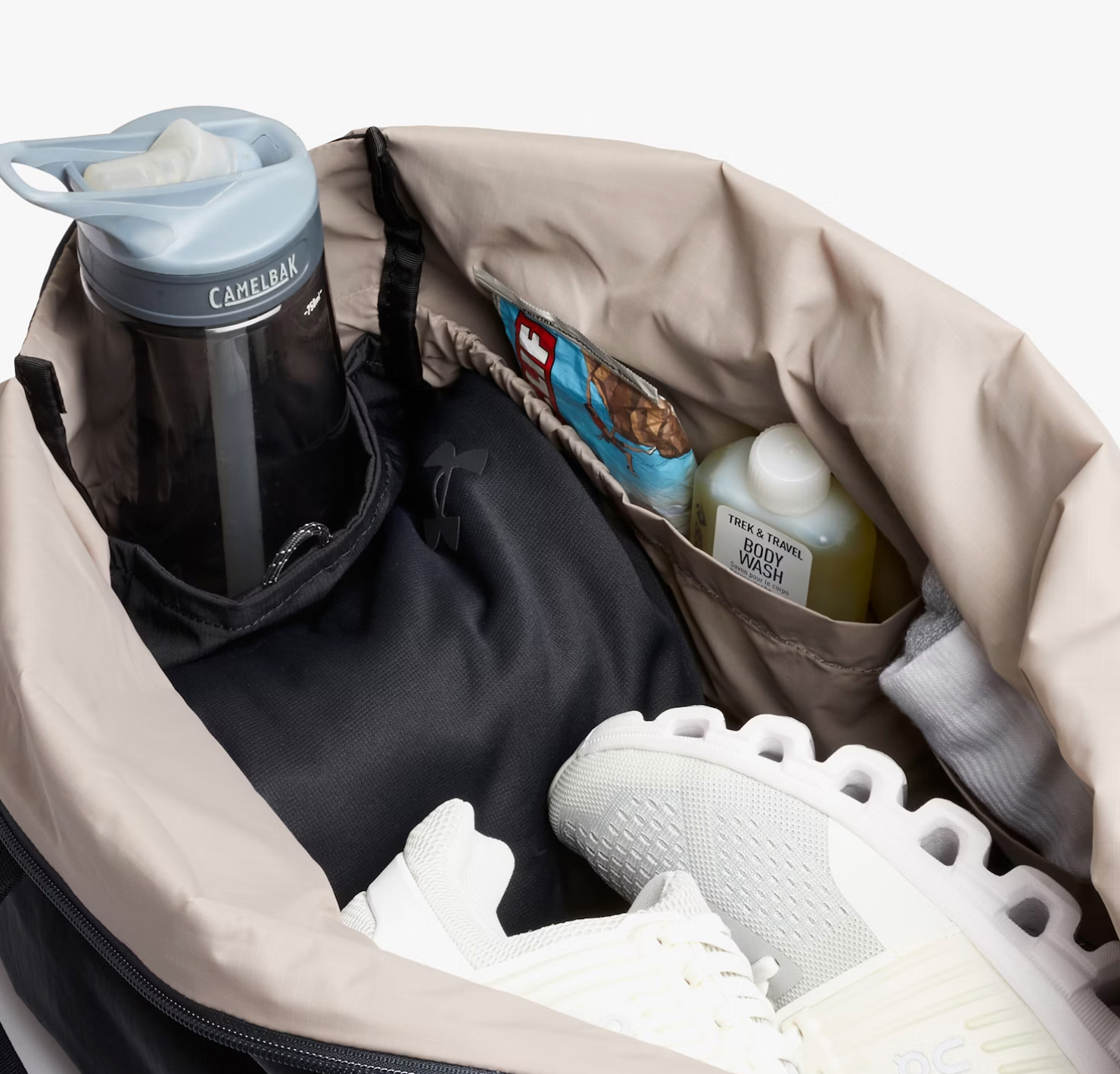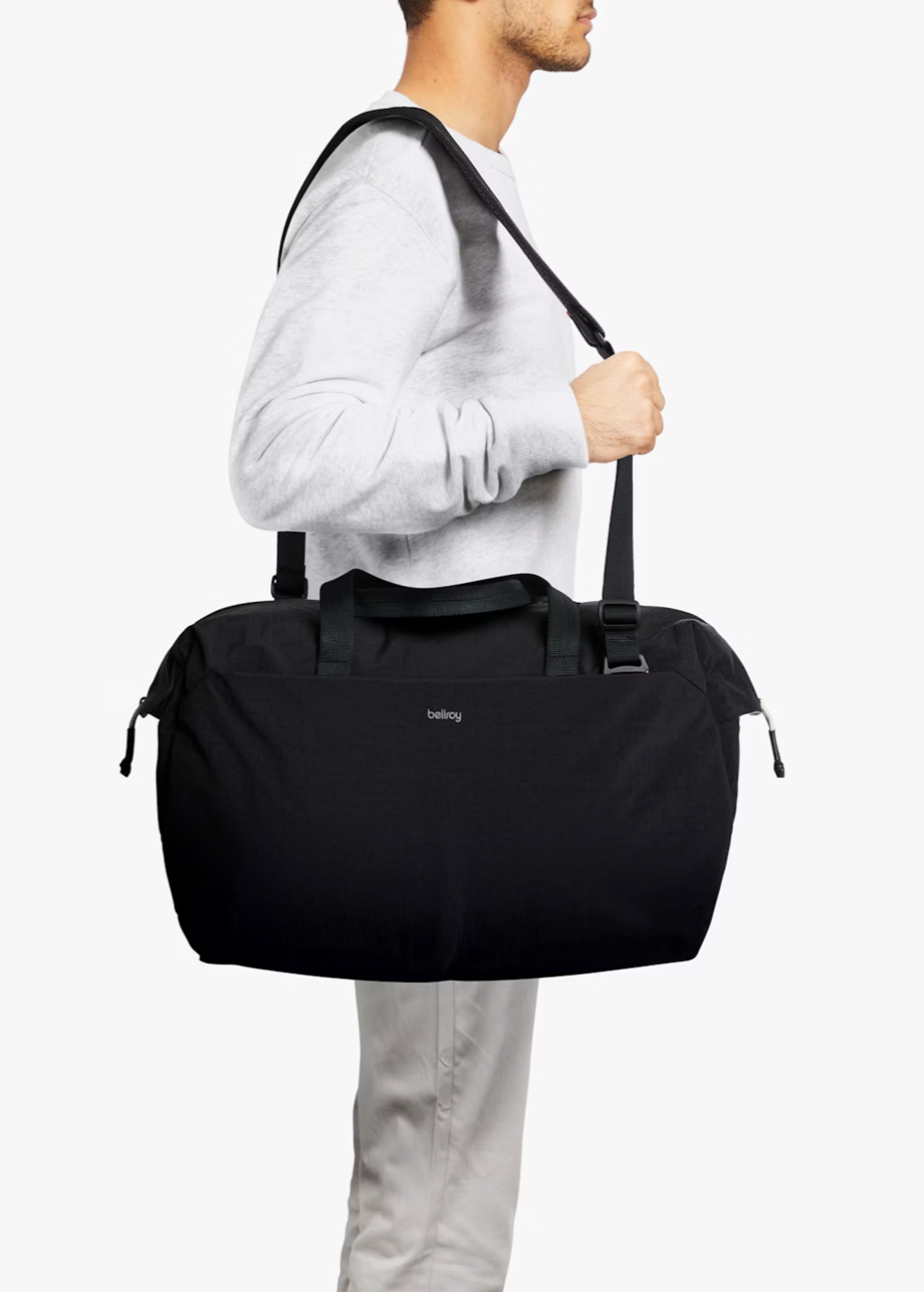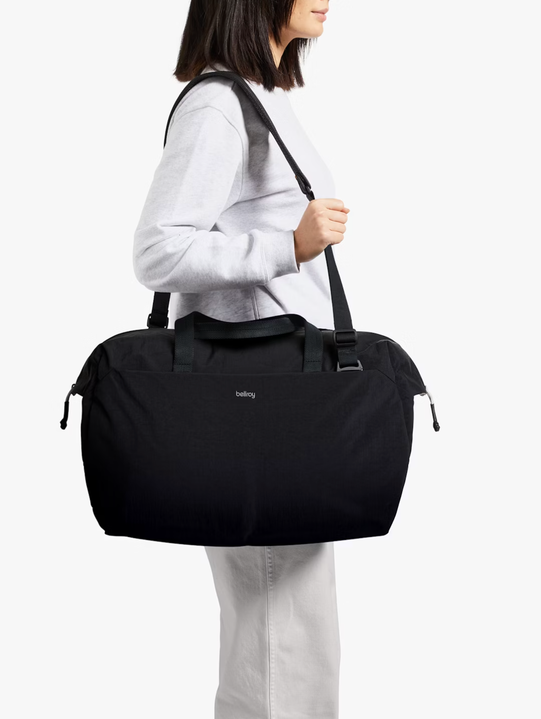 The Lite Duffel in Black is perfect for travel and play. With ultralight ripstop fabric and a reinforced rim, it's durable and easy to pack. The spacious main compartment and multiple zip and slip pockets provide convenient organization. The adjustable shoulder strap and grab handles make for easy carrying. Water-resistant zipper with easy-grab pulls.