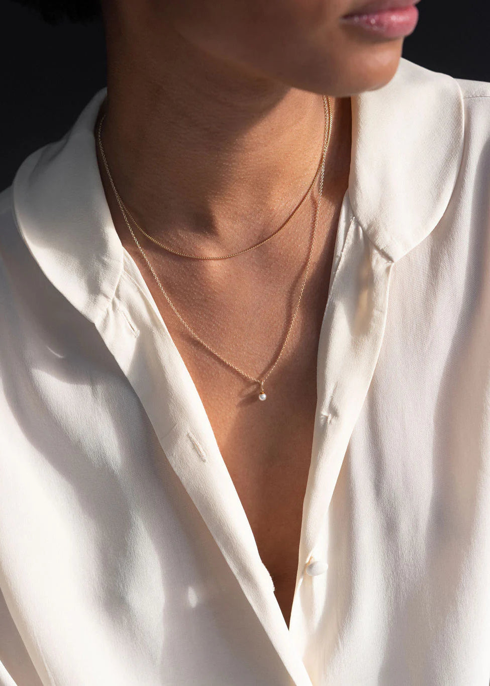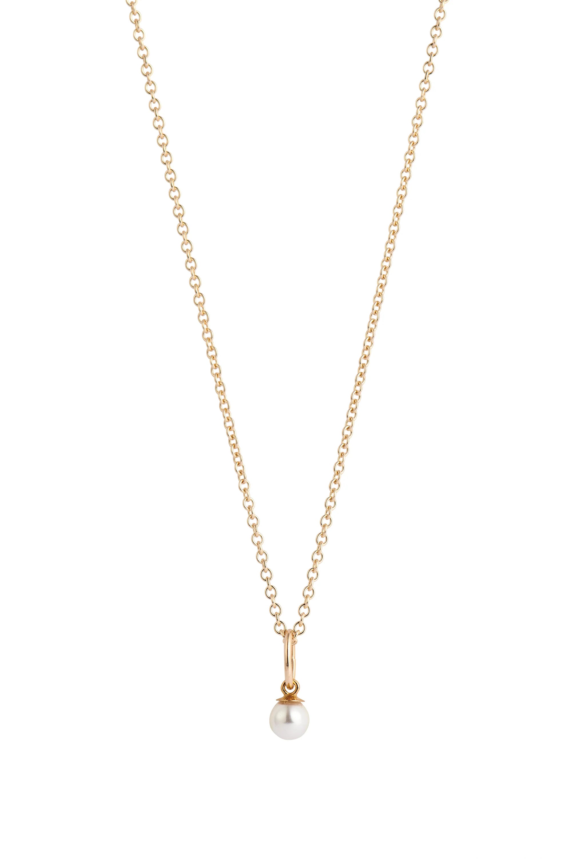 Liv Necklace features a petite Crystal Pearl drop hanging from a 1.2mm rounded Cable Chain in 14k Gold Filled. The Liv Necklace is a delicate, minimal piece perfect for every day and is easily buildable as a layering necklace.