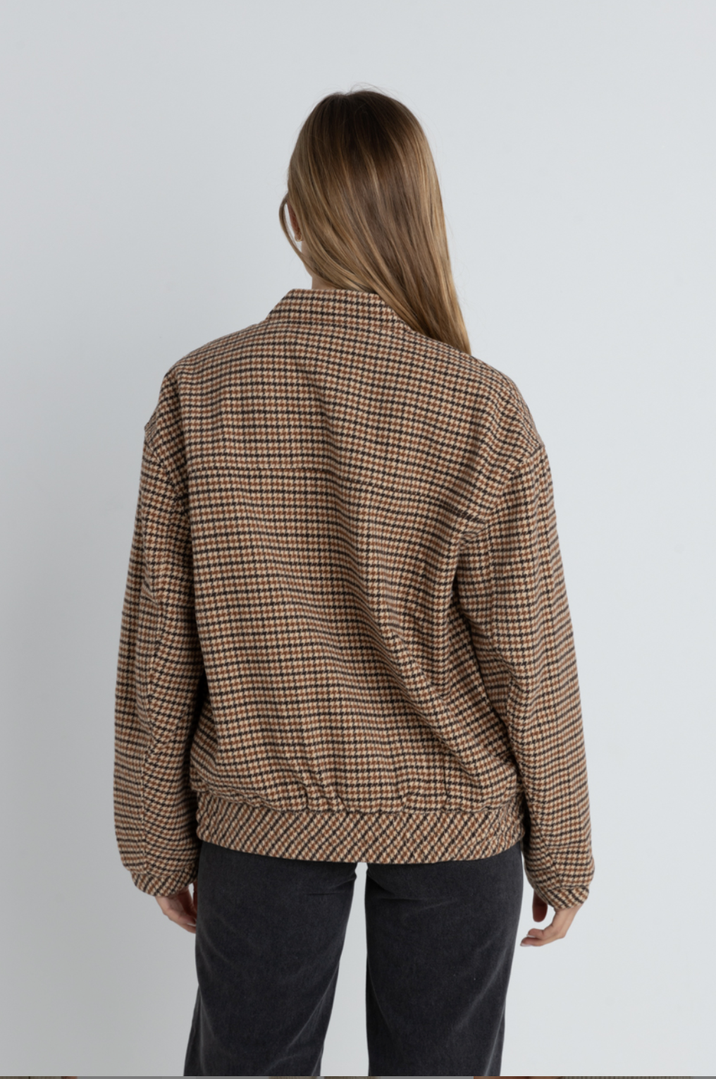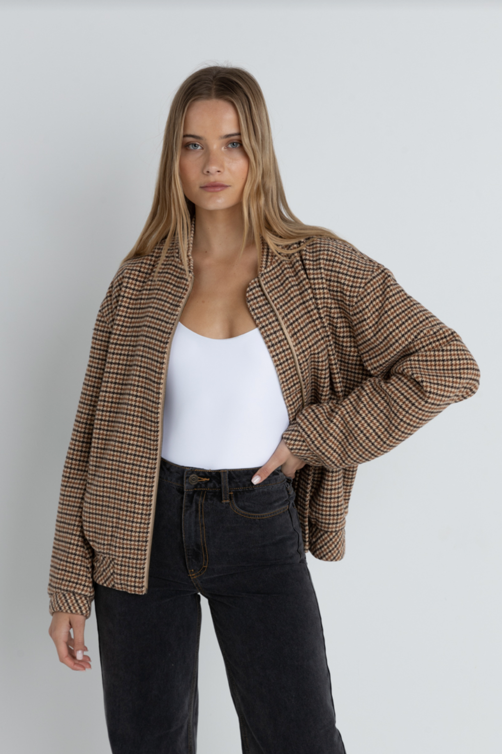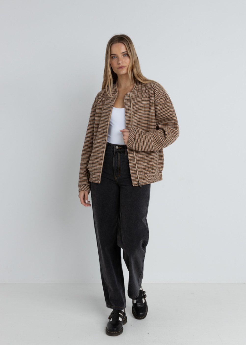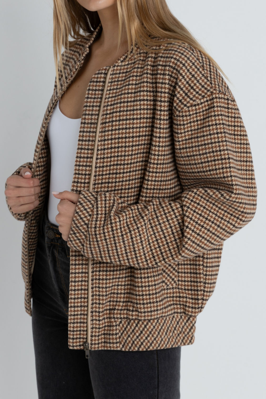 The Luca Oversized Check Bomber Jacket fuses an iconic silhouette with a modern twist. Made from a wool-polyester blend with houndstooth tweed fabric, it features an oversized fit, banded stand-up collar, and zipper front closure. A cosy yet stylish option for those creative outings on cooler days.