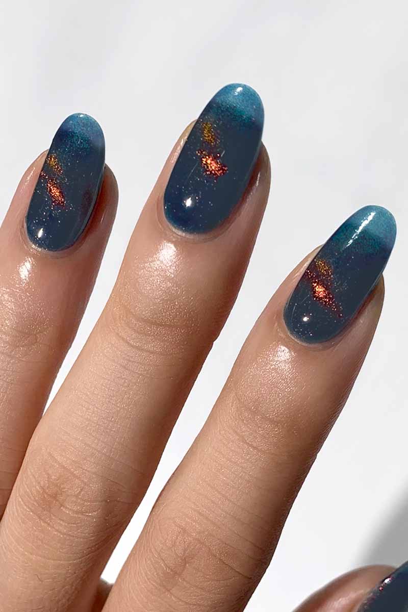 Castle in the Sky is a deep sea teal blue nail polish with red-bronze-gold-green multichrome pigment.